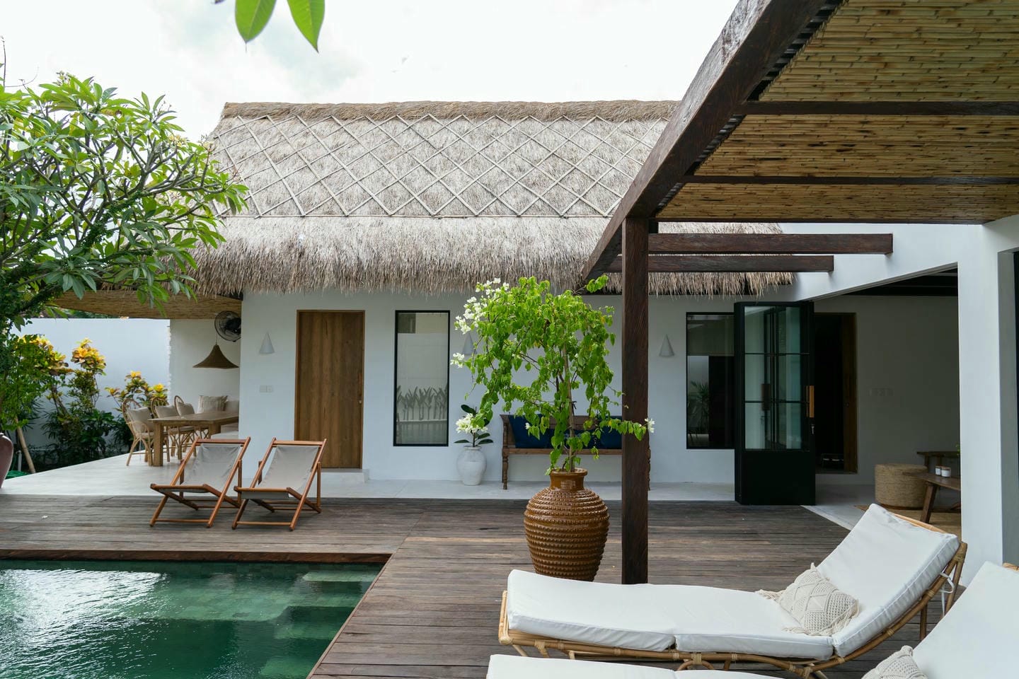 Modern villa patio with pool and lounge chairs.