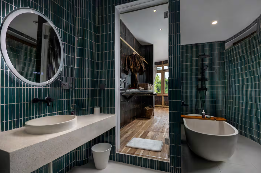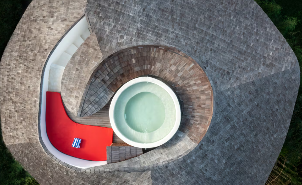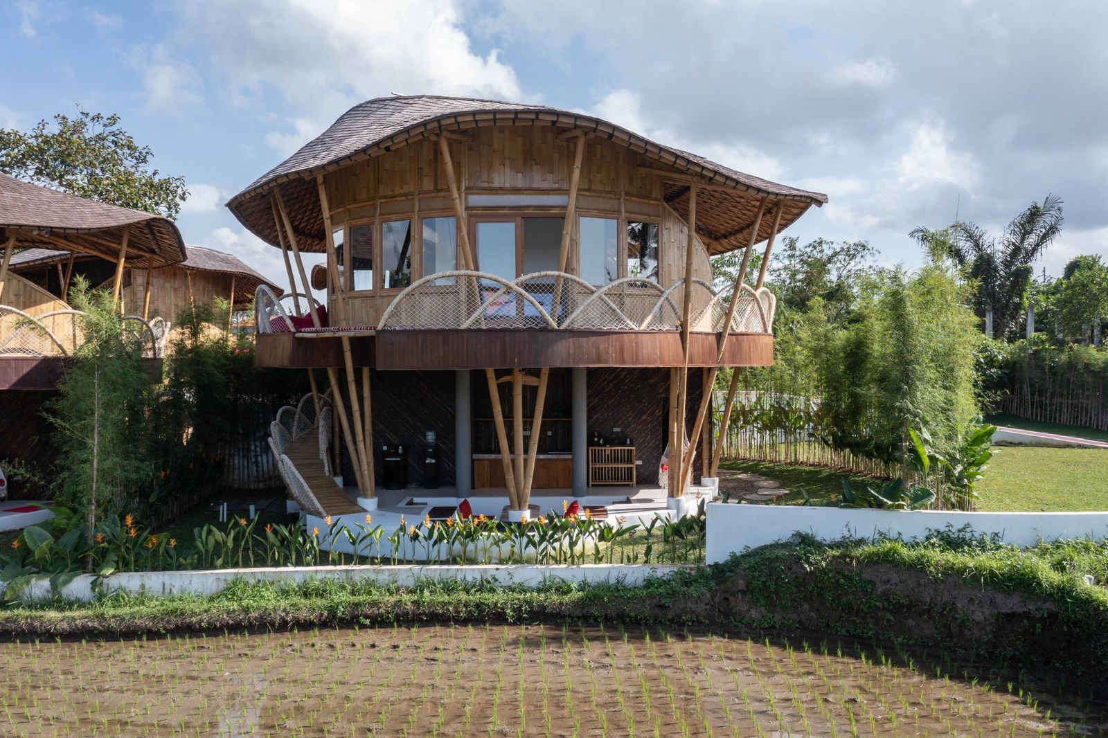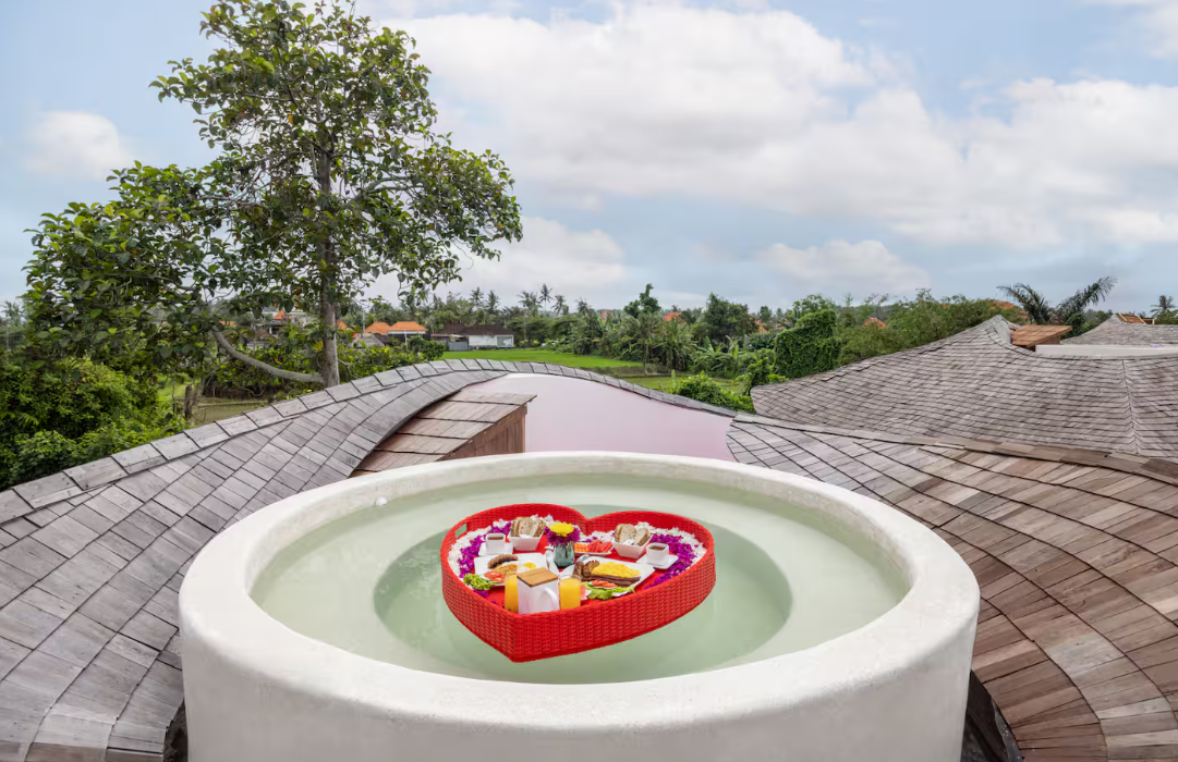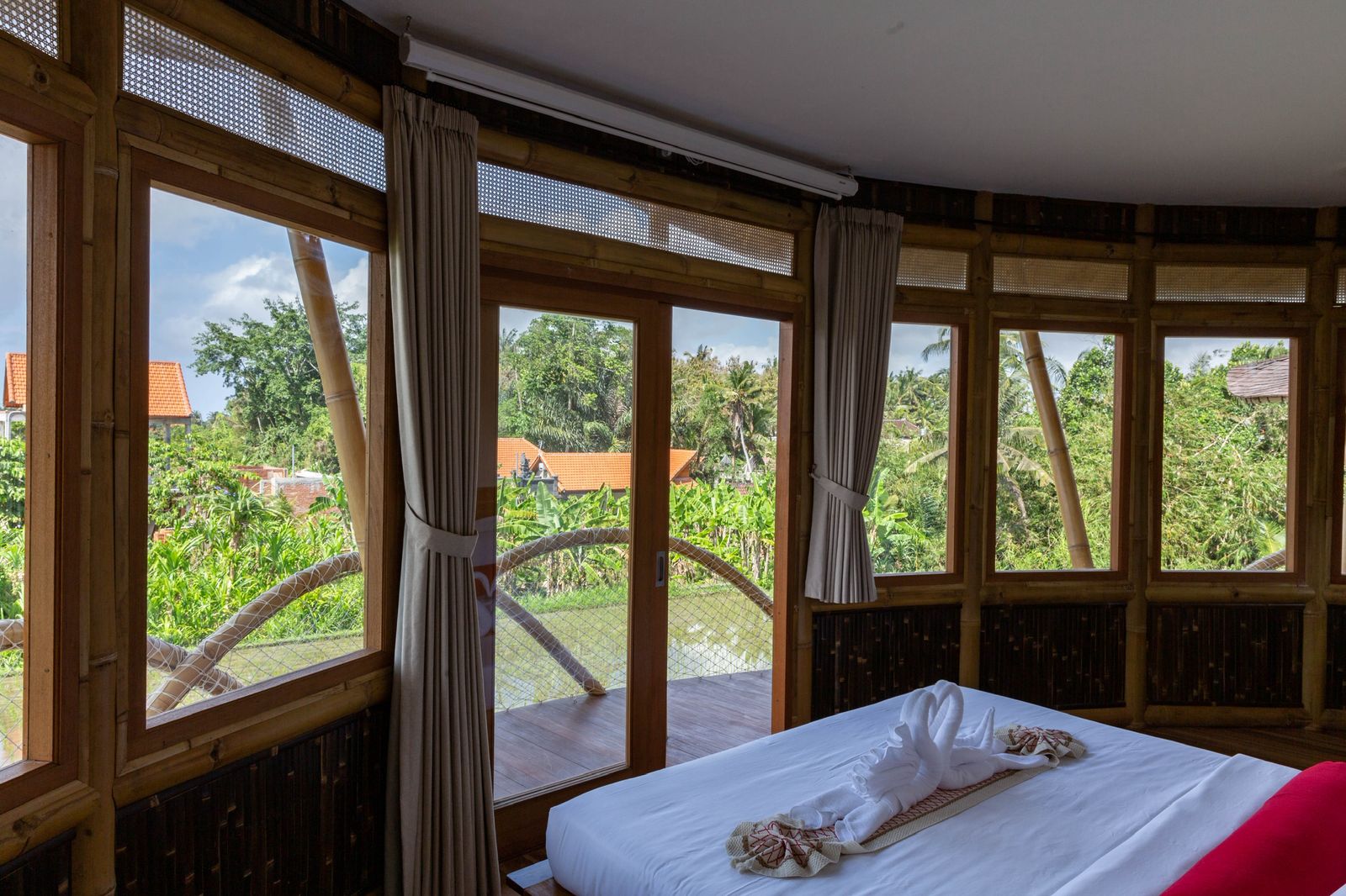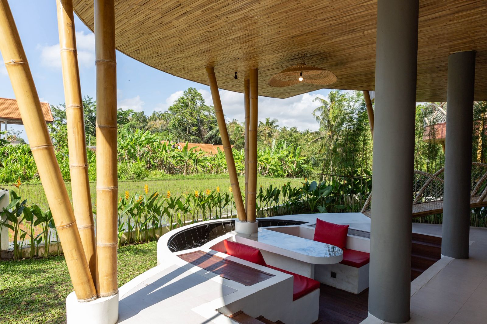 Outside, guests can unwind by the plunge pool on the rooftop surrounded by tropical greenery, with captivating jungle and rice field views that elevate the sense of tranquility.