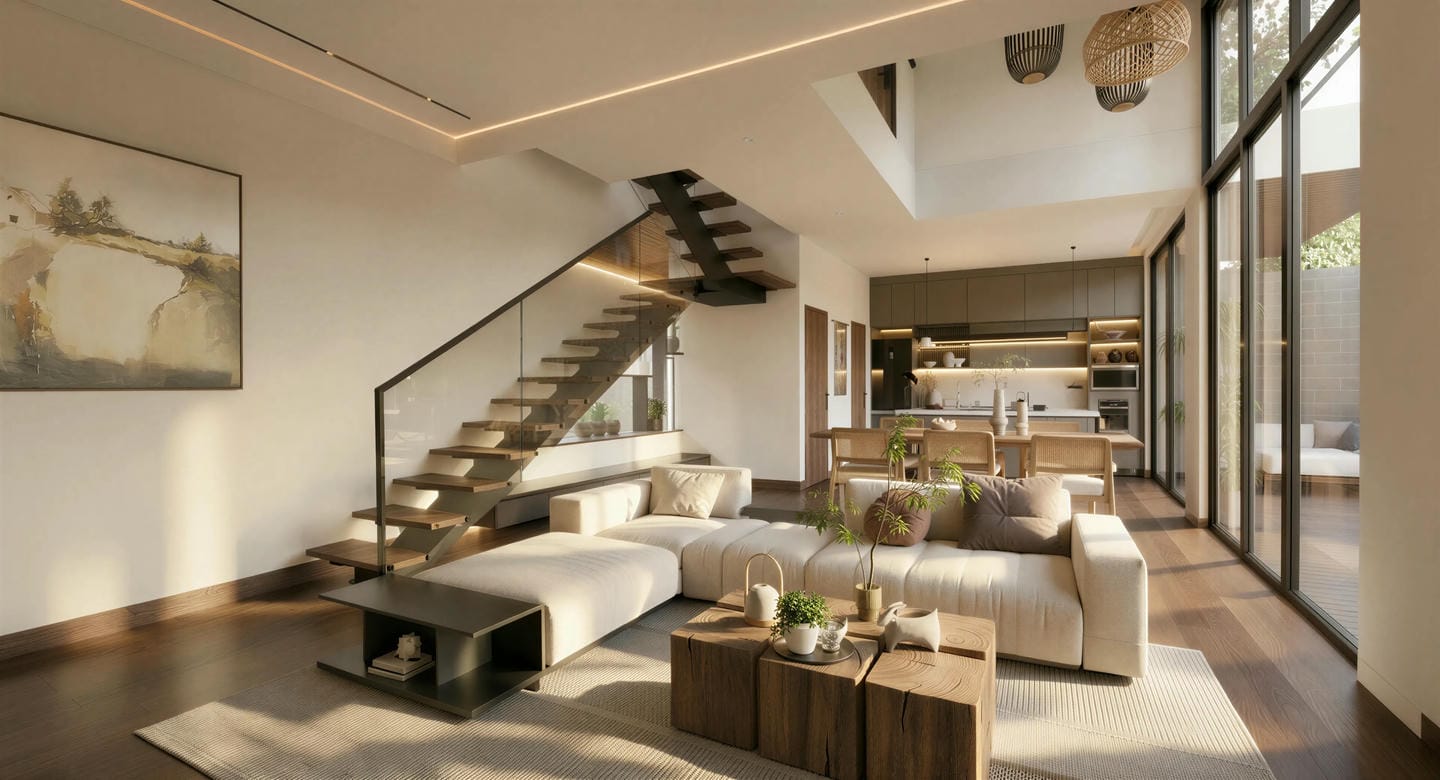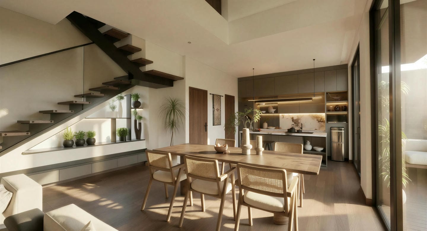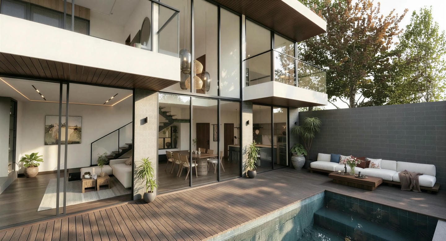 Designed semi-furnished, the villa spans two storeys and features two spacious bedrooms with private ensuite bathrooms, plus an additional guest bathroom. Its open-plan layout includes large windows that fill the space with natural light and create a seamless connection between indoor and outdoor areas. At the heart of the home lies a cozy living area, a modern fully equipped kitchen, and a comfortable dining space.