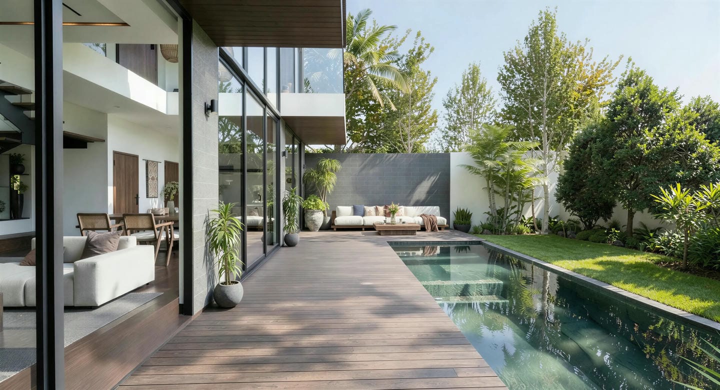 Outdoors, the villa features a spacious private garden with lush green lawns, an expansive Ulin wood pool deck, and a comfortable seating area perfect for enjoying Bali’s tropical lifestyle, with optional features such as a sauna and ice bath for added luxury.