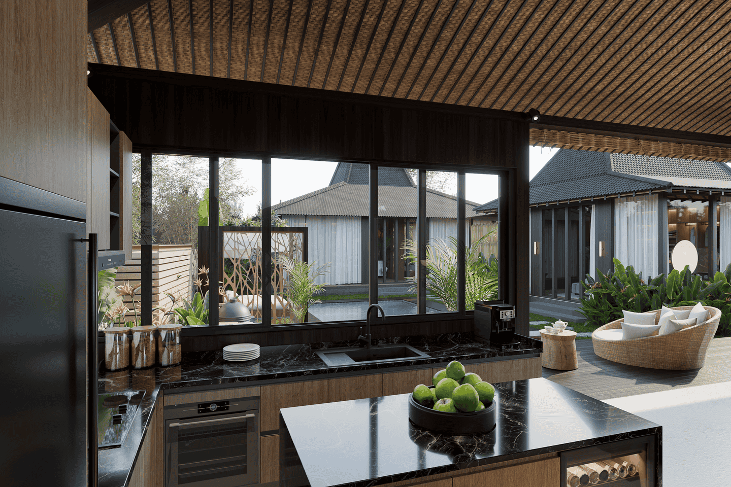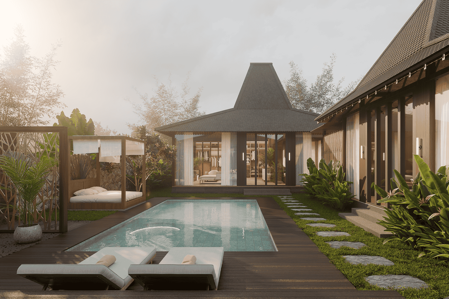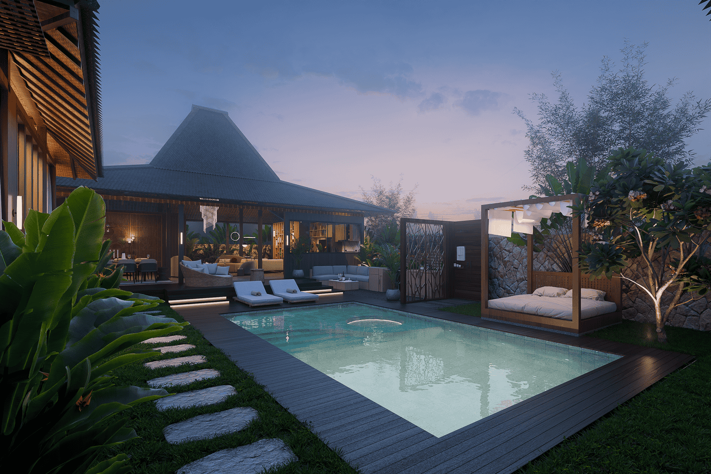 Step outside to a welcoming private swimming pool, complete with a cabana, lounge chairs, and a BBQ area. The pool is surrounded by lush tropical greenery, creating a serene and relaxing atmosphere.