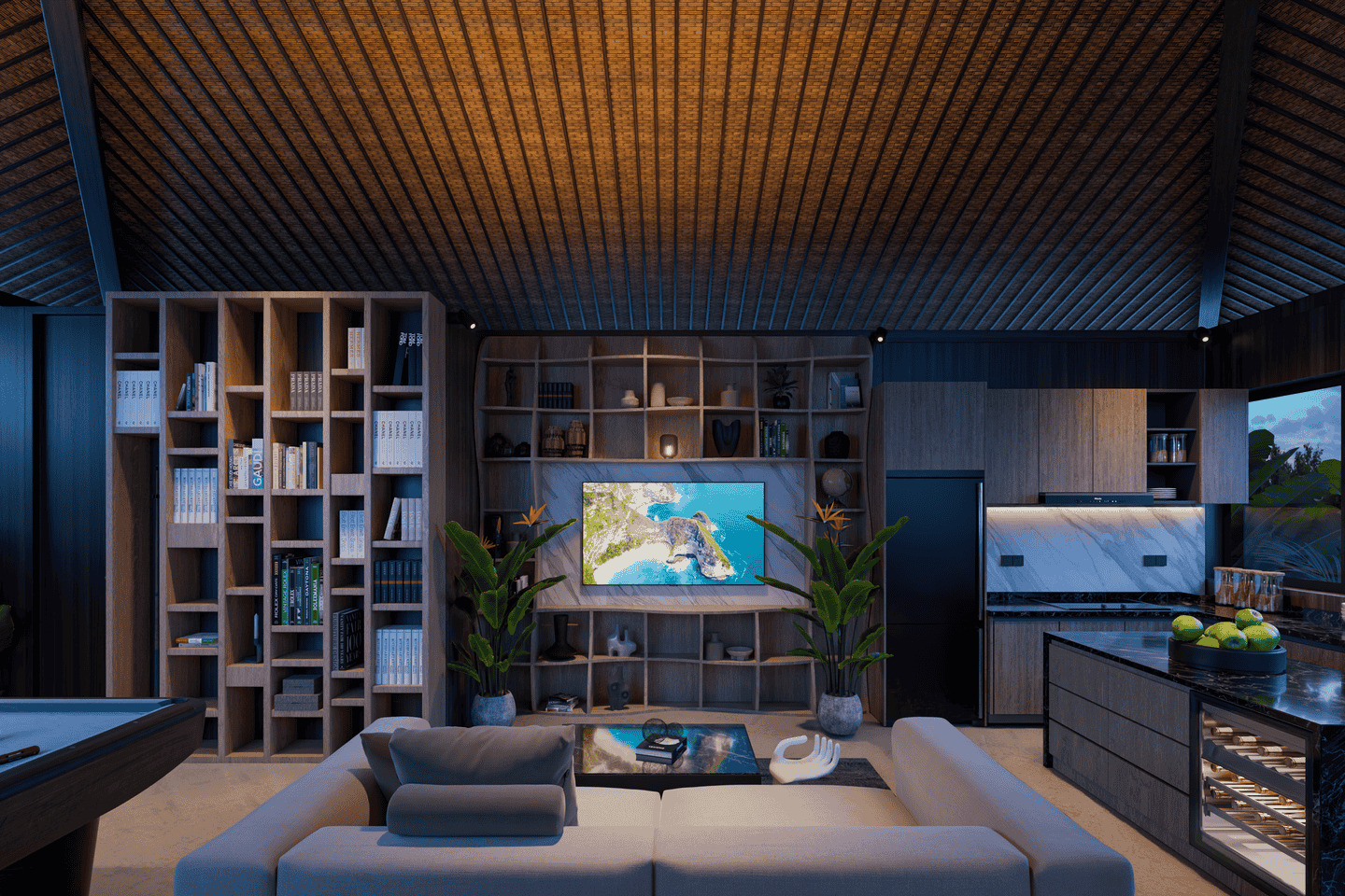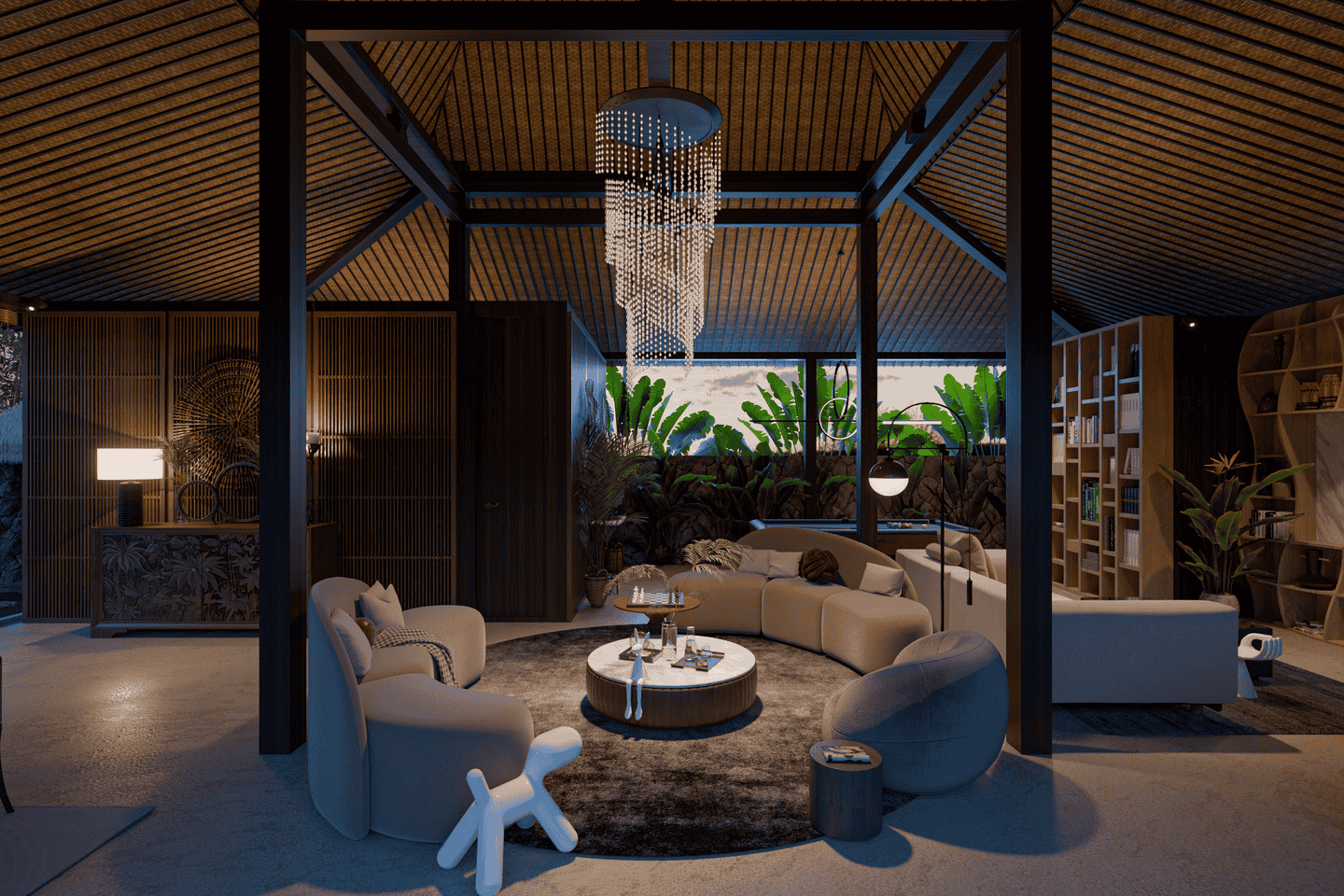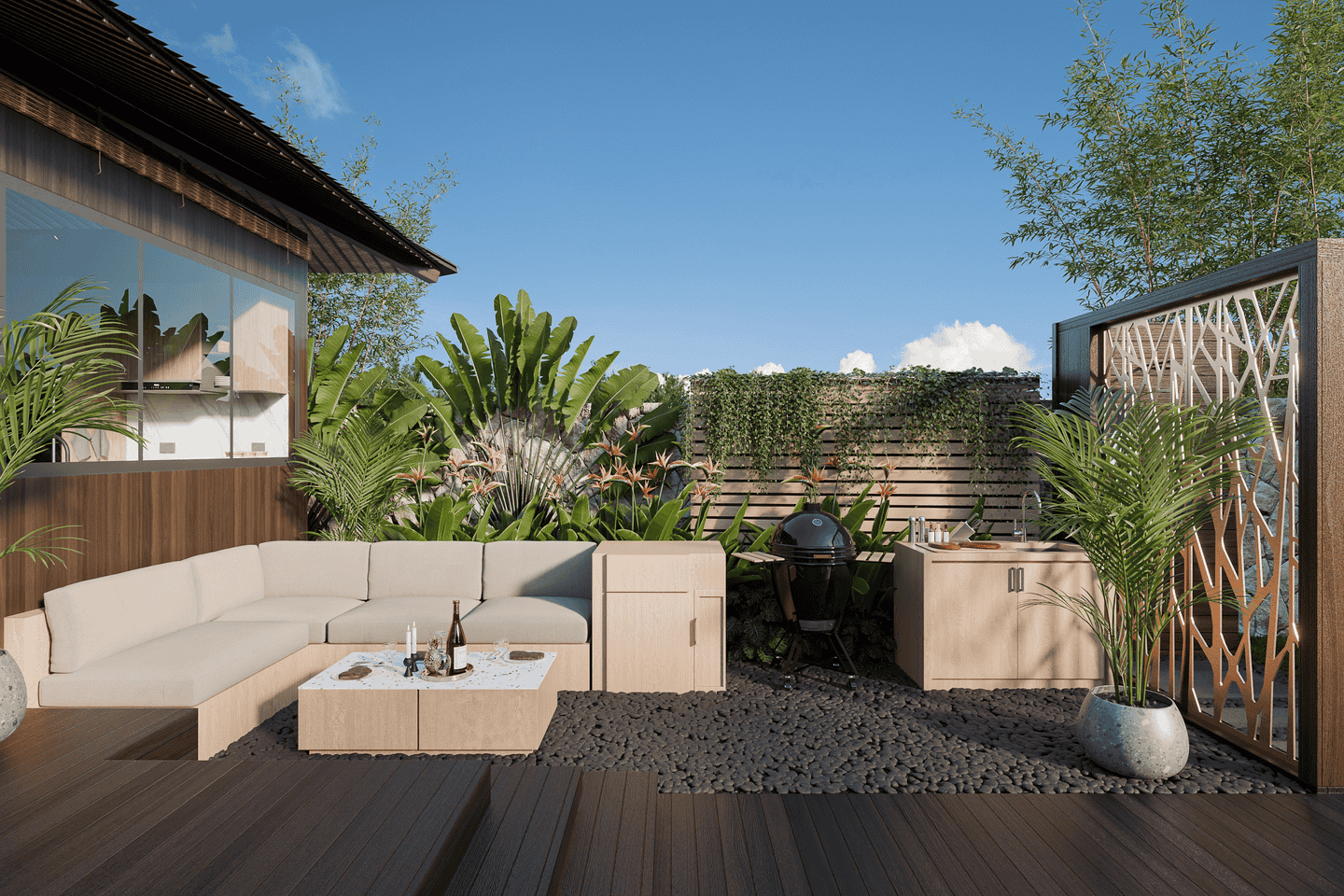 Step outside to a welcoming private swimming pool, complete with a cabana, lounge chairs, and a BBQ area. The pool is surrounded by lush tropical greenery, creating a serene and relaxing atmosphere.