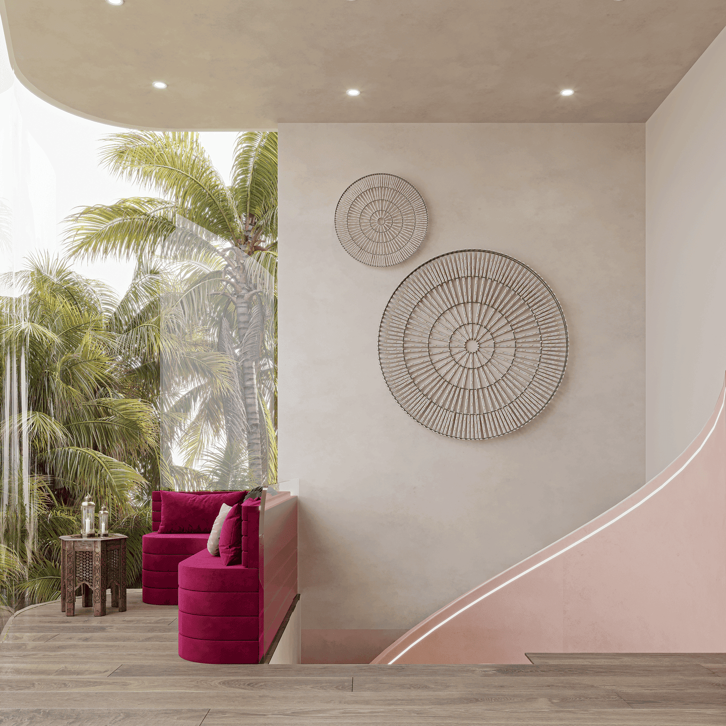 Modern villa with swimming pool and palm trees.