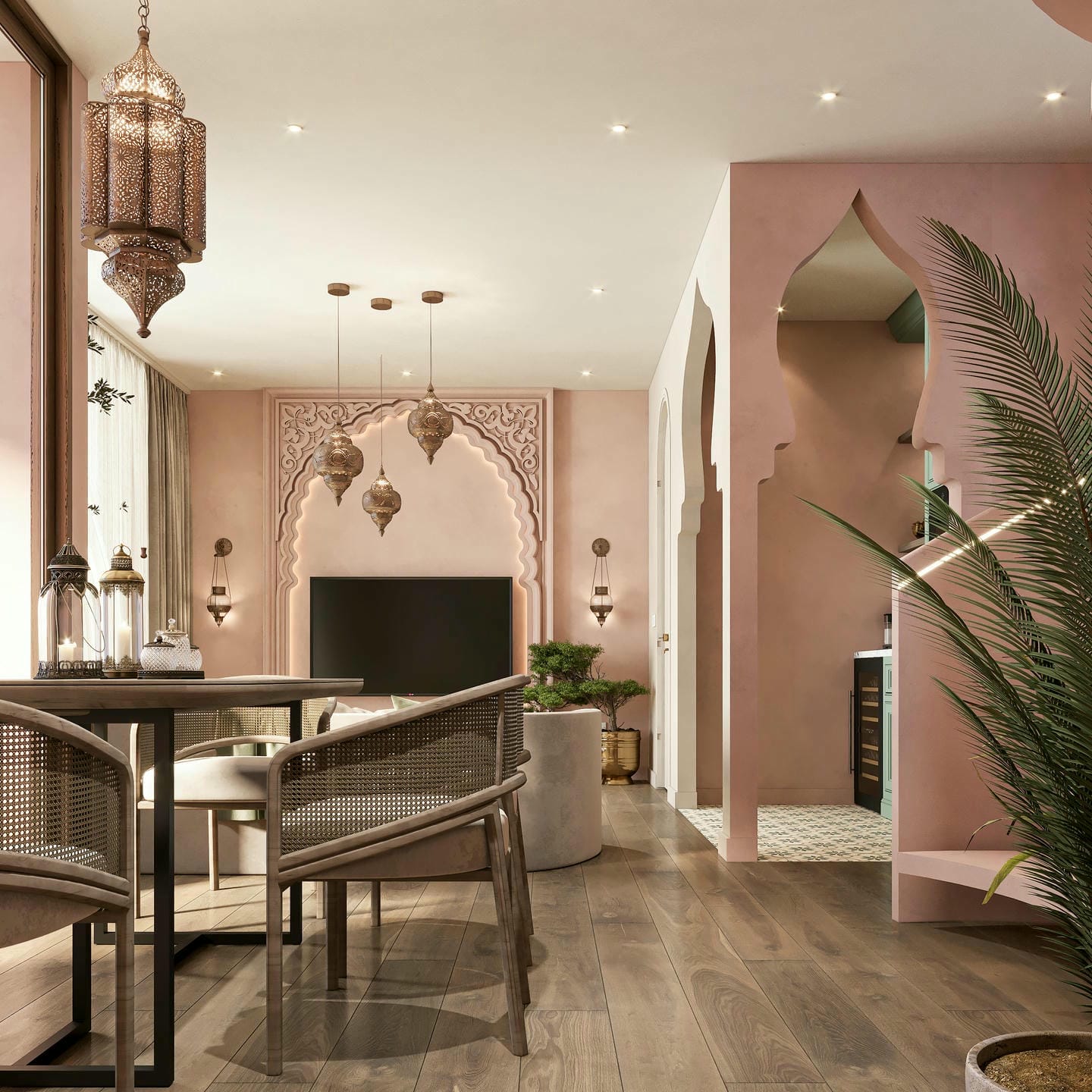 Modern living room with kitchen and Netflix TV