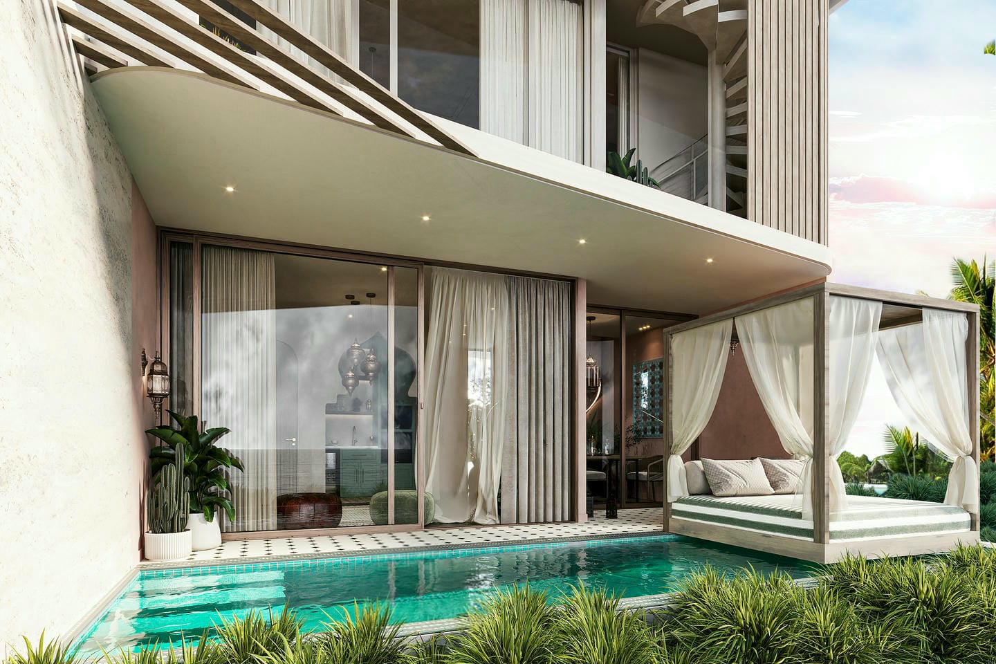 The outdoor living area is designed for comfort and relaxation, featuring a private swimming pool surrounded by lush greenery and a shaded daybed lounge perfect for unwinding. The rooftop terrace offers stylish seating and open views of the horizon, creating an ideal space to enjoy sunsets, entertain guests, or simply relax in a beautiful tropical setting. The property complex is complemented by fully facilitated amenities, including a fully equipped gym, yoga space, spa, and cinema, ensuring a complete lifestyle experience of leisure and wellness.