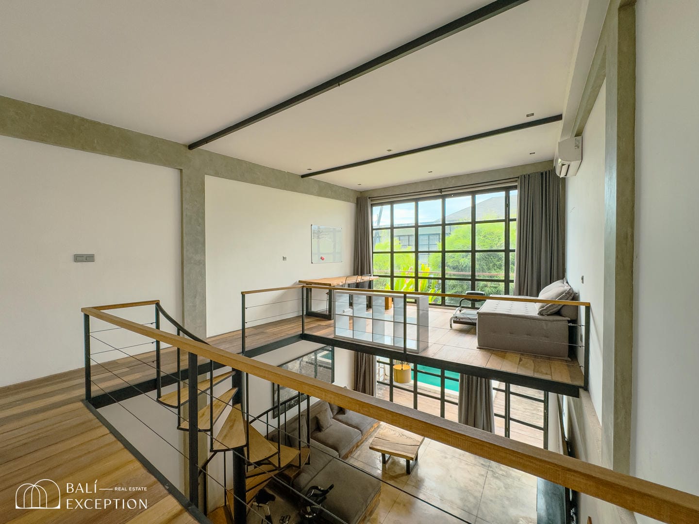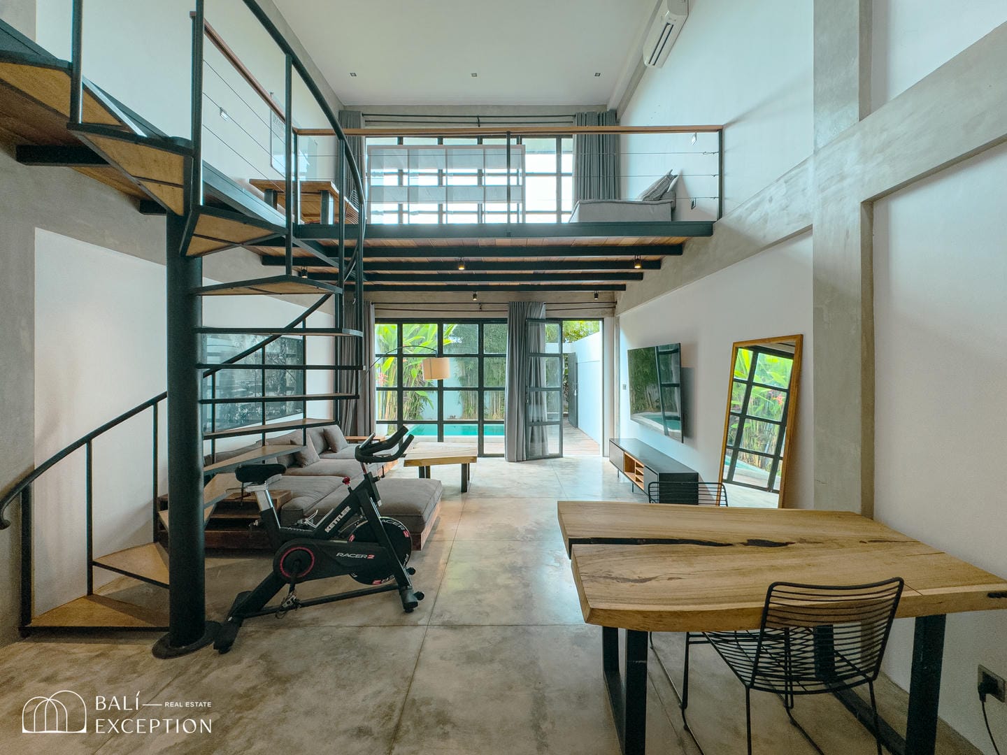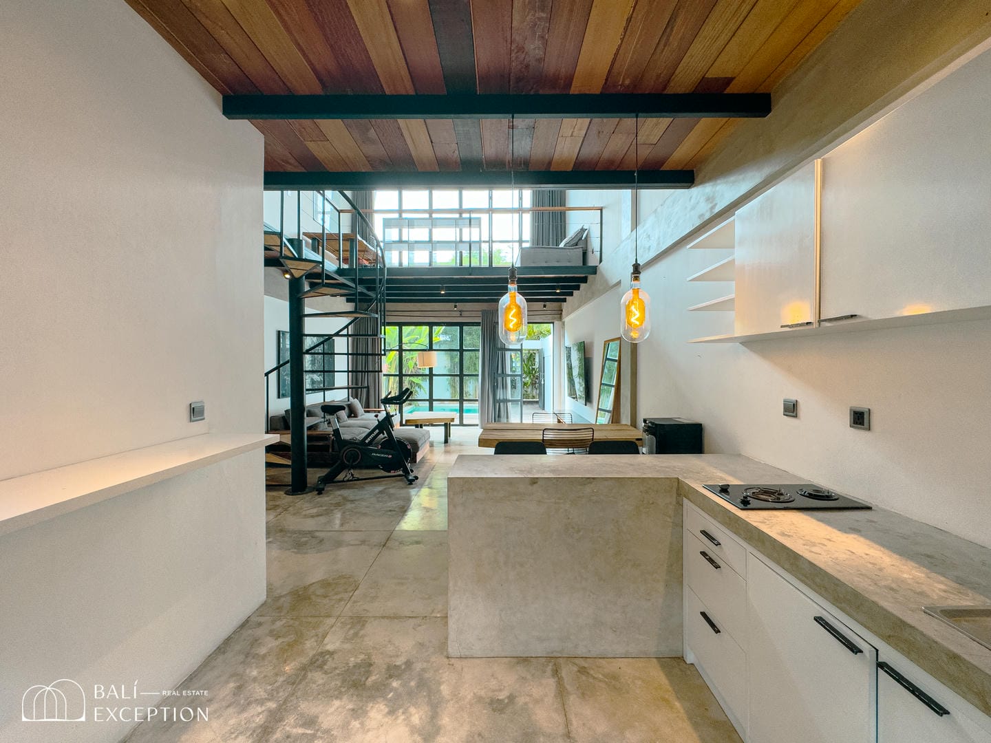 Inside, the villa features a modern industrial design with high ceilings, large steel-framed windows, and a warm blend of wood and concrete elements. The open-plan living room flows seamlessly into the dining and kitchen area, while the spacious mezzanine bedroom overlooks the entire space, creating a bright and airy atmosphere.
