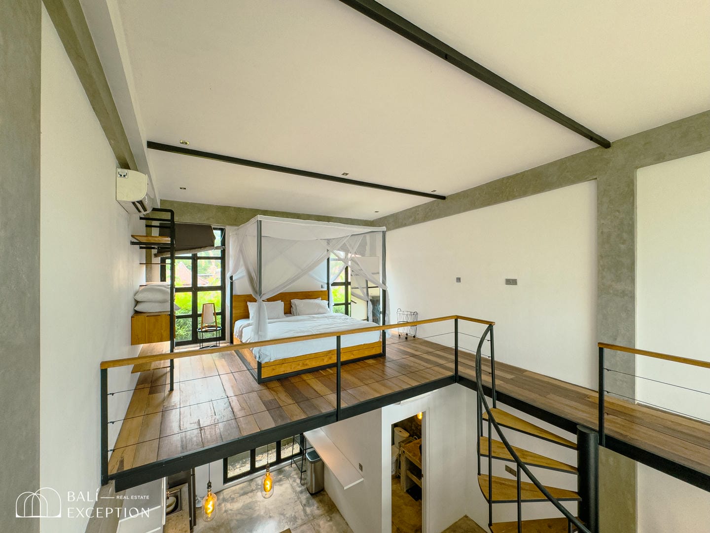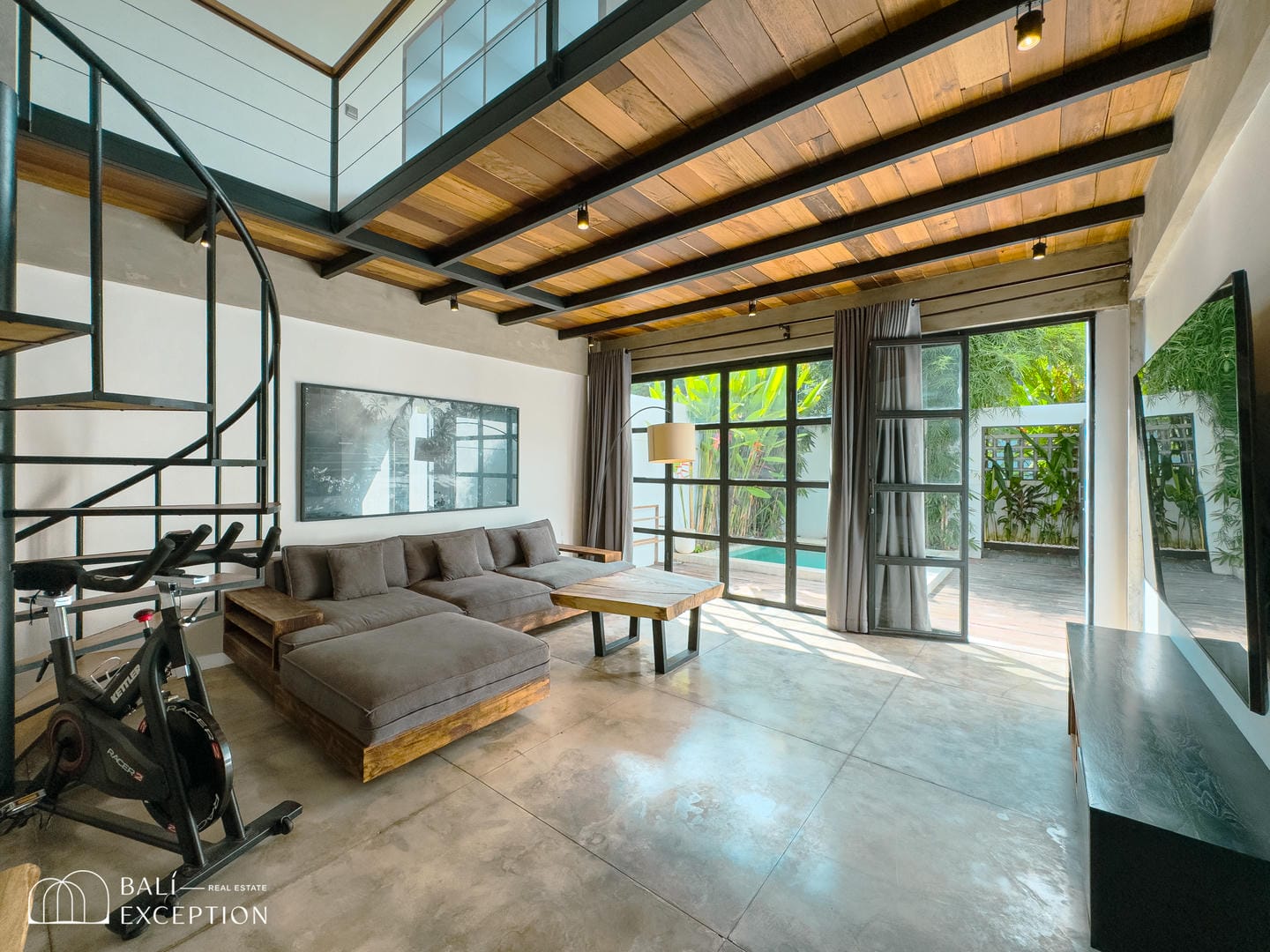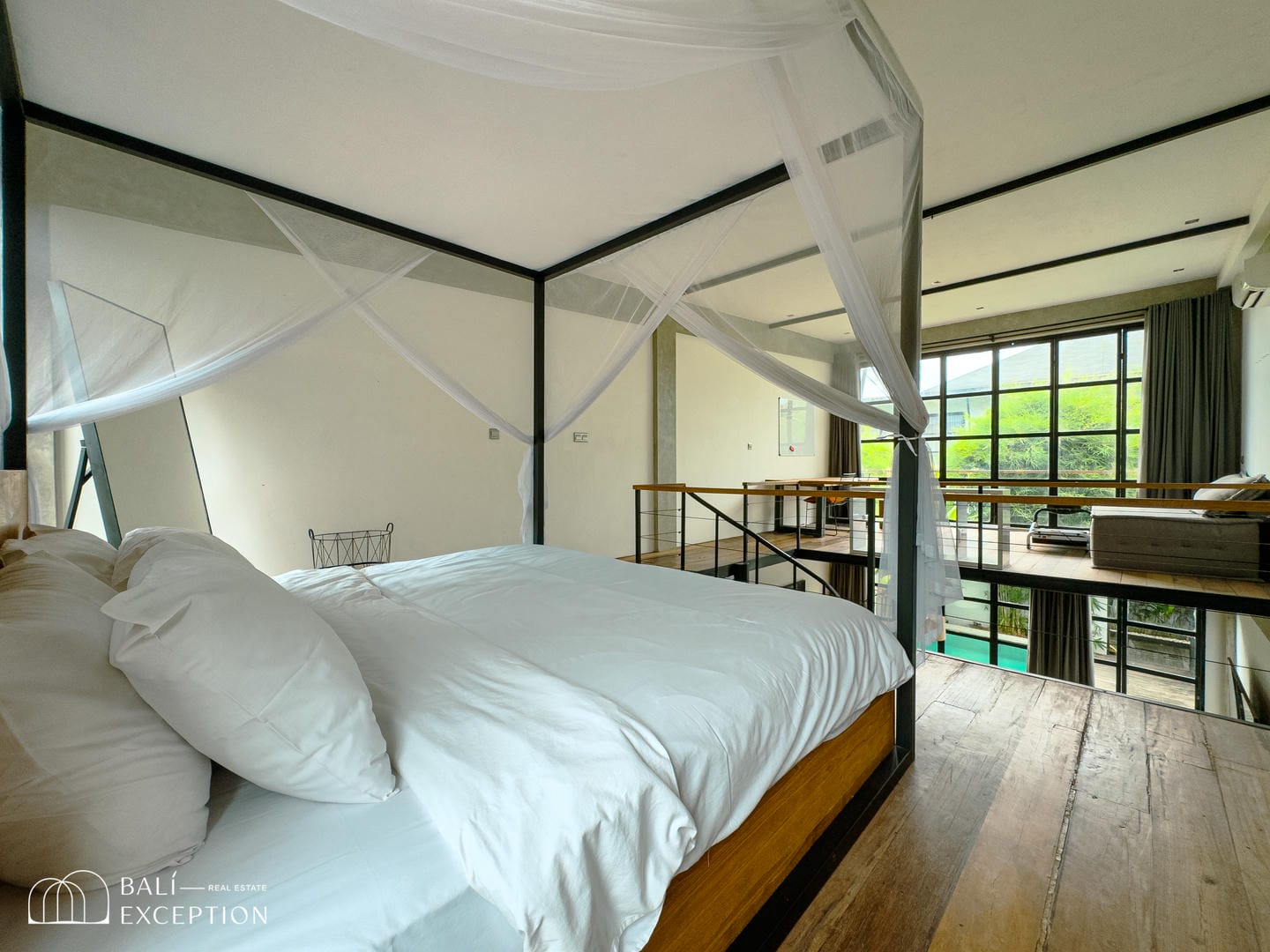 Inside, the villa features a modern industrial design with high ceilings, large steel-framed windows, and a warm blend of wood and concrete elements. The open-plan living room flows seamlessly into the dining and kitchen area, while the spacious mezzanine bedroom overlooks the entire space, creating a bright and airy atmosphere.
