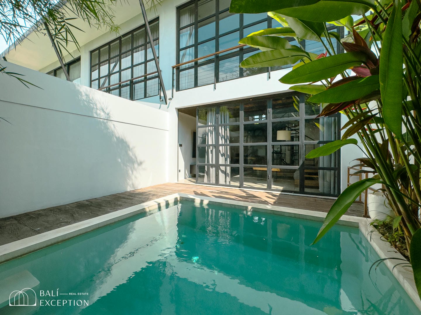 The outdoor area offers a private pool surrounded by clean minimalist walls and tropical plants, providing a refreshing view from both the living room and the upper bedroom level.