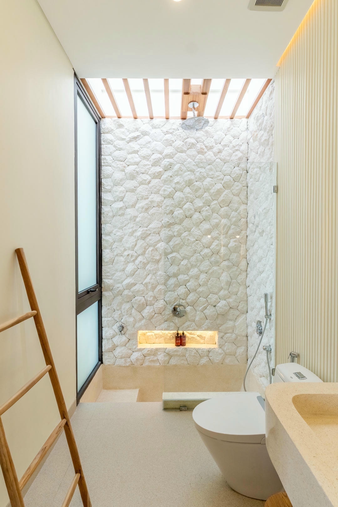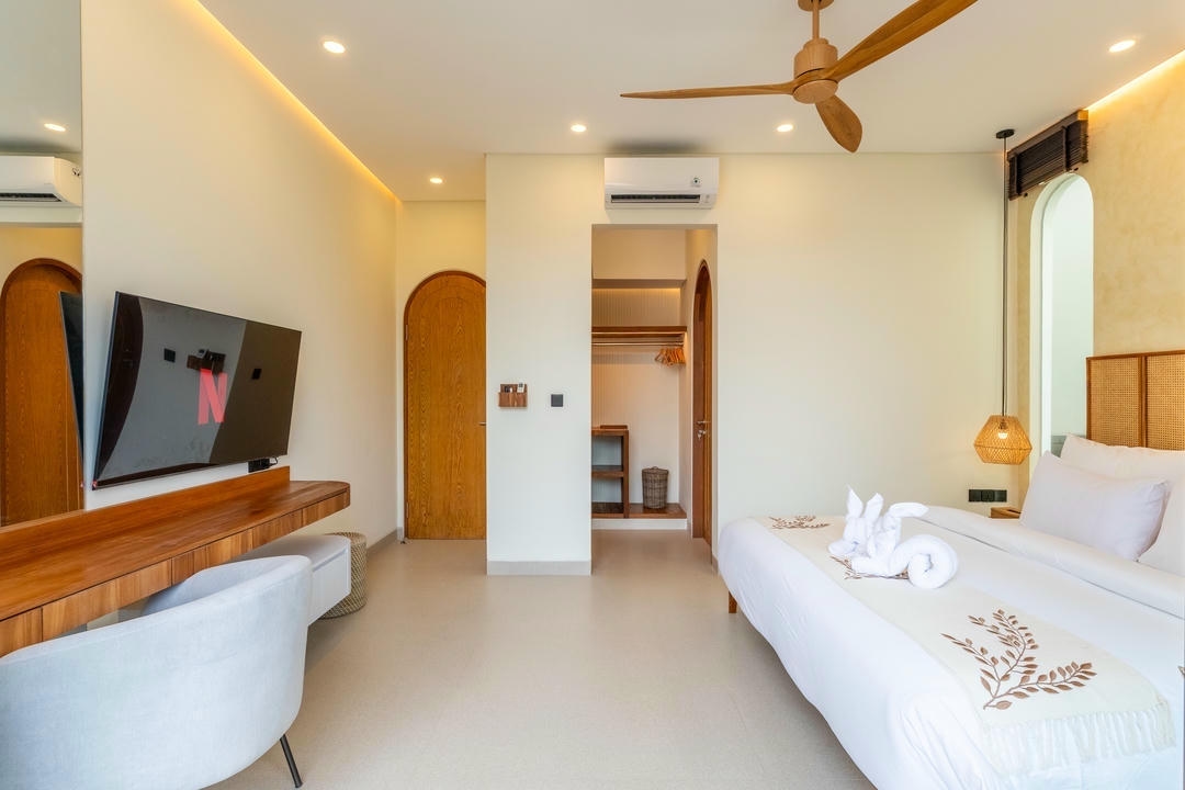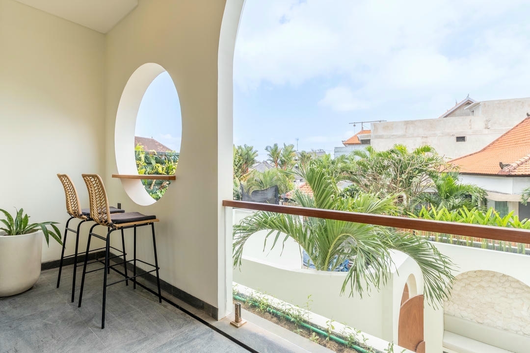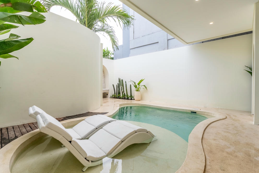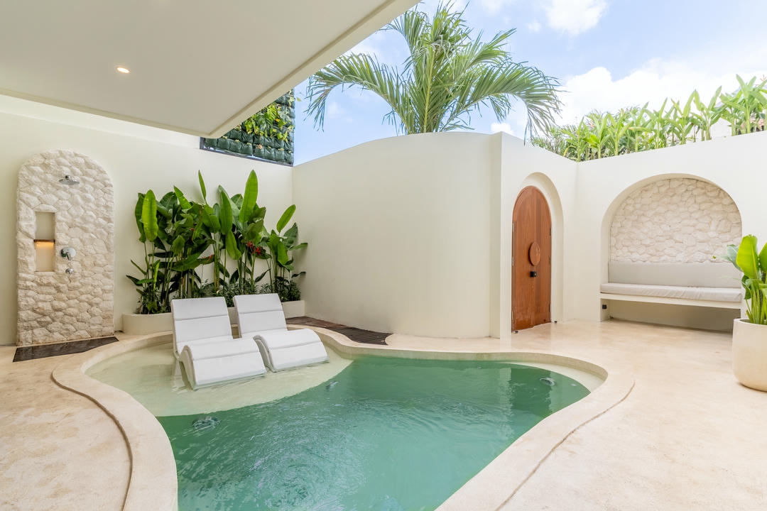 Outside, enjoy a private swimming pool with sunbeds and an outdoor shower, while the balcony with a lounge area offers a perfect spot to unwind and enjoy the Canggu atmosphere.