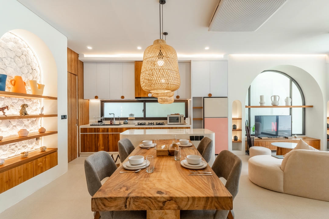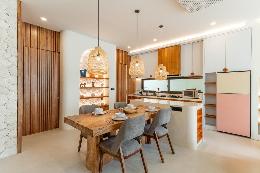 This two-level villa features two bedrooms with ensuite bathrooms and an enclosed living room enhanced by high ceiling windows, creating a bright and airy interior. Fully furnished and move-in ready, the villa includes a fully equipped kitchen with an island table, a dedicated dining area, a powder room, and a washing machine for added convenience.