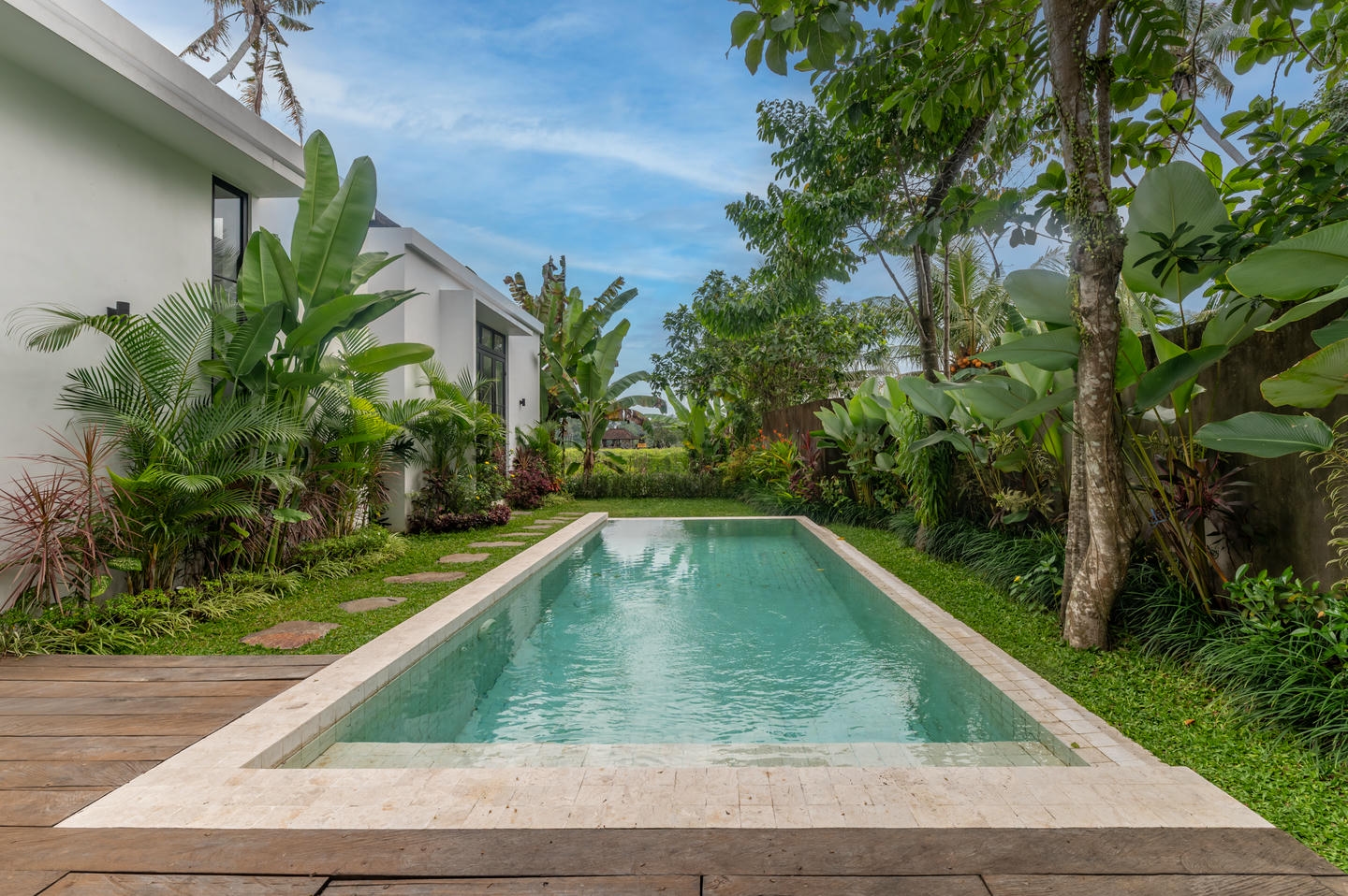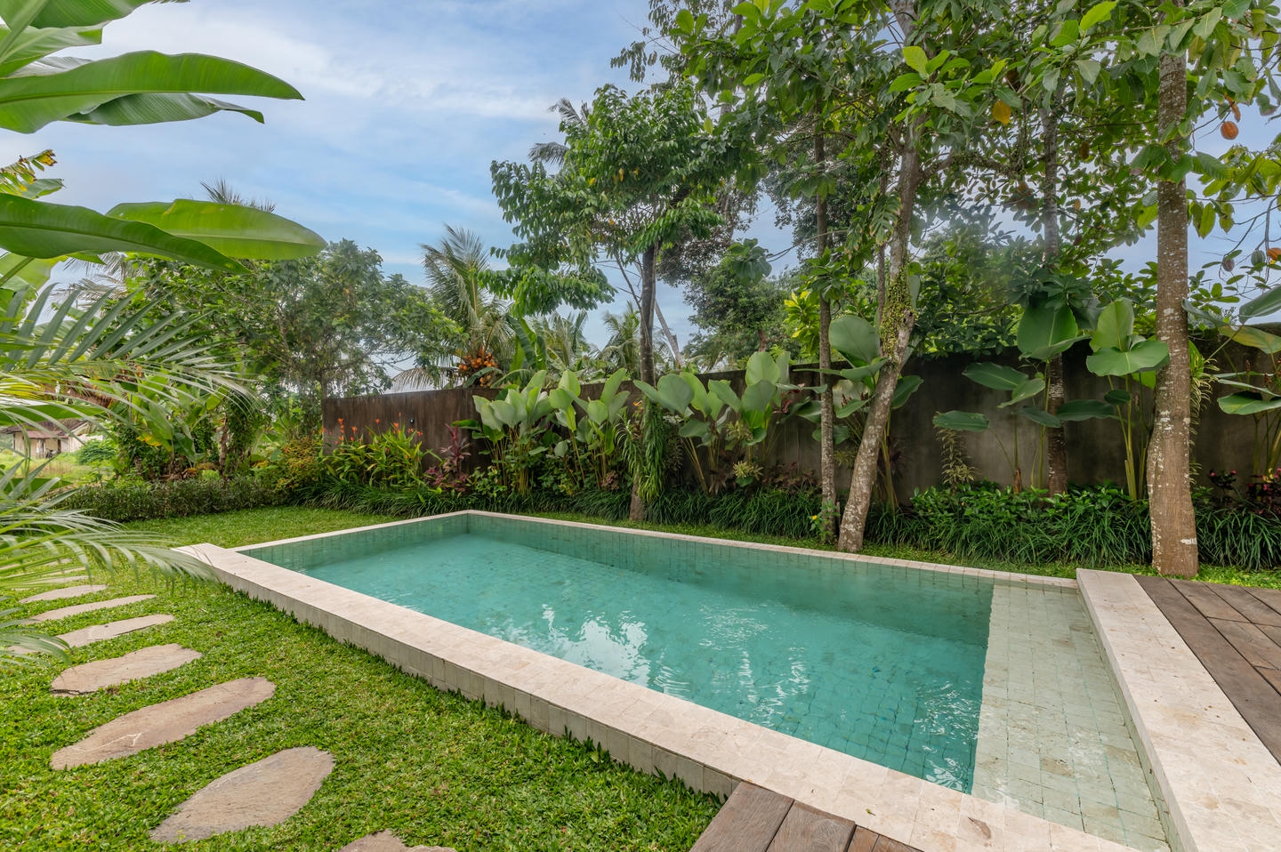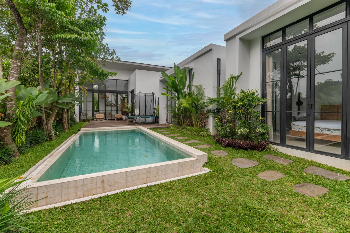 Step outside to your private swimming pool complemented by a mini garden, offering a tranquil tropical retreat.