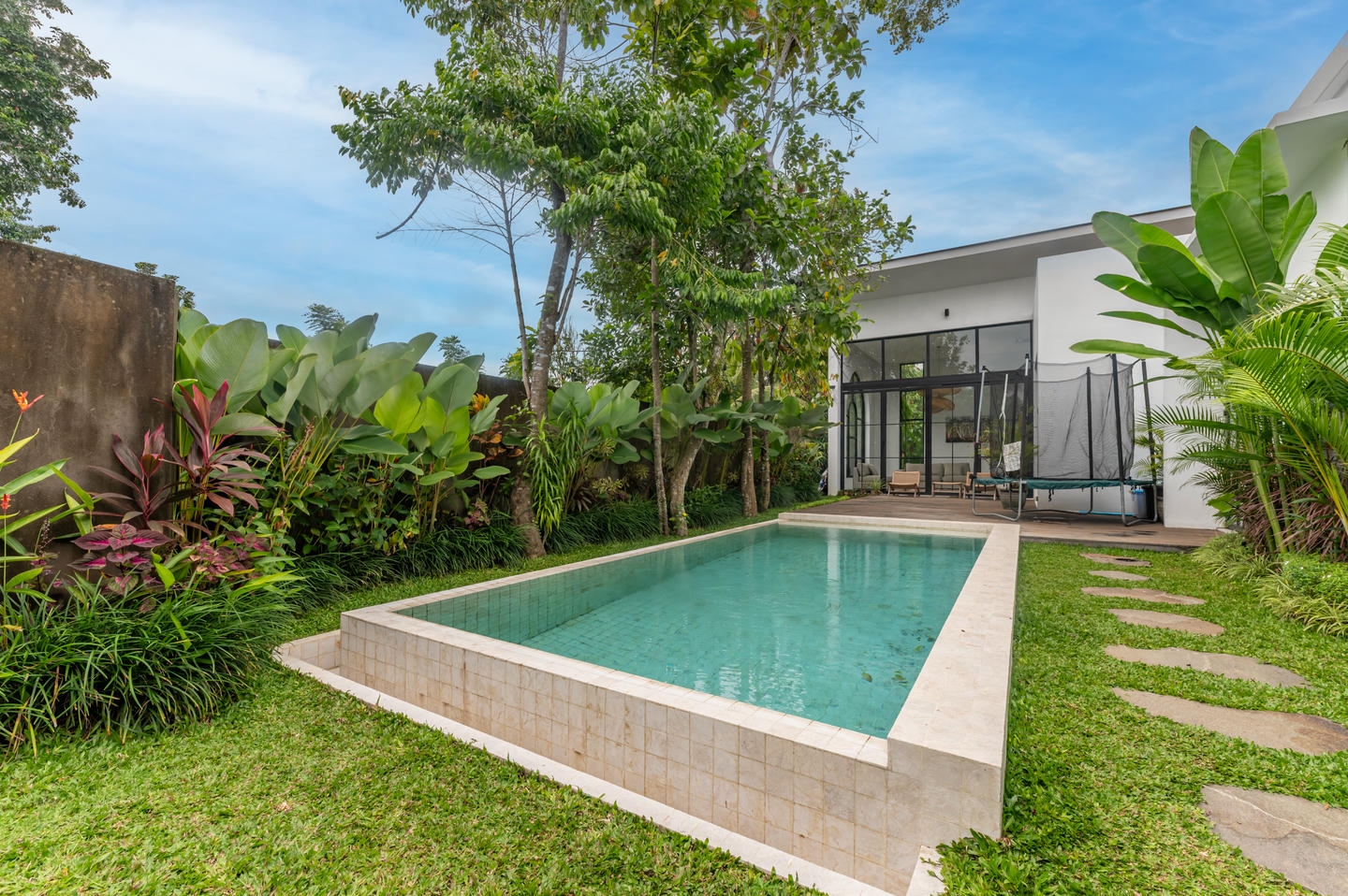 The pool, garden, and lounge area