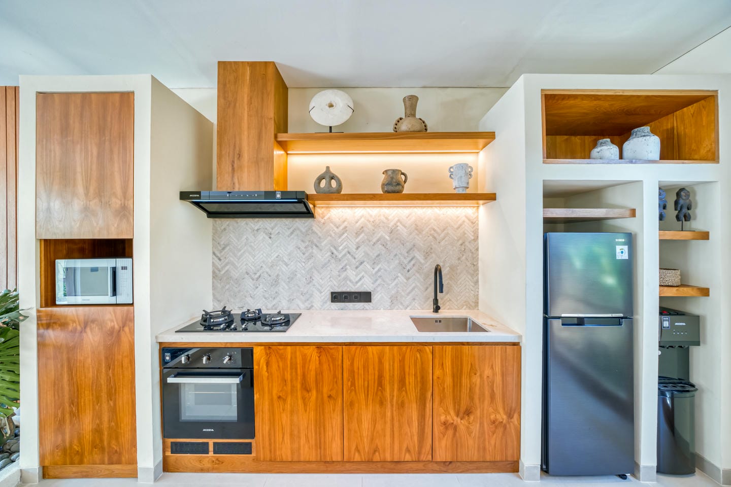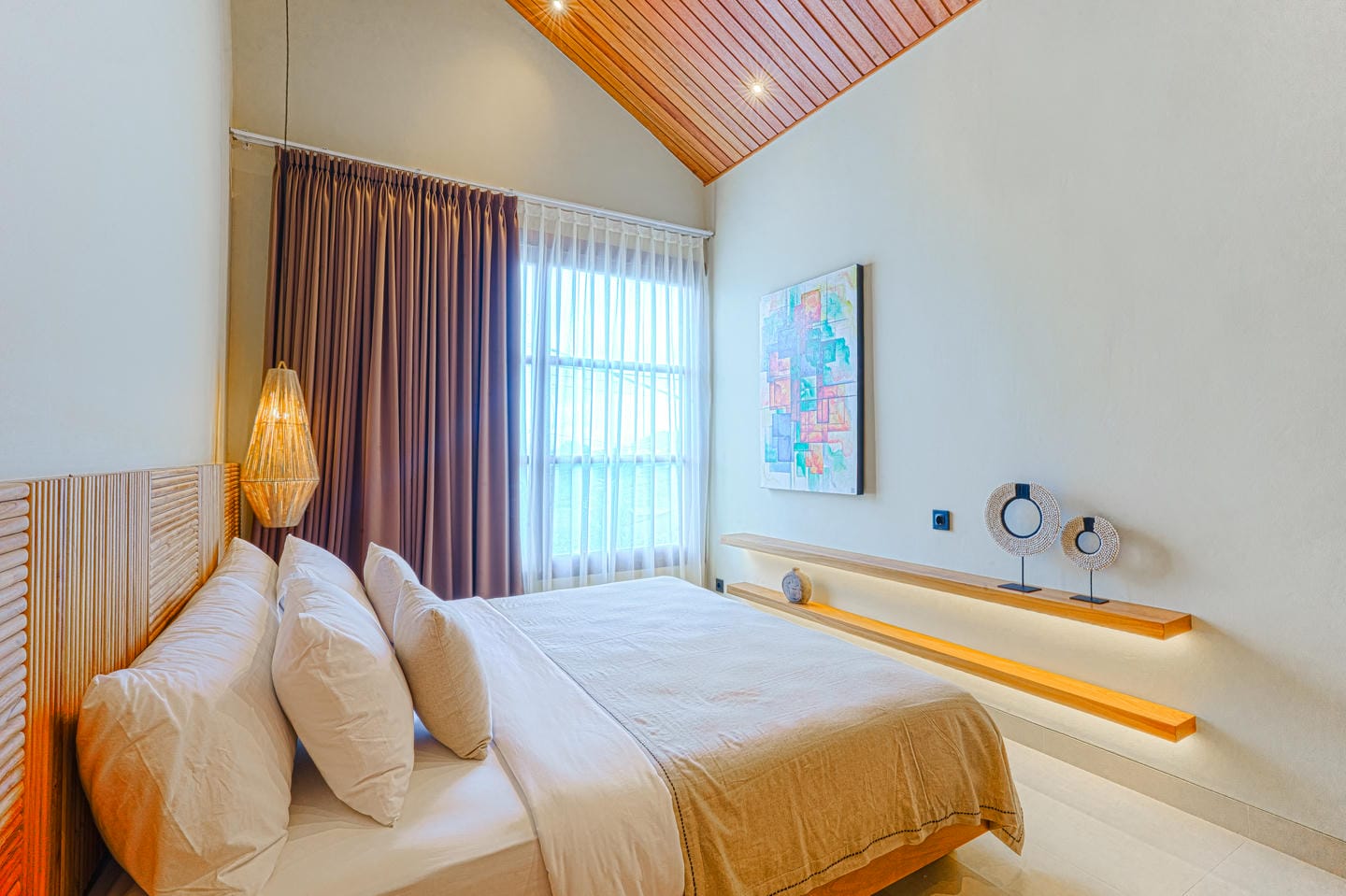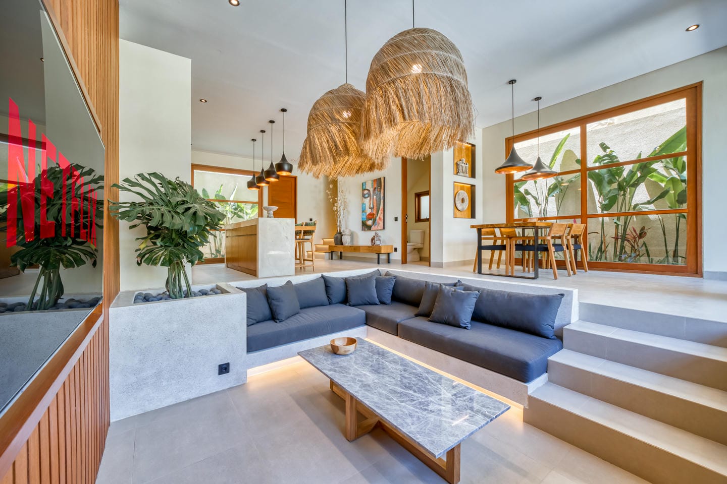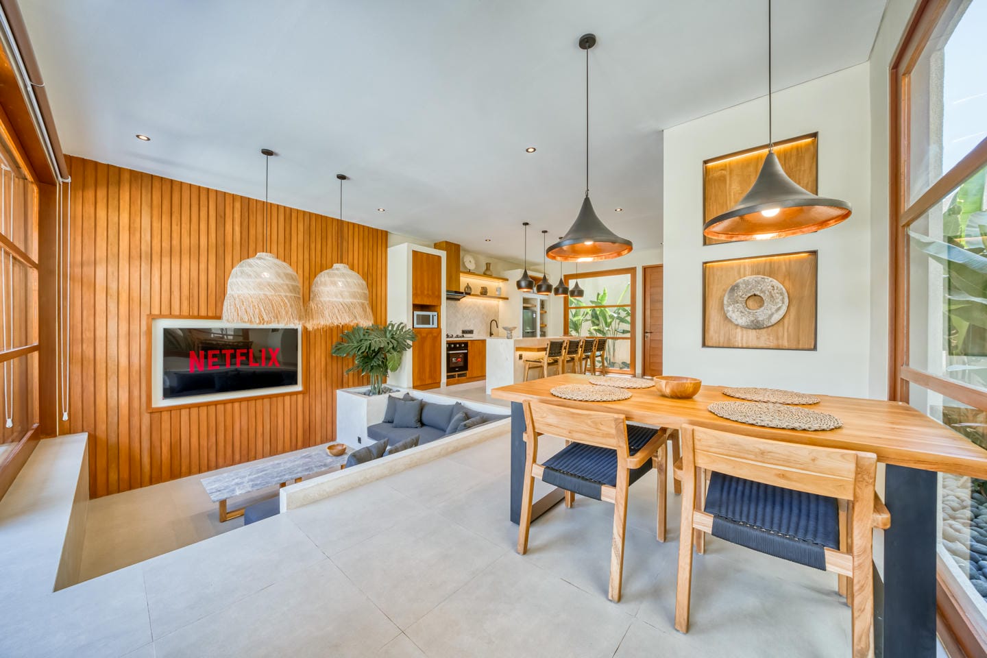 The interior features a warm tropical-modern design, combining natural wood elements, soft neutral tones, and clean architectural lines. The open-plan living, dining, and kitchen area is thoughtfully designed with high ceilings, custom lighting, and large glass openings that create a bright and airy atmosphere throughout the villa.