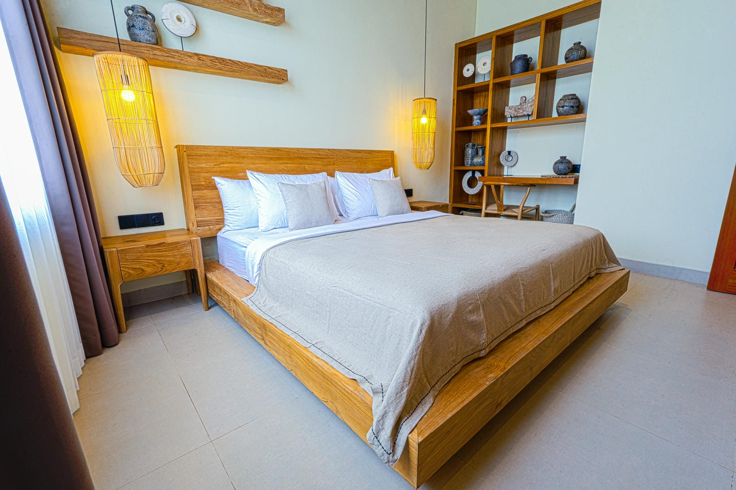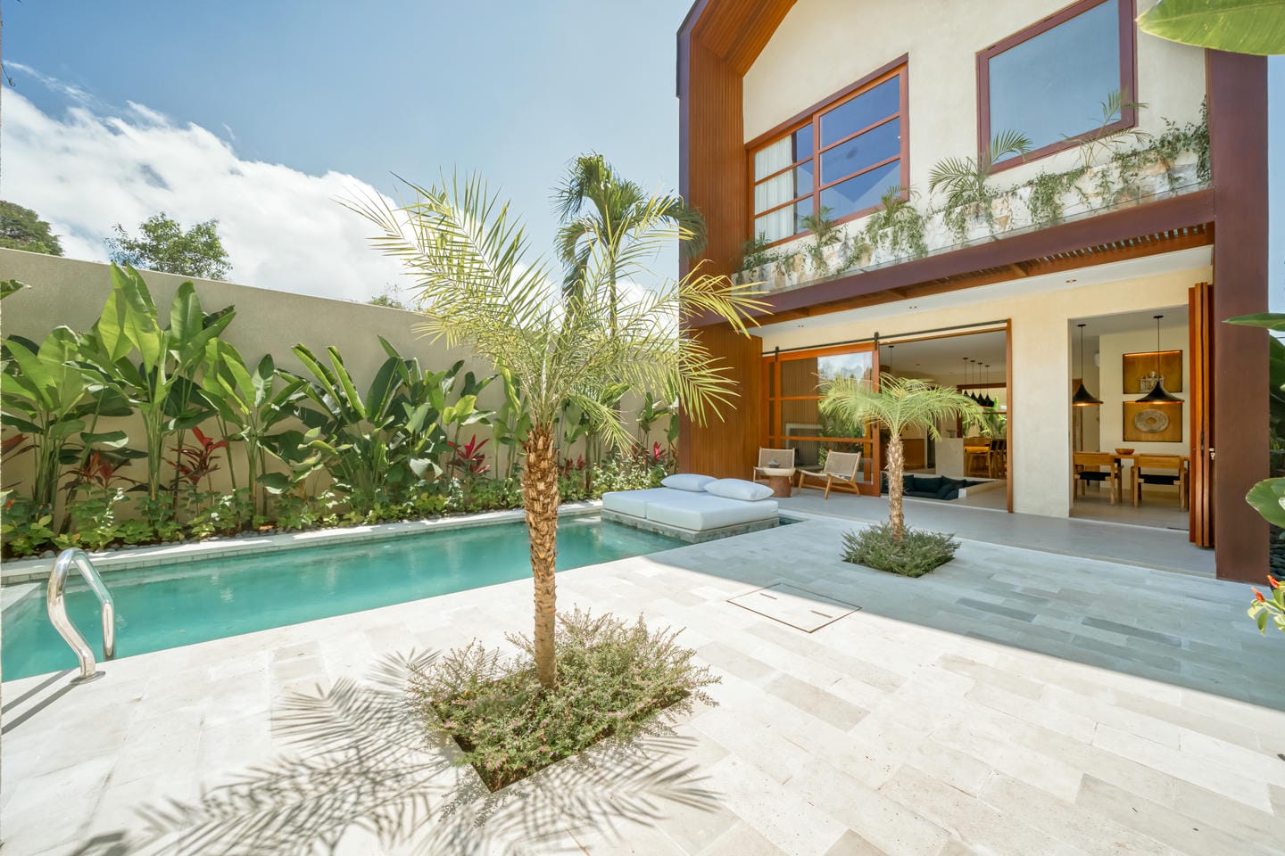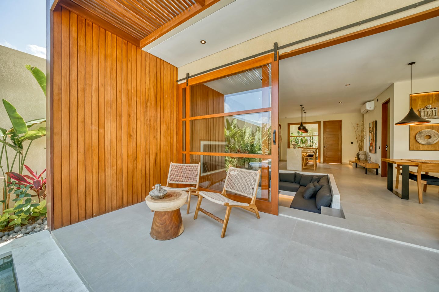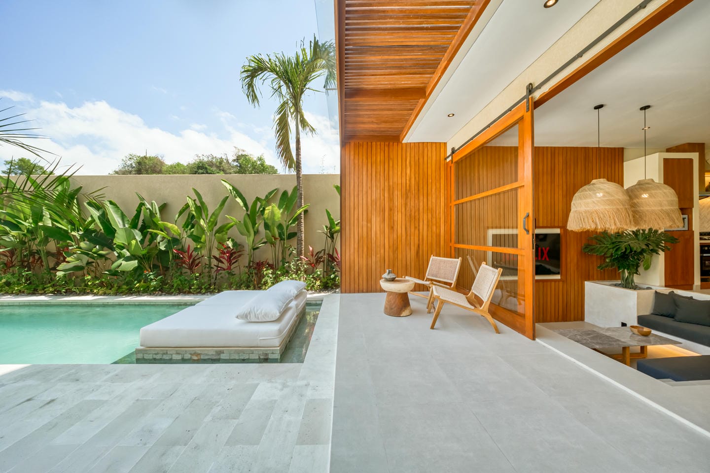 Outside, the villa opens to a private swimming pool surrounded by lush tropical greenery, offering a peaceful and private setting. The seamless indoor-outdoor flow makes it perfect for relaxing, entertaining, or enjoying Bali’s year-round climate.