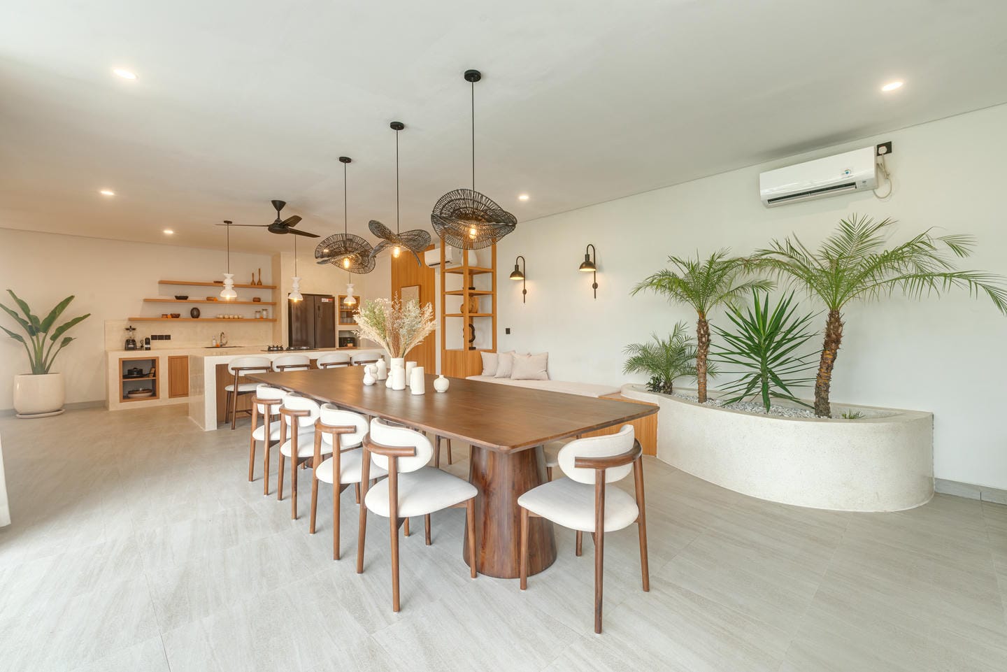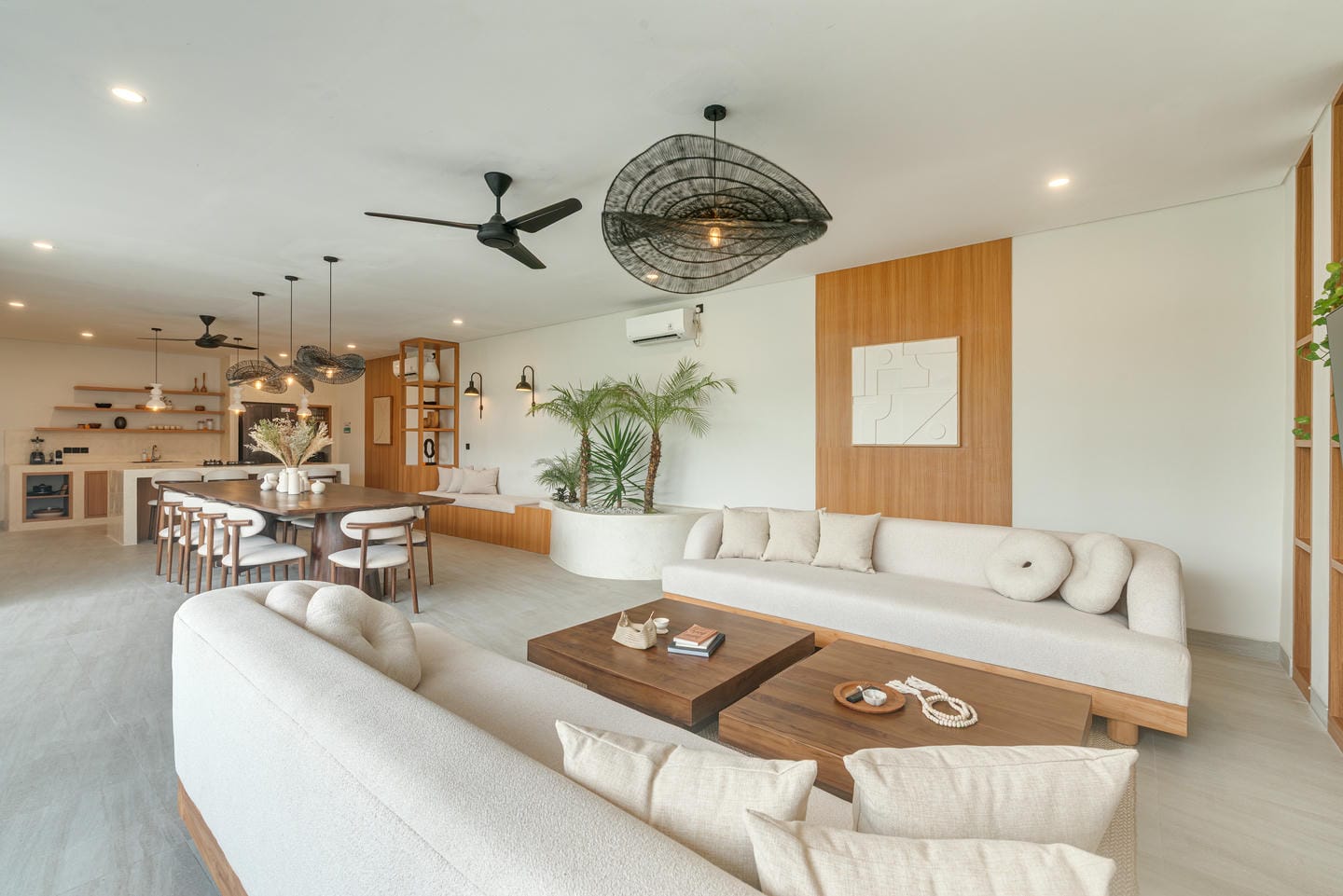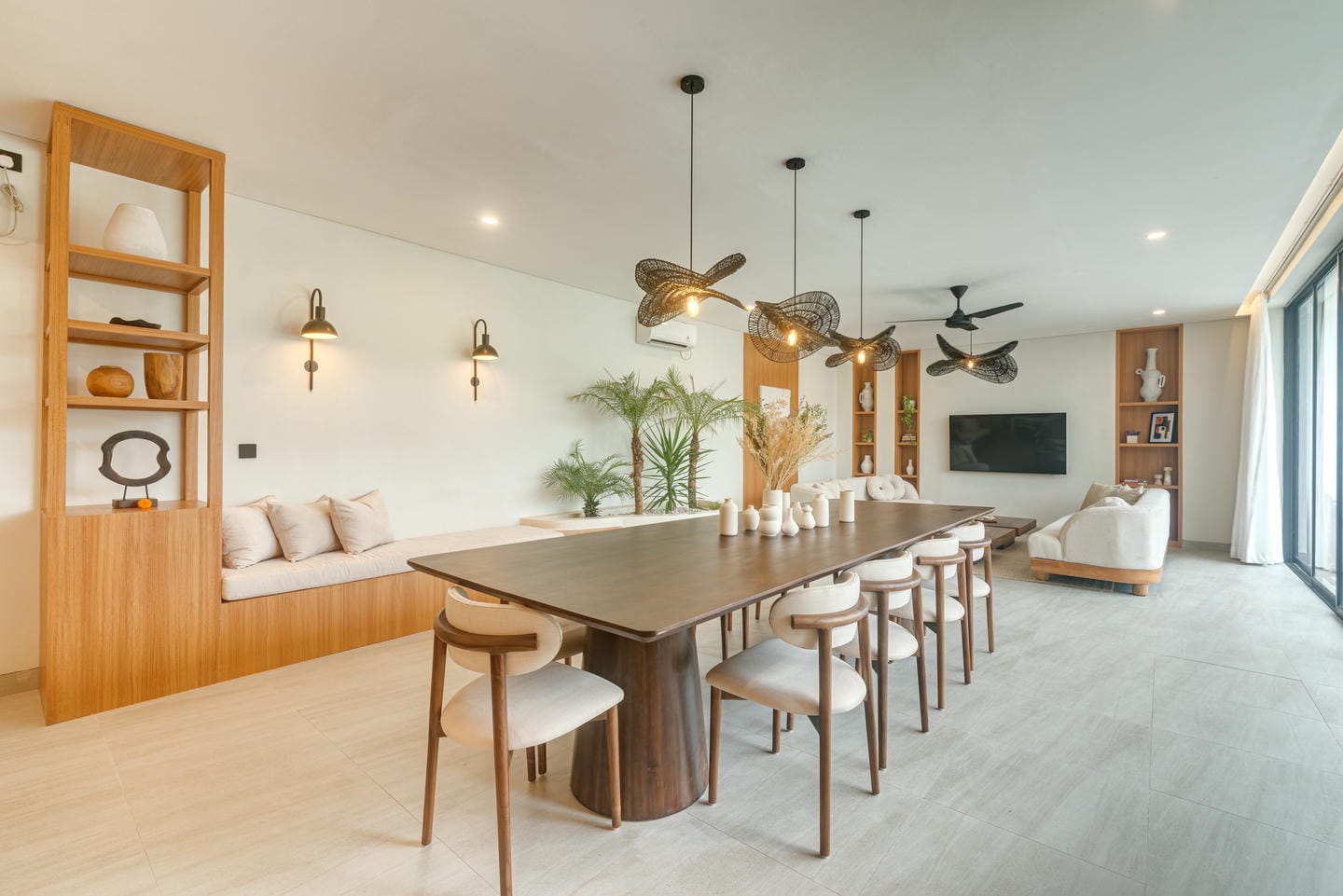The interior features a modern tropical design with clean lines, warm wood accents, natural textures, and neutral tones. Large windows and sliding glass doors allow plenty of natural light, creating bright, airy spaces. The open-plan living and dining areas feel elegant yet relaxed, ideal for both daily living and entertaining.