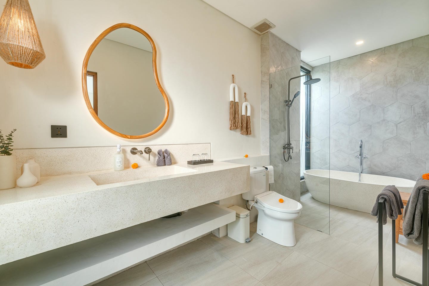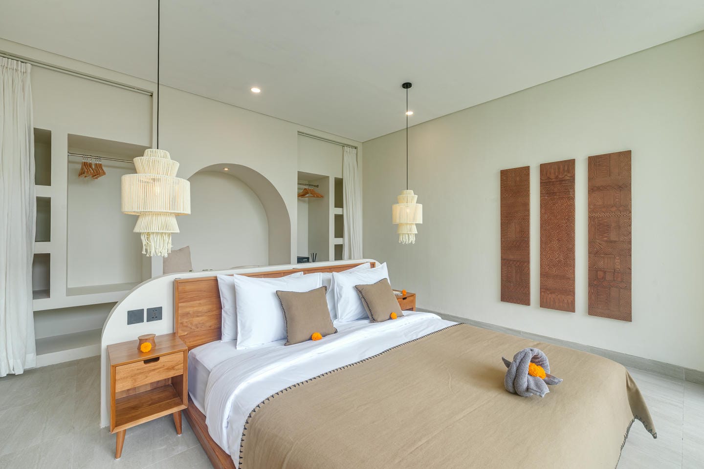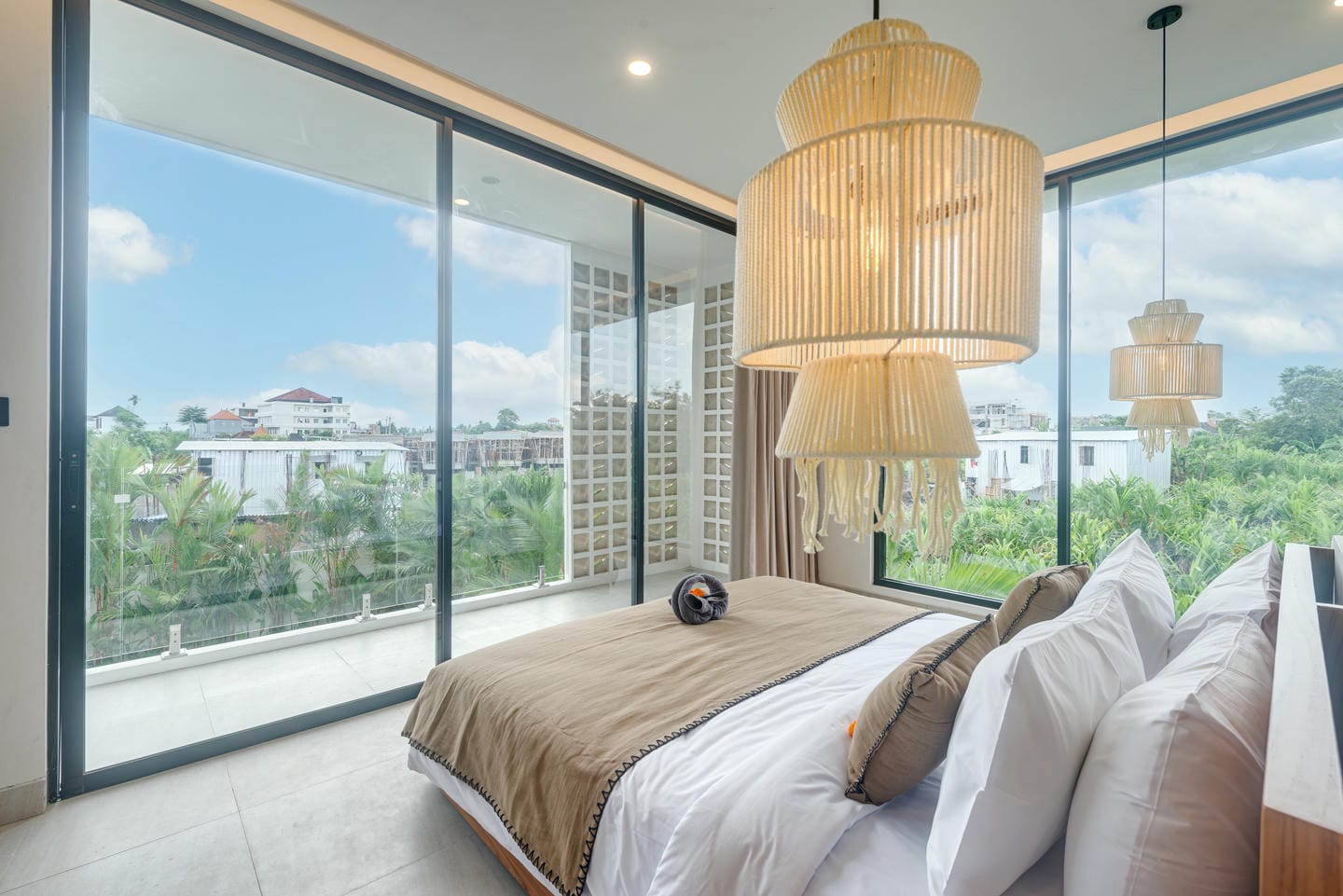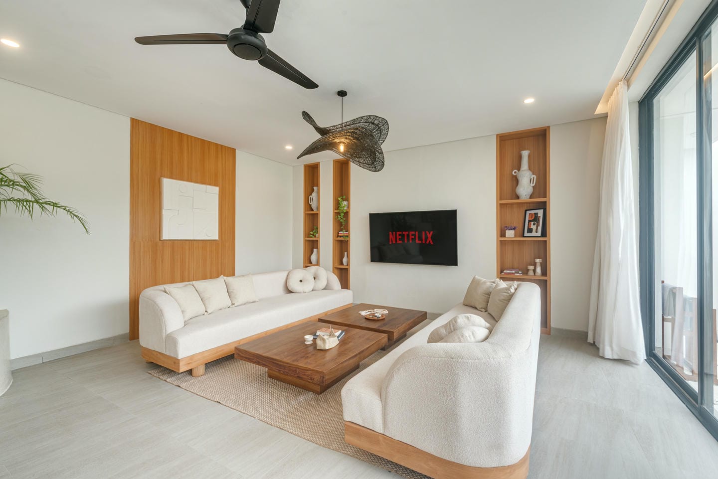 The interior features a modern tropical design with clean lines, warm wood accents, natural textures, and neutral tones. Large windows and sliding glass doors allow plenty of natural light, creating bright, airy spaces. The open-plan living and dining areas feel elegant yet relaxed, ideal for both daily living and entertaining.