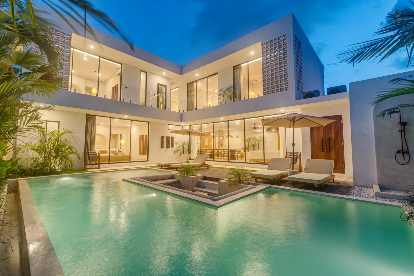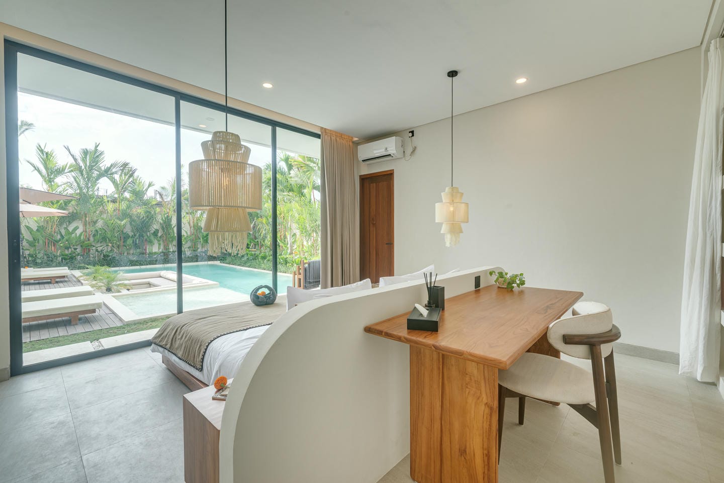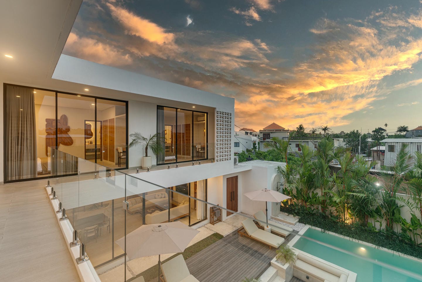 Outdoors, the villa offers a private swimming pool with sun loungers and a sunken seating area. The view overlooks a clean, contemporary courtyard surrounded by greenery, giving a resort-style ambiance that feels private and calming.