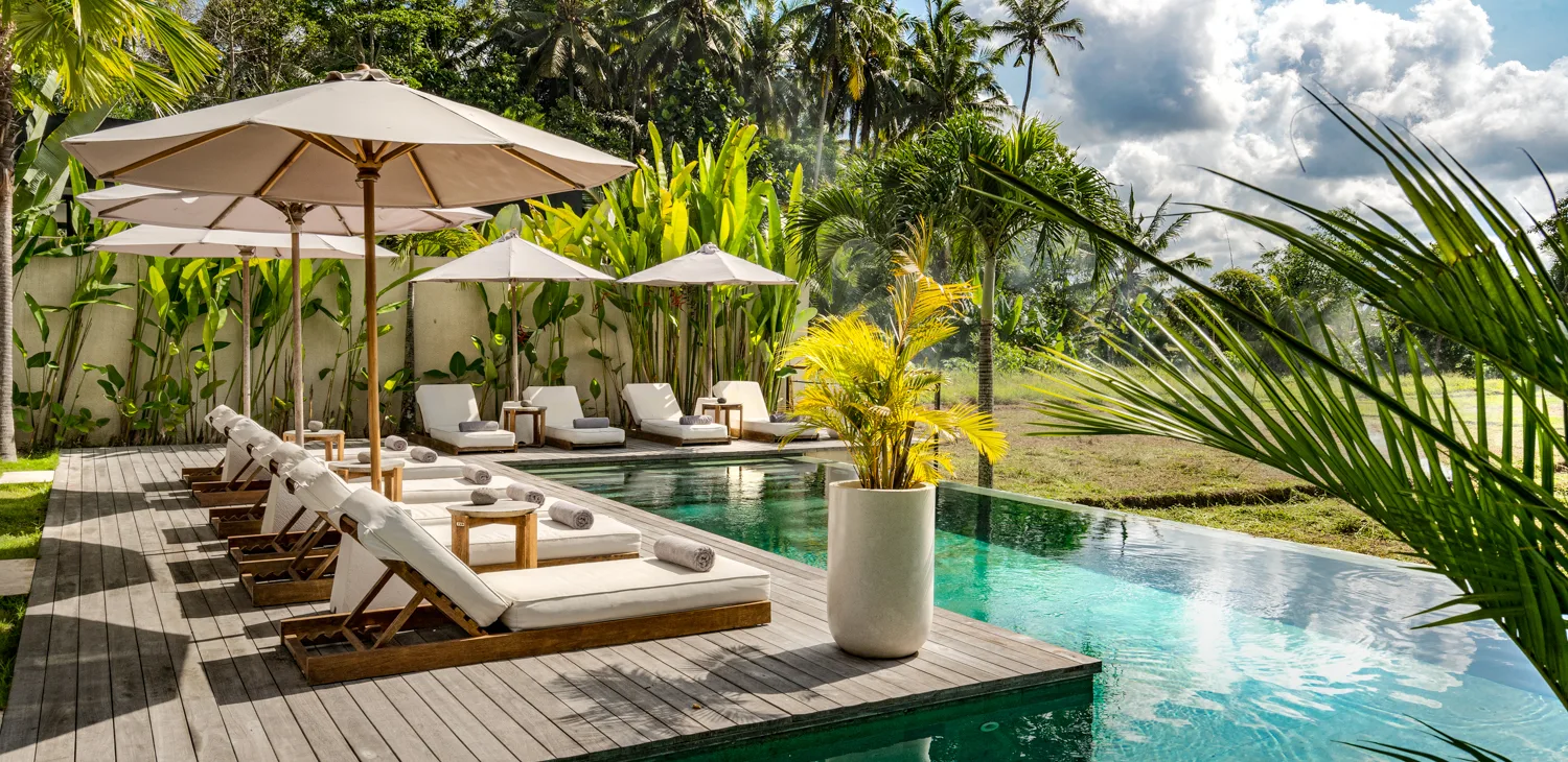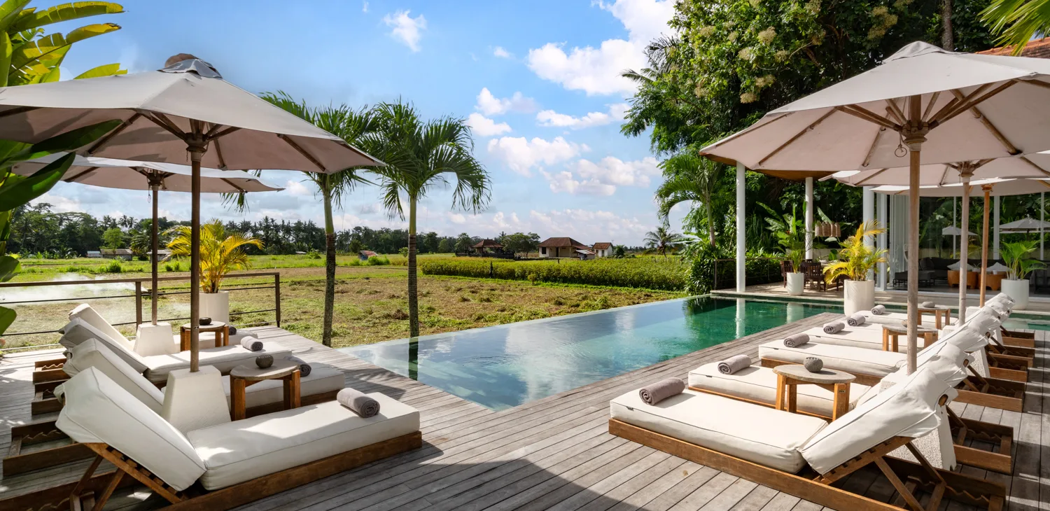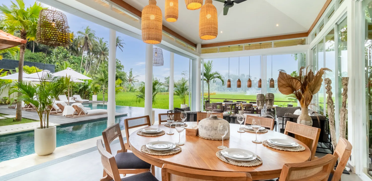 Outside, a sparkling swimming pool stretches between the villa wings, lined with palm trees and comfortable sun loungers. The outdoor deck overlooks lush green rice fields — a perfect setting to unwind, dine, or simply take in the serene beauty of Ubud’s landscape.