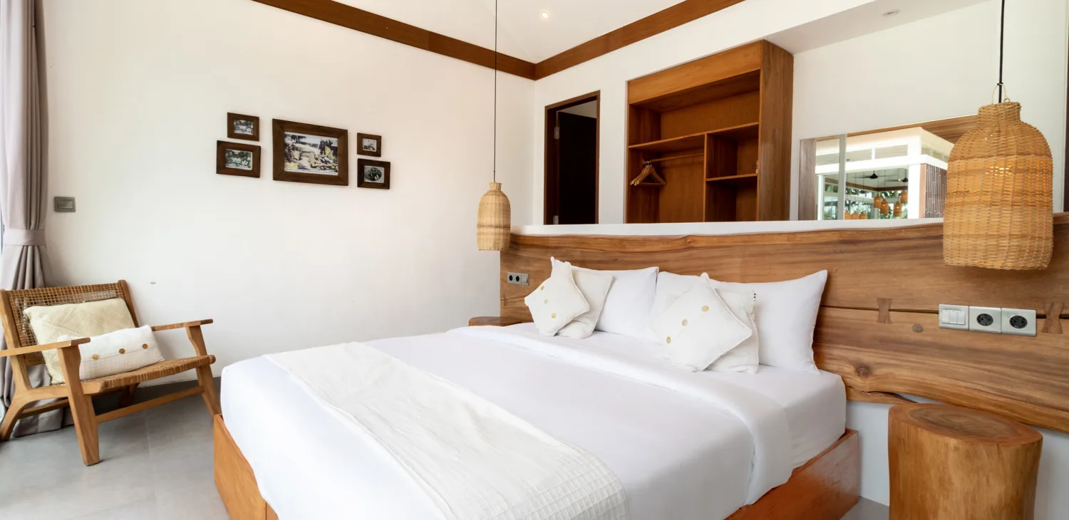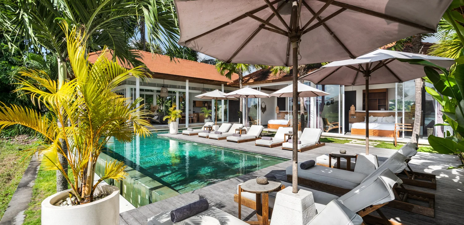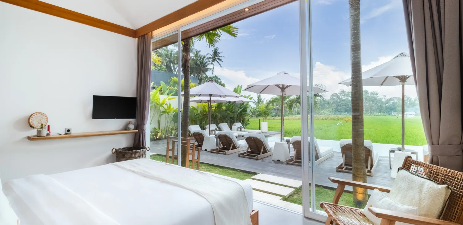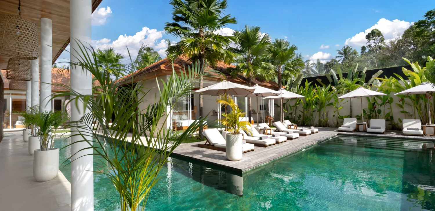 Outside, a sparkling swimming pool stretches between the villa wings, lined with palm trees and comfortable sun loungers. The outdoor deck overlooks lush green rice fields — a perfect setting to unwind, dine, or simply take in the serene beauty of Ubud’s landscape.