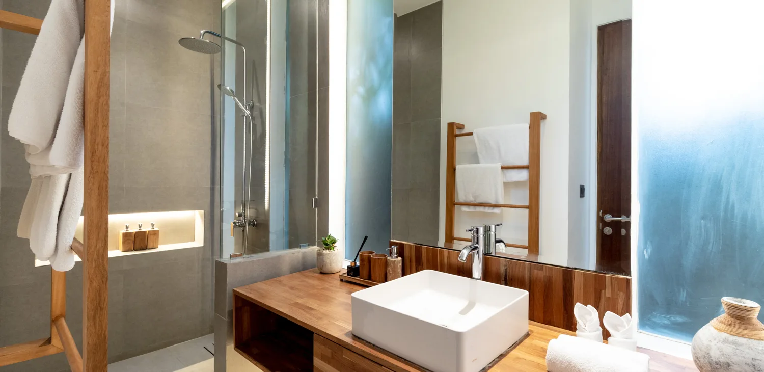 The villa features a contemporary tropical design with open-plan living spaces, high ceilings, and floor-to-ceiling glass panels that invite natural light and connect the indoors with the outdoors. The interiors are tastefully furnished in neutral tones, with warm wood accents and minimalist touches that create a sense of calm and sophistication.