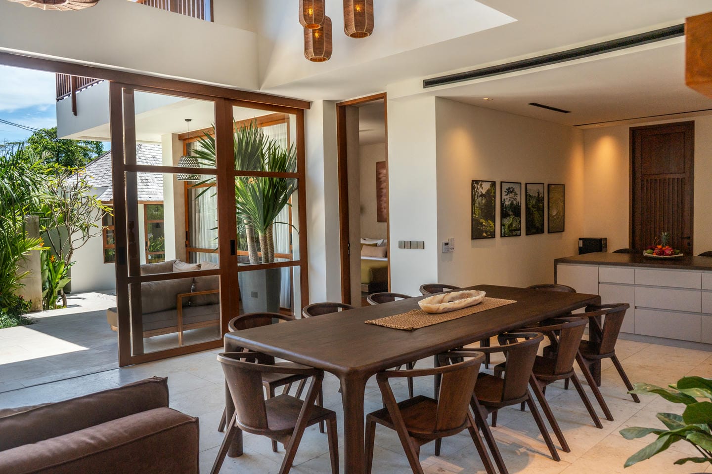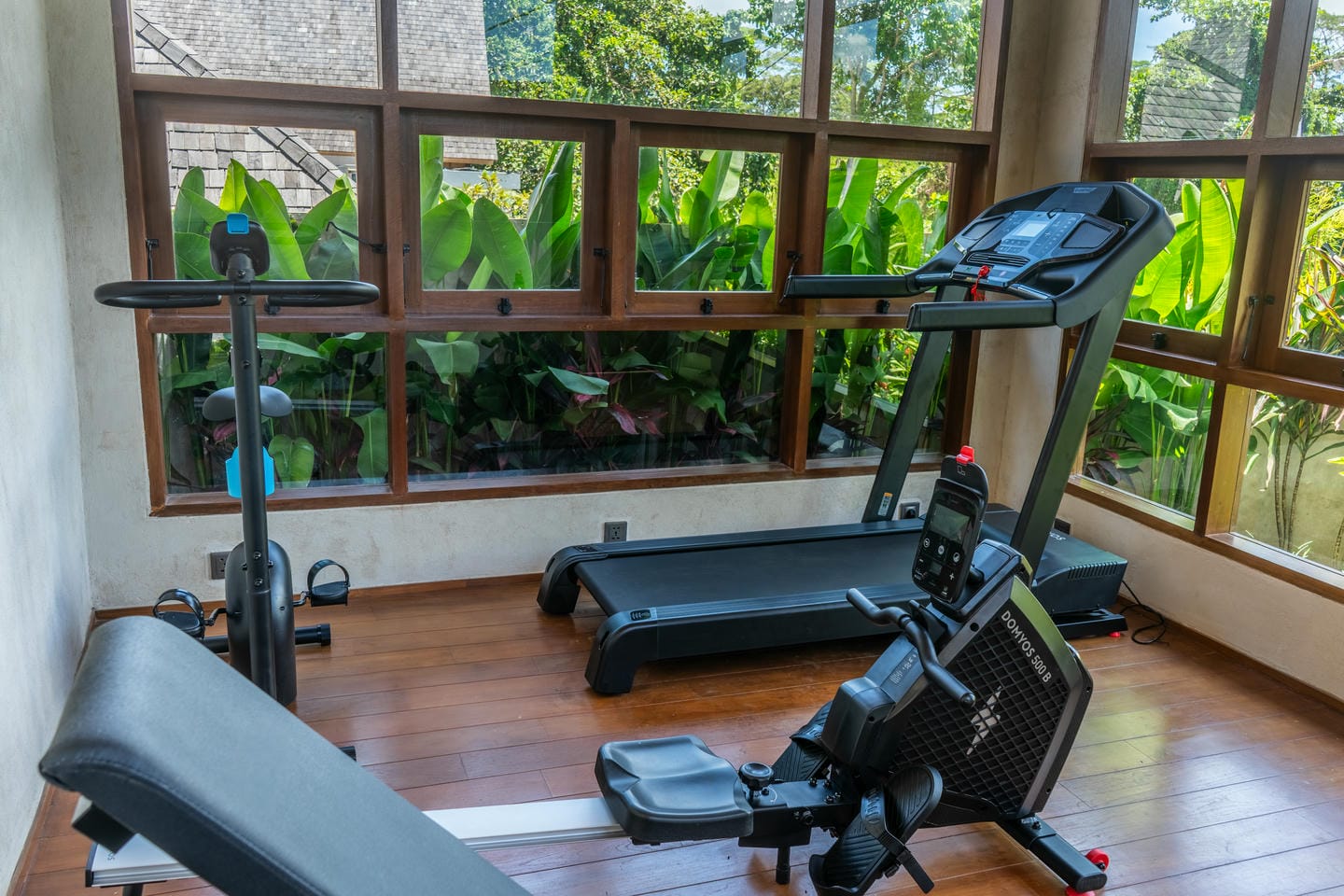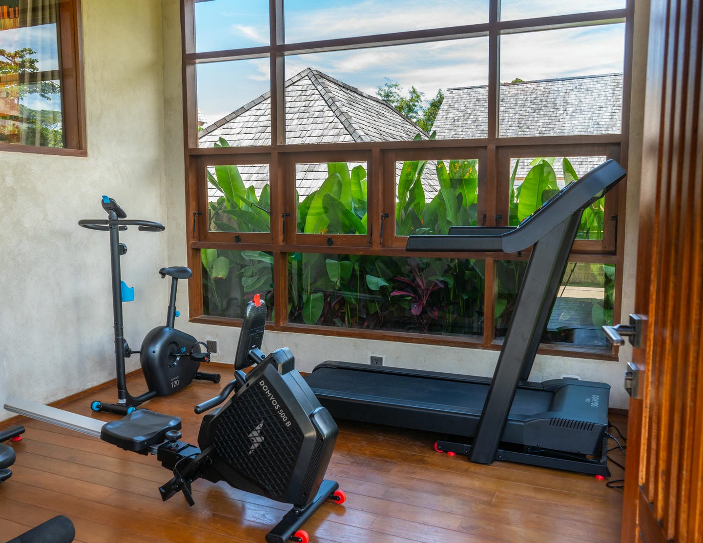 The interior features a modern tropical style, combining natural materials with clean lines. Large wooden-framed windows allow plenty of natural light, creating a bright and airy atmosphere. The villa also includes a private gym area, adding both comfort and functionality to the space.