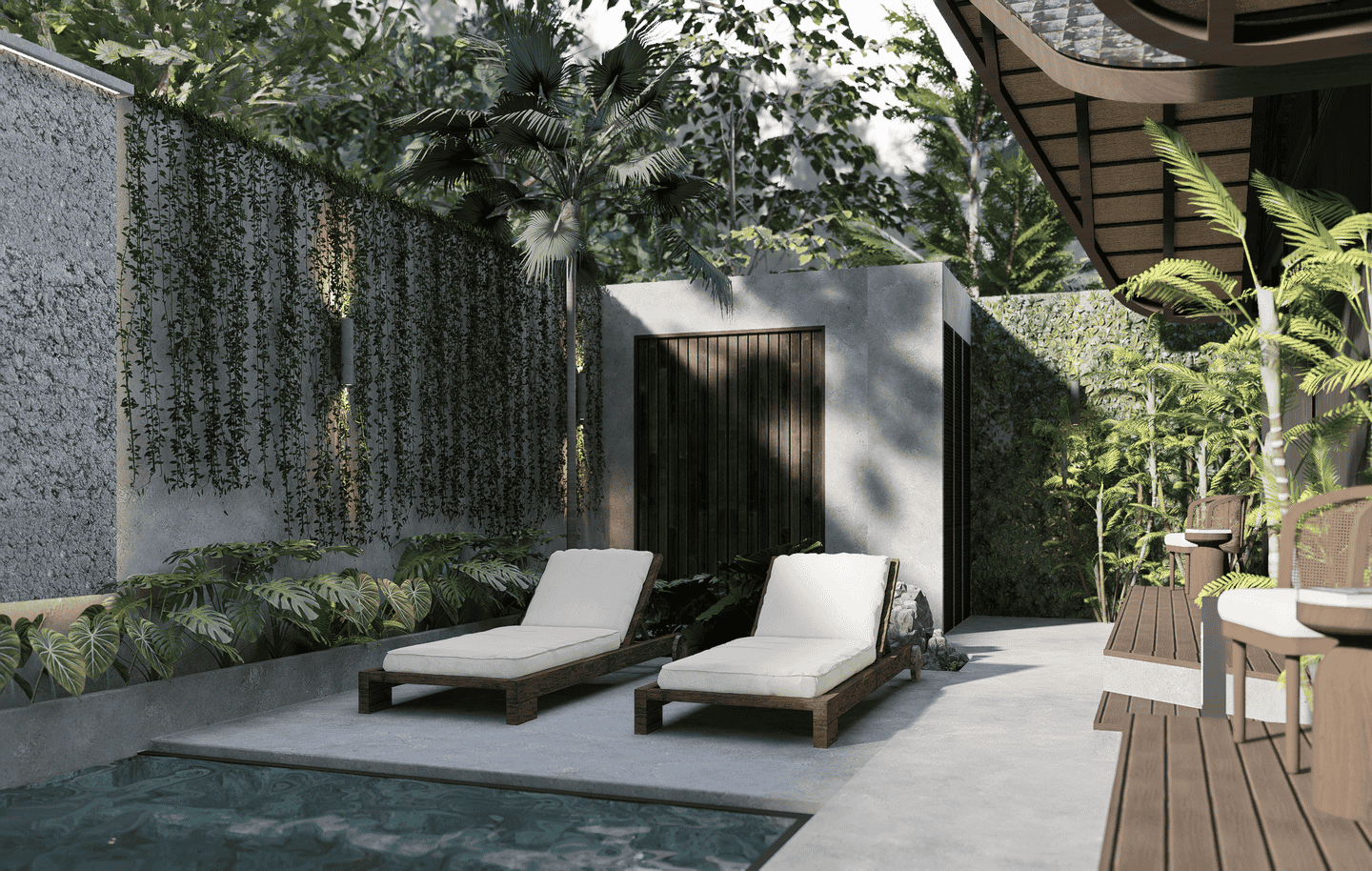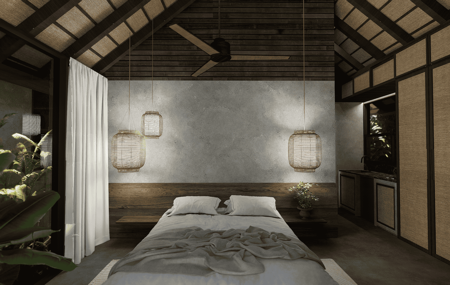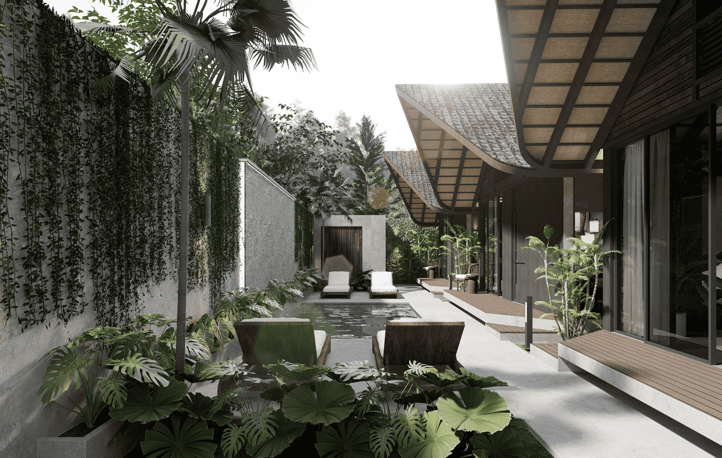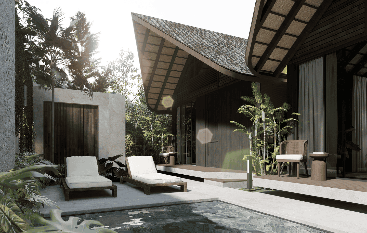 The interiors feature a modern tropical design with strong architectural lines, natural textures, and warm earthy tones. The boutique hotel consists of three one-bedroom units arranged side by side within one compound. Each unit includes one bedroom and one bathroom, designed with an open, airy layout that blends wood, concrete, and soft lighting for a calm and refined atmosphere.