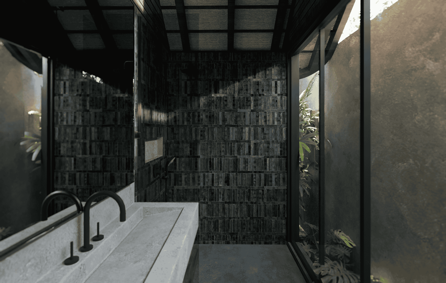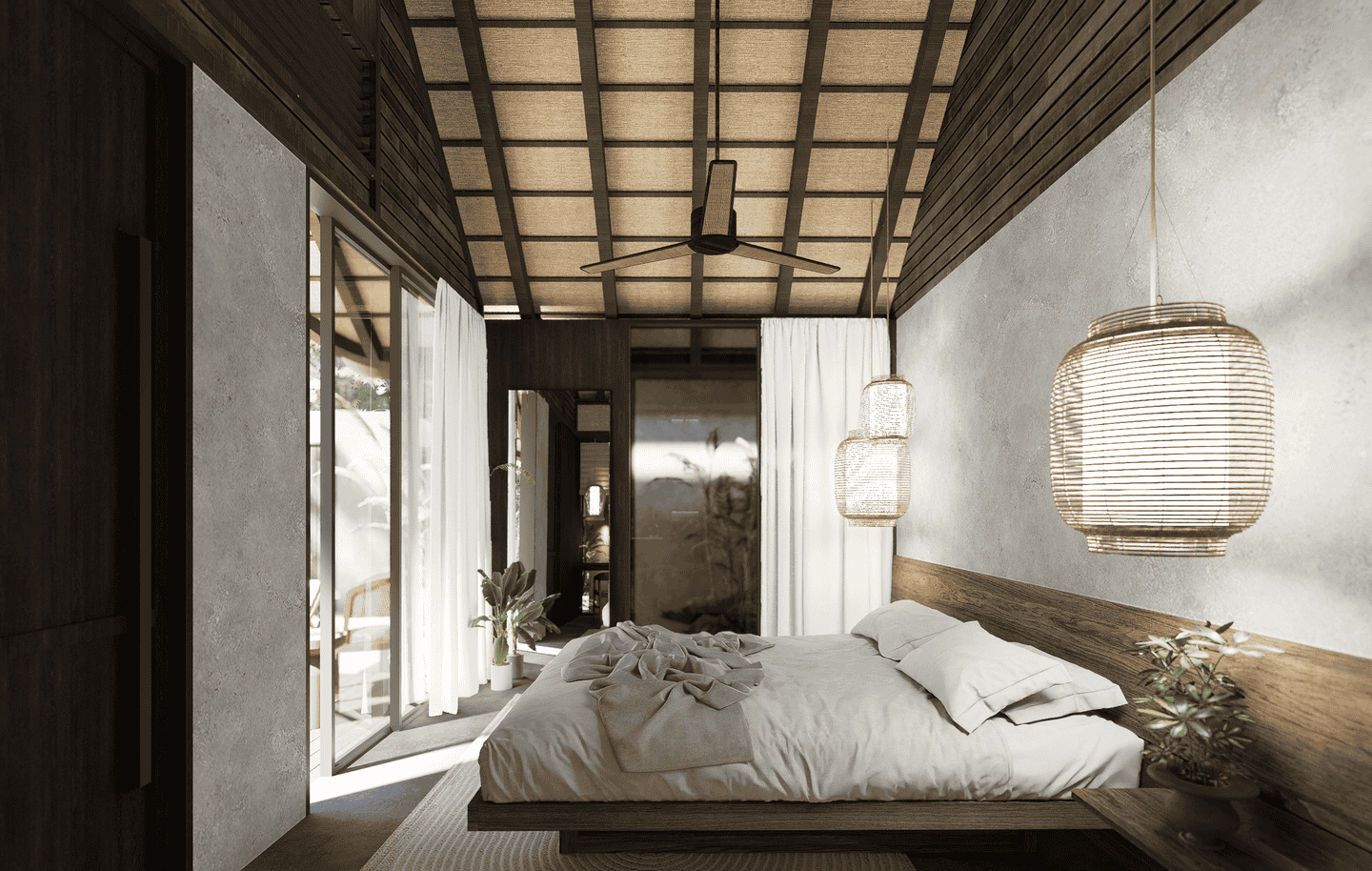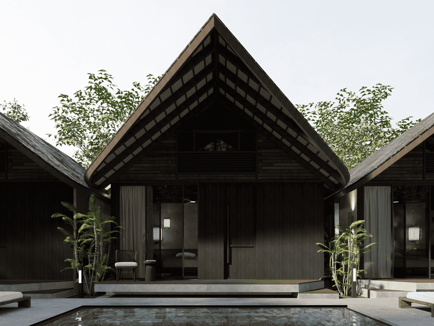 The interiors feature a modern tropical design with strong architectural lines, natural textures, and warm earthy tones. The boutique hotel consists of three one-bedroom units arranged side by side within one compound. Each unit includes one bedroom and one bathroom, designed with an open, airy layout that blends wood, concrete, and soft lighting for a calm and refined atmosphere.