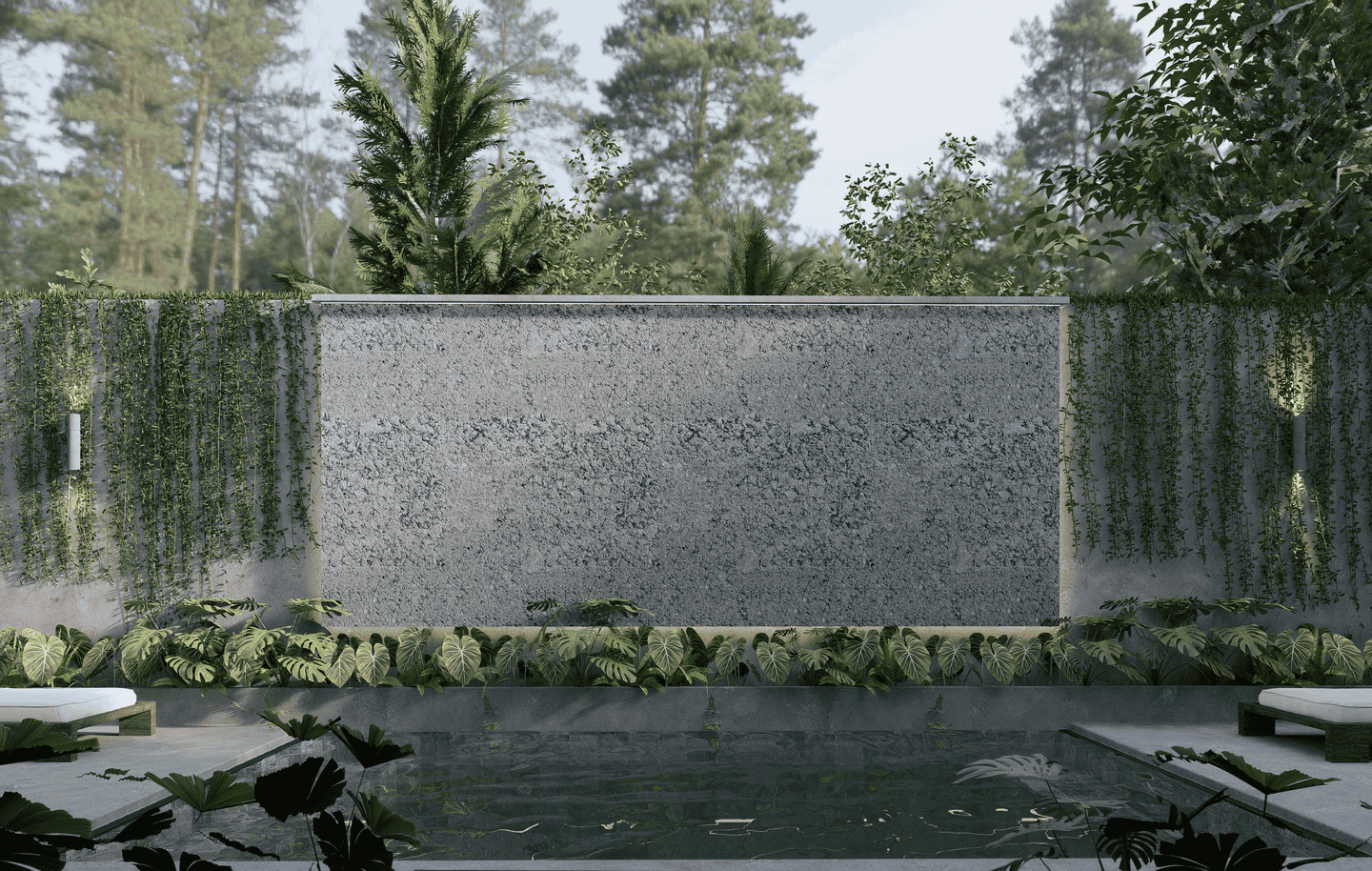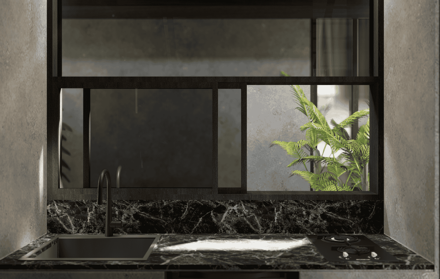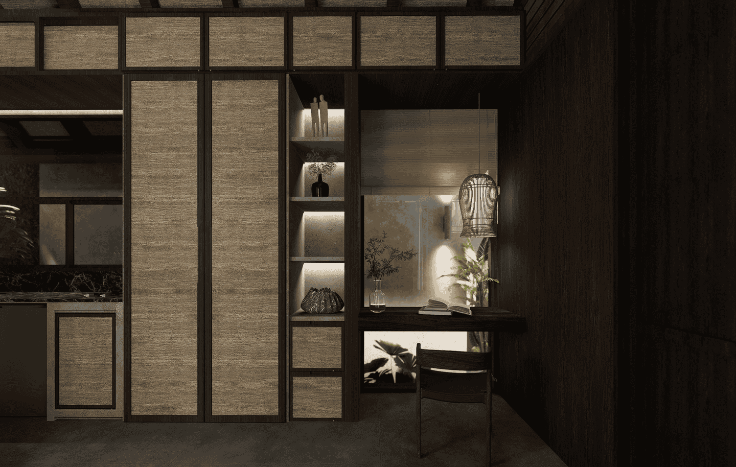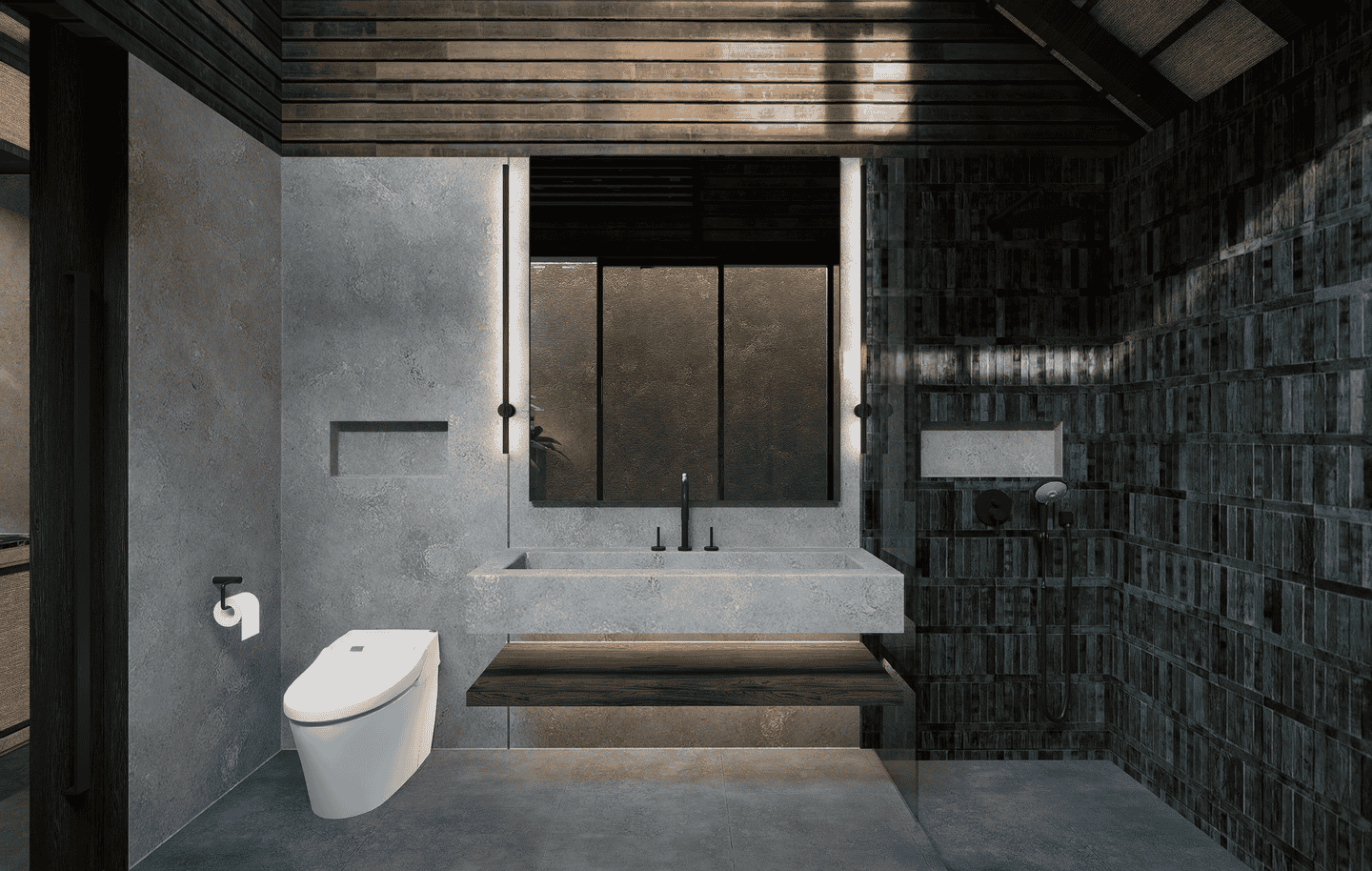 The interiors feature a modern tropical design with strong architectural lines, natural textures, and warm earthy tones. The boutique hotel consists of three one-bedroom units arranged side by side within one compound. Each unit includes one bedroom and one bathroom, designed with an open, airy layout that blends wood, concrete, and soft lighting for a calm and refined atmosphere.