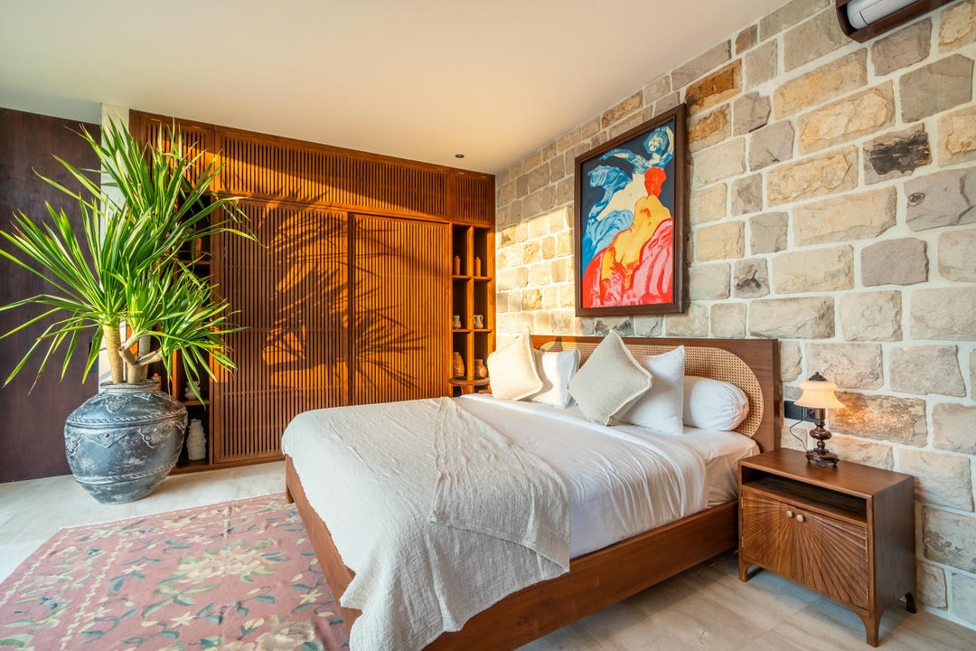 This beautiful 2-level villa features 4 bedrooms with ensuite bathrooms, including a master bedroom with a bathtub and an optional semi-outdoor shower for a touch of tropical charm. The enclosed living room with high ceiling windows creates a bright, airy atmosphere, while the kitchen and dining area are perfect for gatherings with family and friends.