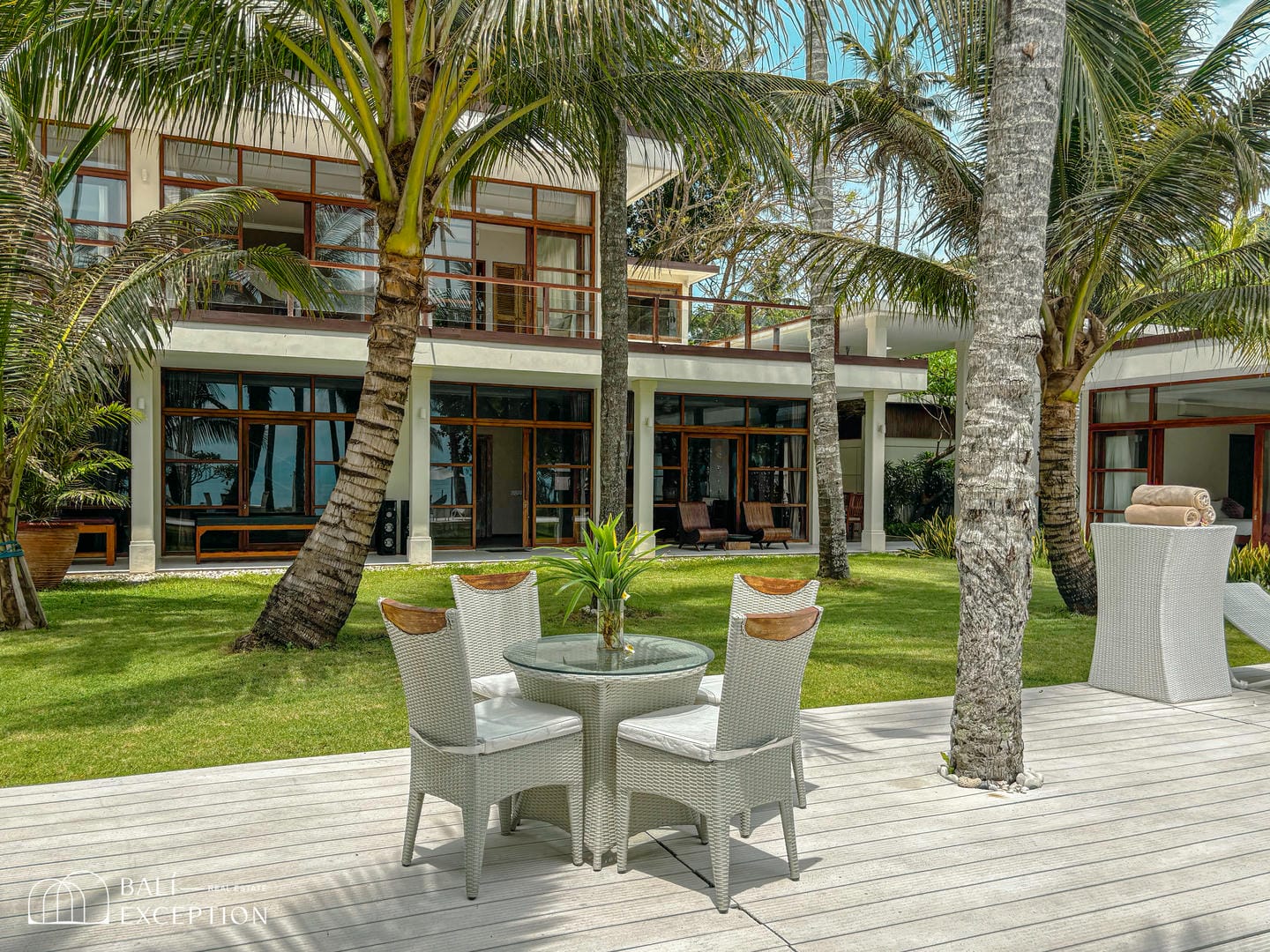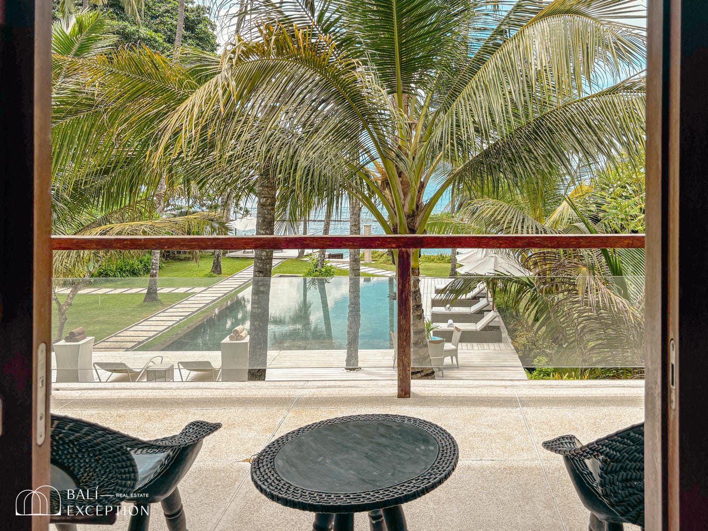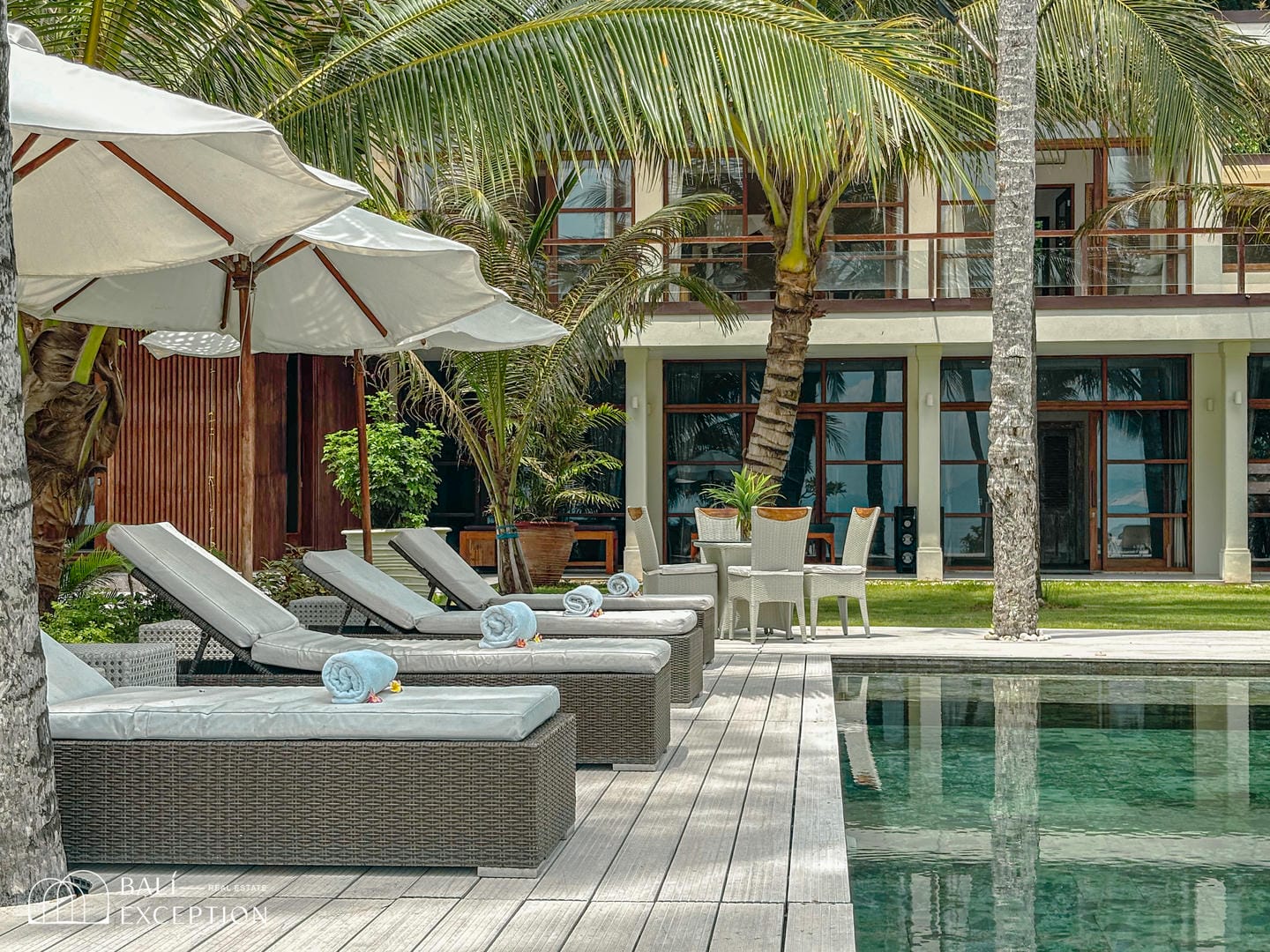 Step outside into a spacious outdoor area surrounded by coconut trees, offering direct access to the beach and a truly tropical Balinese experience. This villa features a private swimming pool with a wooden deck and comfortable lounge chairs, perfect for relaxing under the sun.