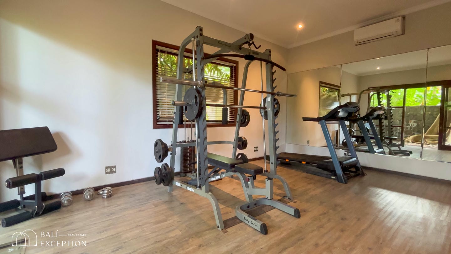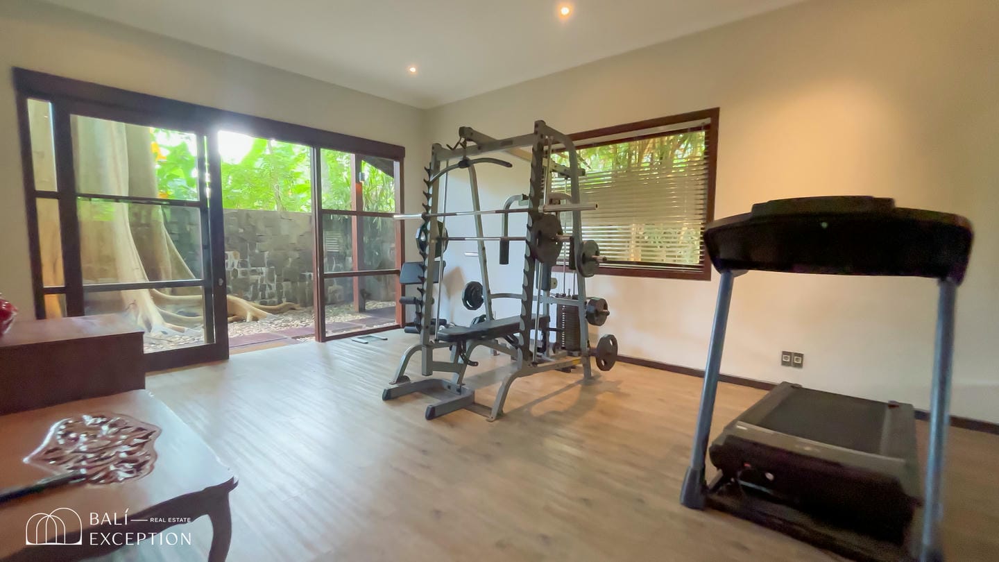 This spacious villa sits on 2,000 sqm of land and features a modern tropical design blended with traditional Balinese touches. Large windows and high ceilings allow abundant natural light, creating a bright and airy atmosphere. The villa offers a fully equipped kitchen with a large dining area, a private gym, and a billiard table, spread across two levels. It comes with 4 generous bedrooms and 8 bathrooms, all designed with an open-space concept that seamlessly connects indoor living with the natural surroundings.