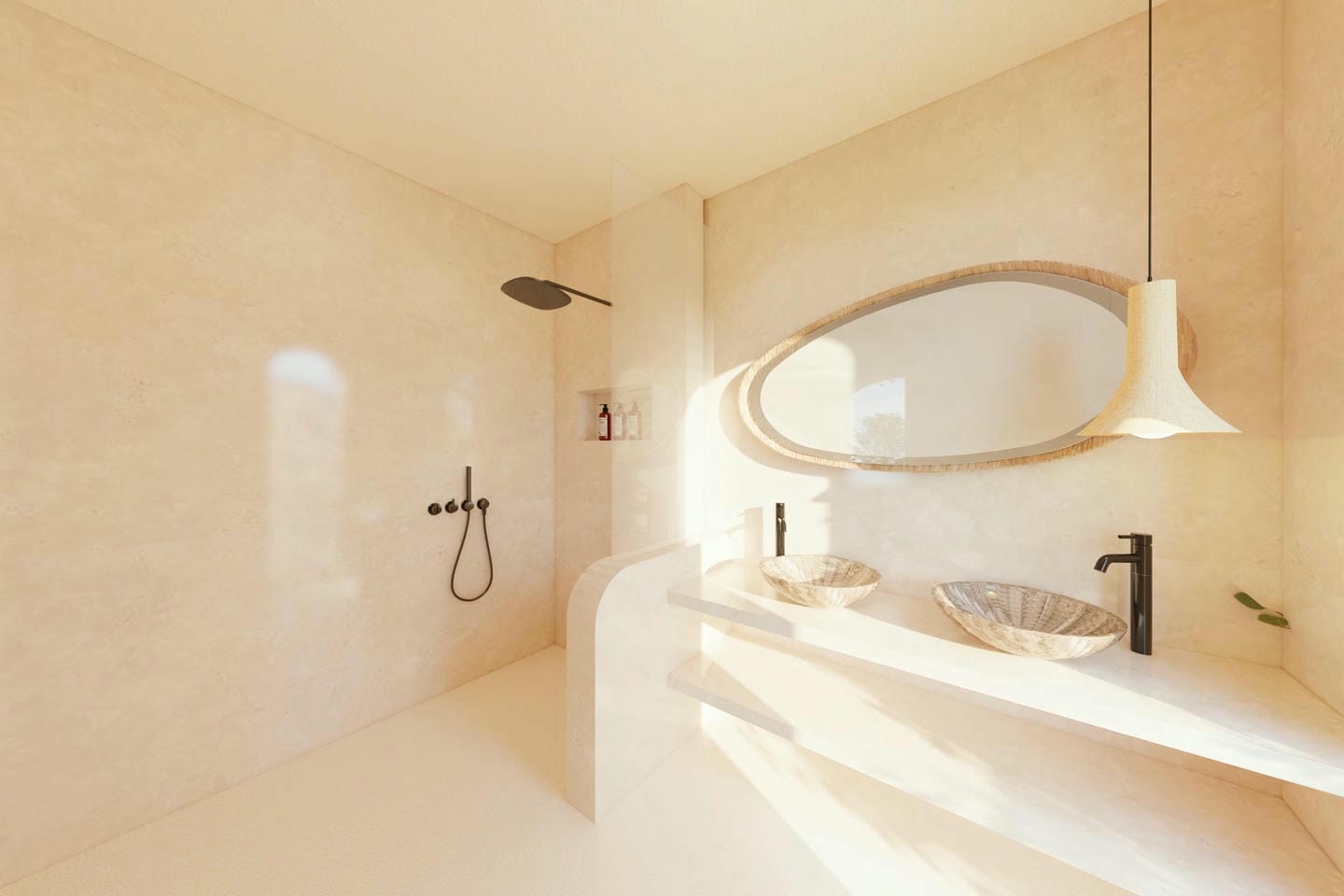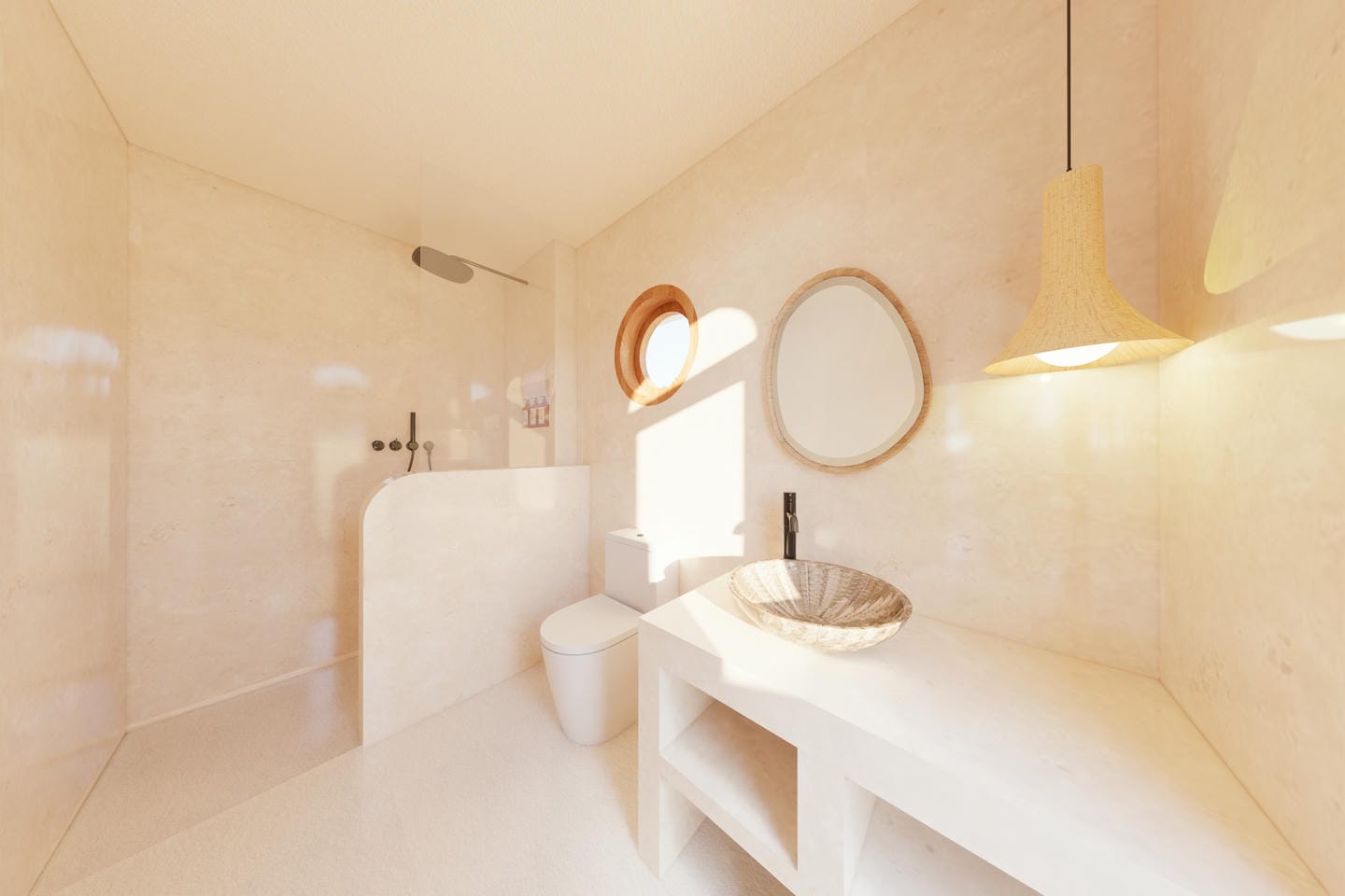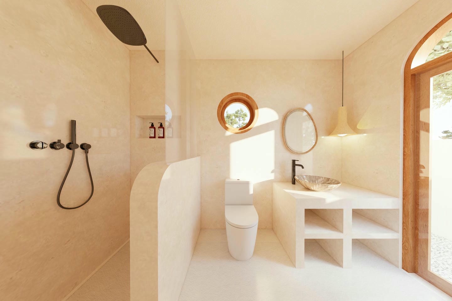 As soon as you step through the gate, you’re welcomed into a lush tropical garden with a swimming pool, and an inviting pergola lounge area, an ideal place to relax in complete privacy, surrounded by greenery. A stone path leads you to the open-plan living room, fully open to the garden and oriented toward the sunset view. The space immediately impresses with its natural light and high ceilings, creating a sense of openness and calm. Behind the living area lies a modern kitchen with a central island, fully equipped and designed with soft, rounded shapes and arched windows, adding a warm, tropical character to the space. On the ground floor, there is also a bathroom adjacent to the living area, which can conveniently be accessed directly from the garden after a refreshing swim. A staircase leads to the first floor, where the bedroom opens onto large bay windows offering stunning sunset views over the hills and surrounding greenery. The room includes its own ensuite bathroom, blending comfort and simplicity in a serene, nature-filled atmosphere.