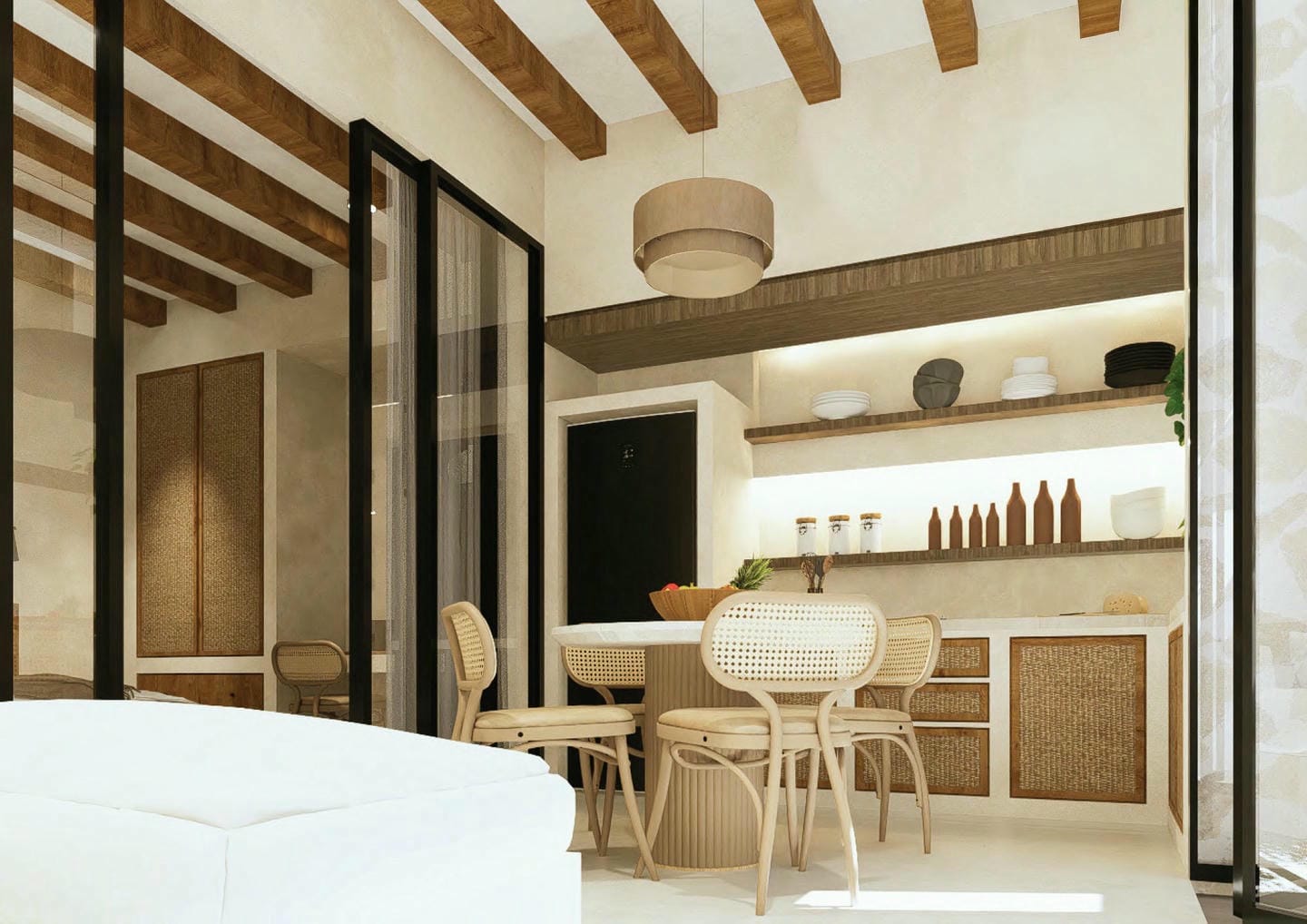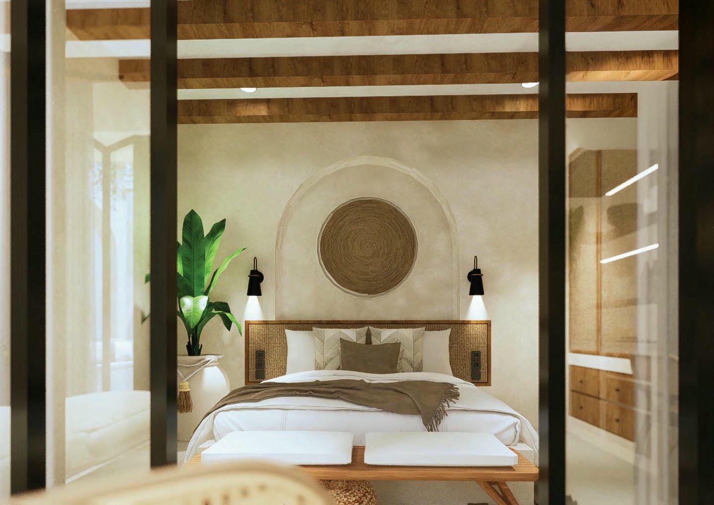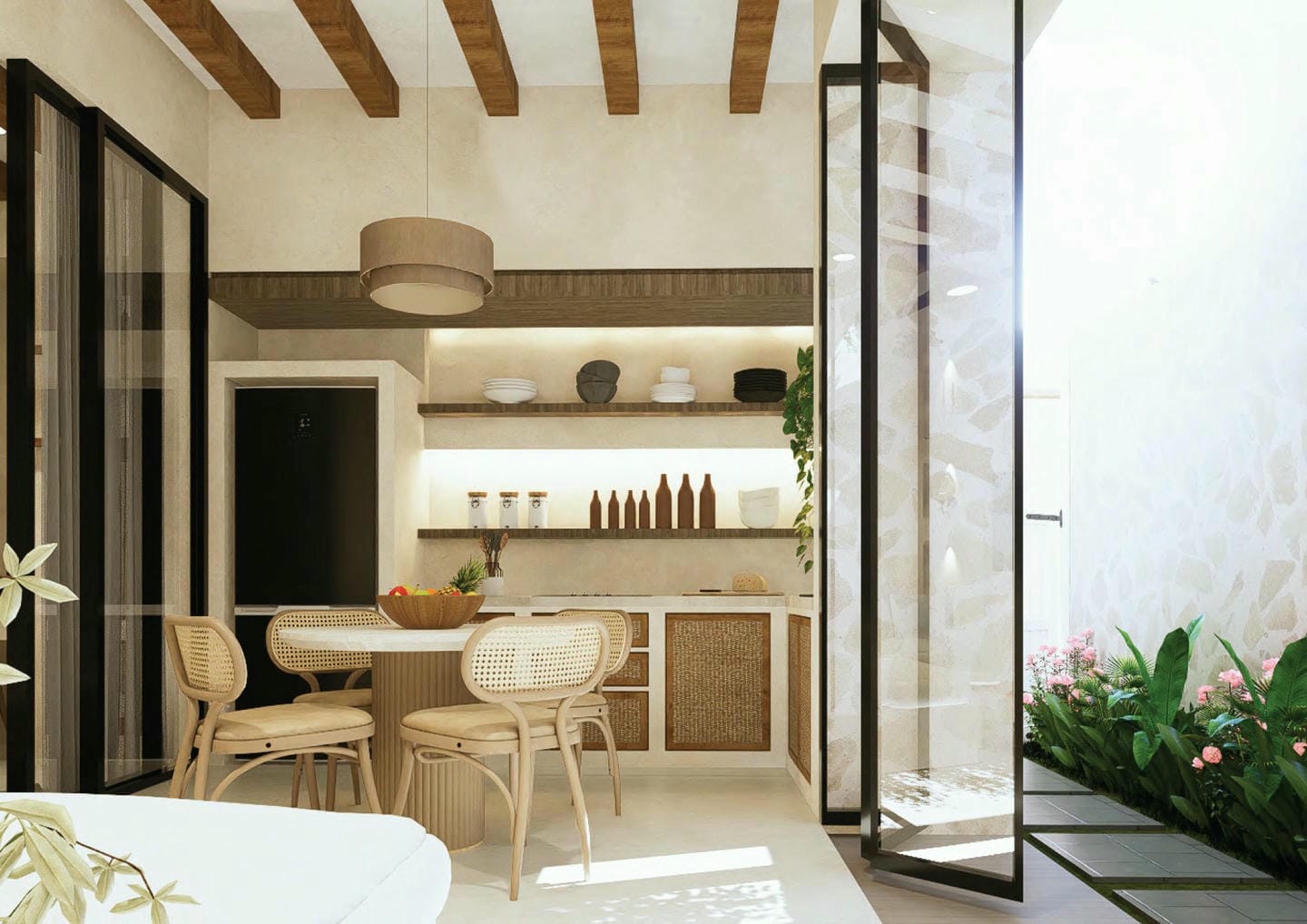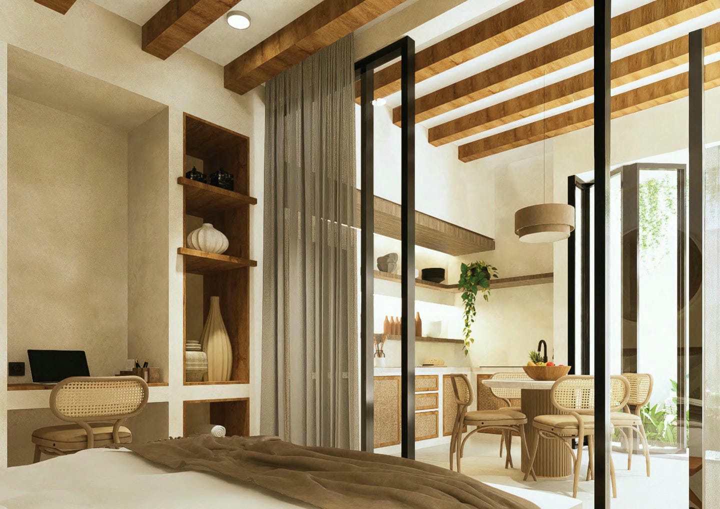 The one-bedroom villas are built on approximately 60 sqm of land with a 45 sqm living area. They feature a comfortable bedroom with an en-suite bathroom, an integrated wardrobe, a fully equipped kitchen, and an open-plan living area. A dedicated working station is included, making the layout ideal for remote working and long-term stays. Each villa is delivered fully furnished and ready to live in, with a design that prioritizes functionality and ease of living.