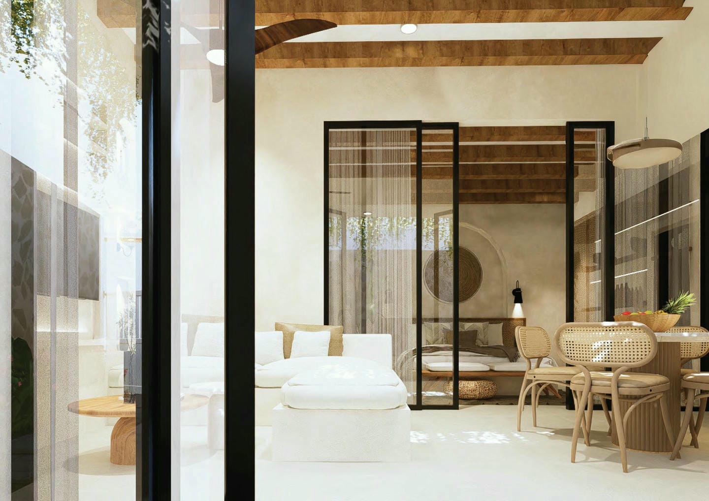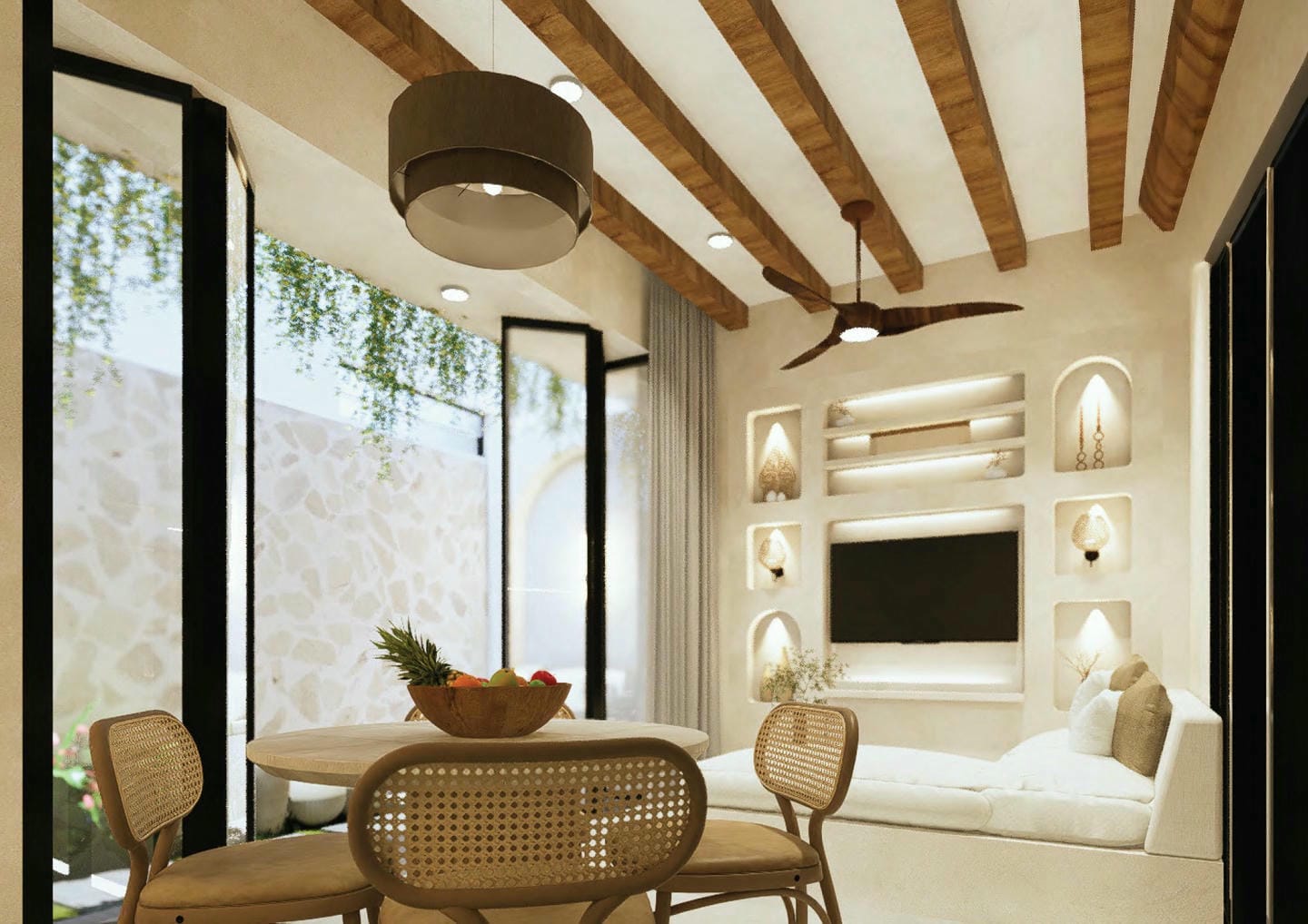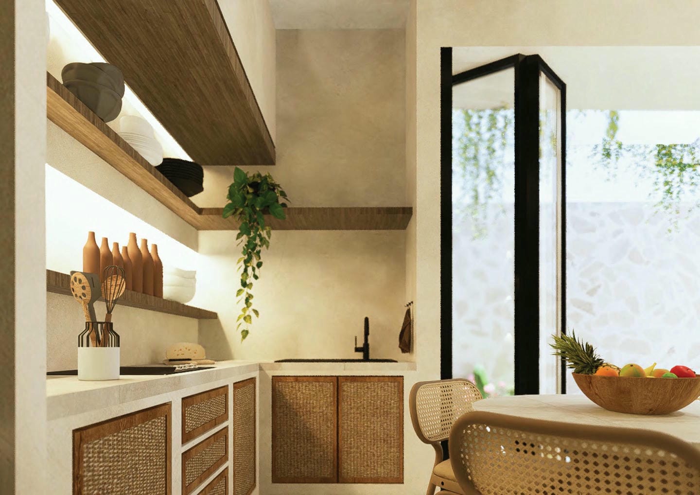 The one-bedroom villas are built on approximately 60 sqm of land with a 45 sqm living area. They feature a comfortable bedroom with an en-suite bathroom, an integrated wardrobe, a fully equipped kitchen, and an open-plan living area. A dedicated working station is included, making the layout ideal for remote working and long-term stays. Each villa is delivered fully furnished and ready to live in, with a design that prioritizes functionality and ease of living.