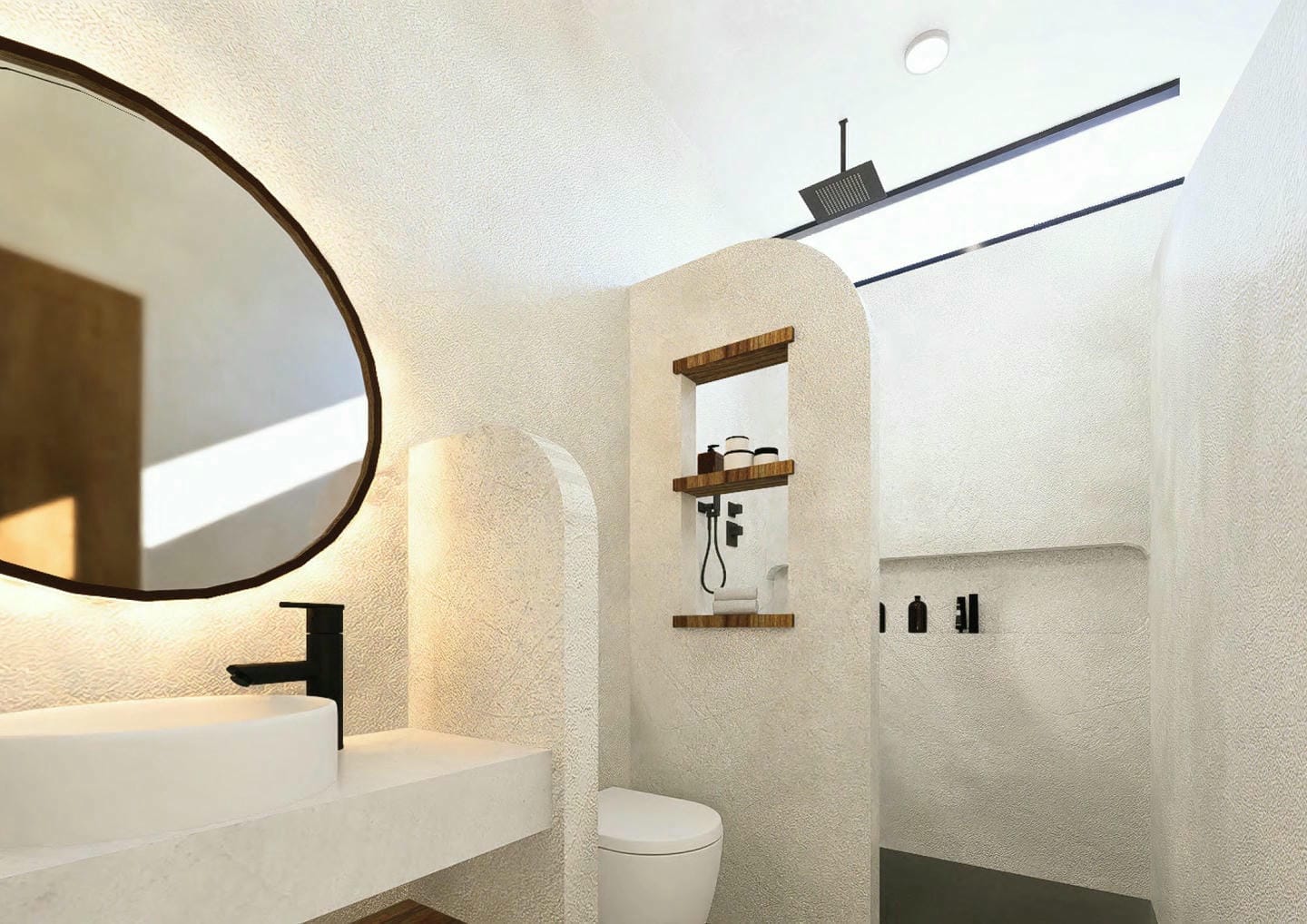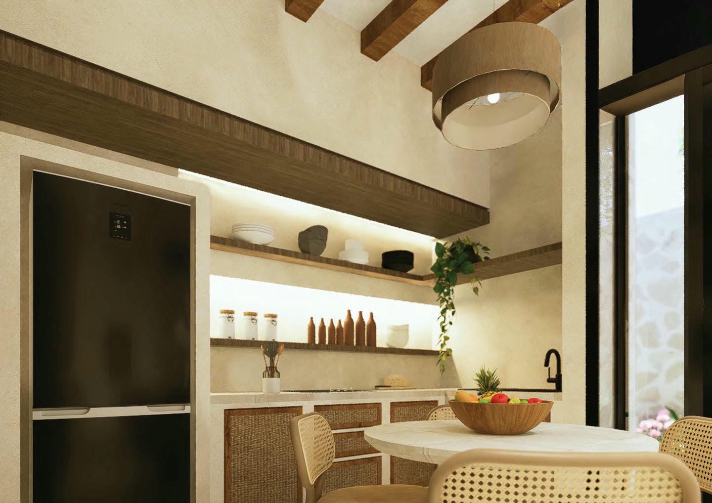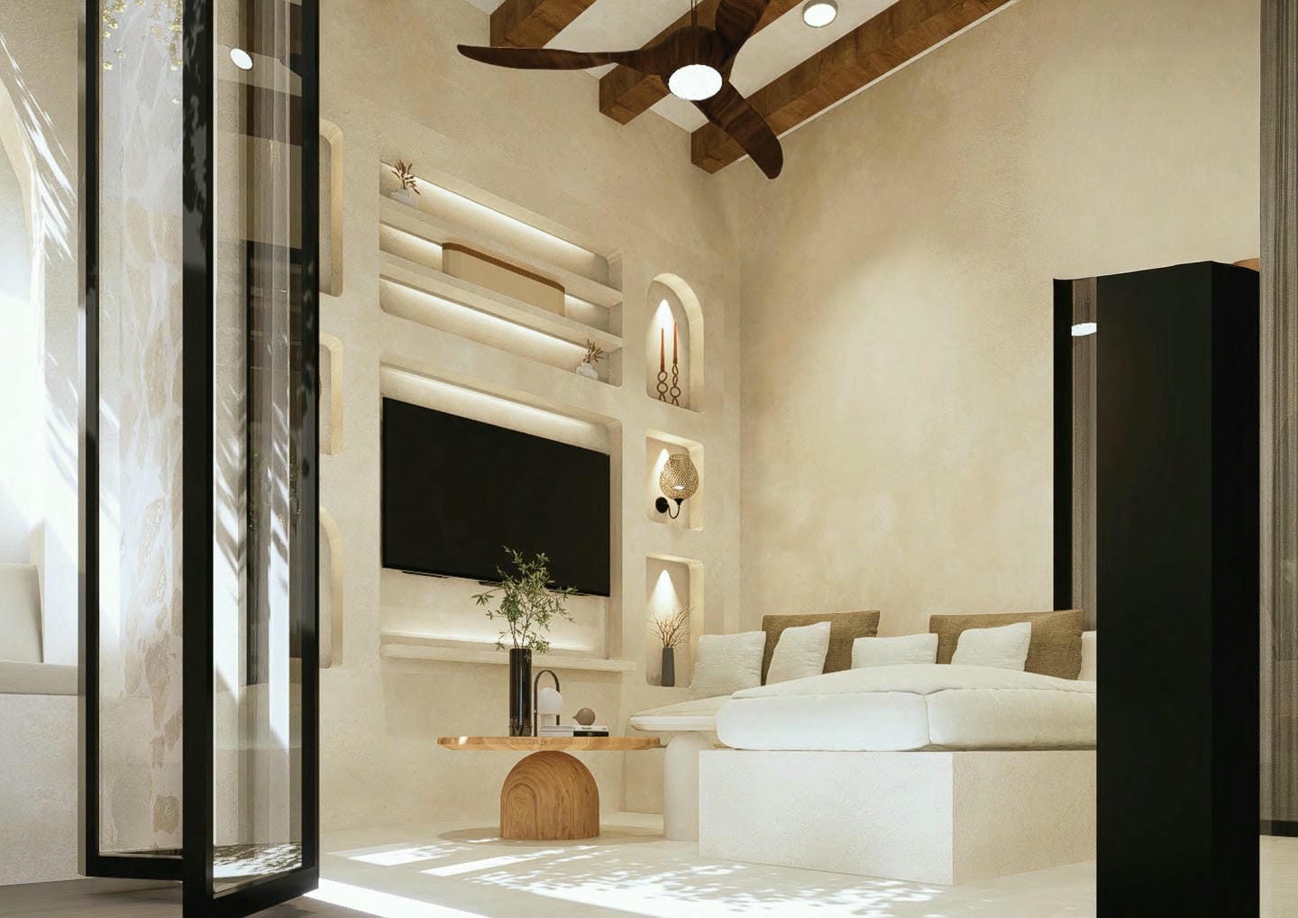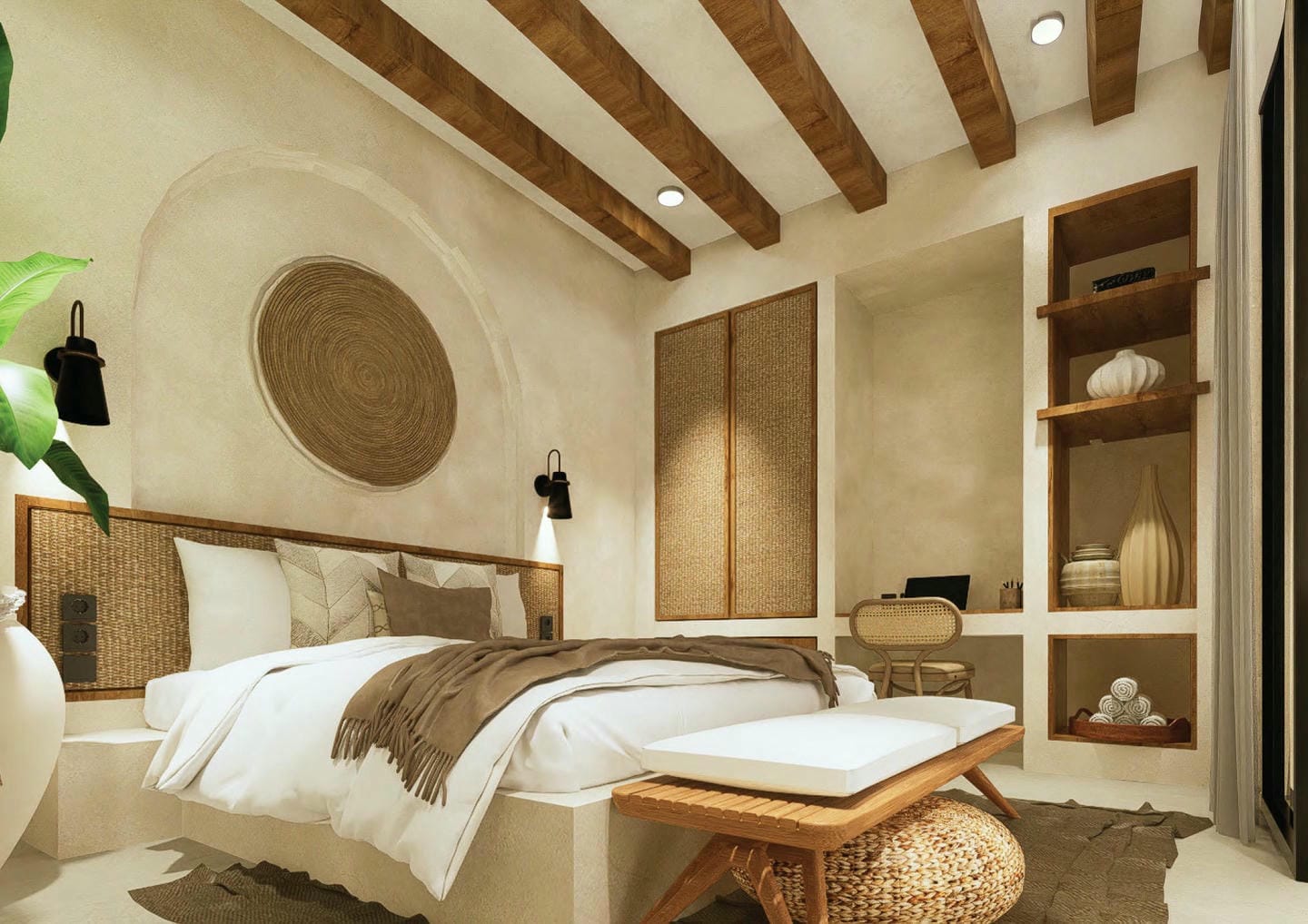 The one-bedroom villas are built on approximately 60 sqm of land with a 45 sqm living area. They feature a comfortable bedroom with an en-suite bathroom, an integrated wardrobe, a fully equipped kitchen, and an open-plan living area. A dedicated working station is included, making the layout ideal for remote working and long-term stays. Each villa is delivered fully furnished and ready to live in, with a design that prioritizes functionality and ease of living.