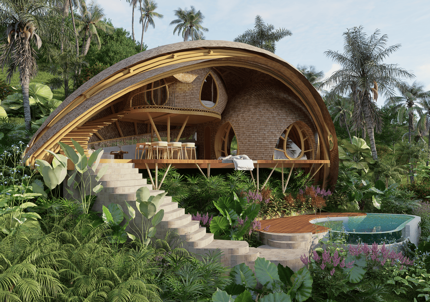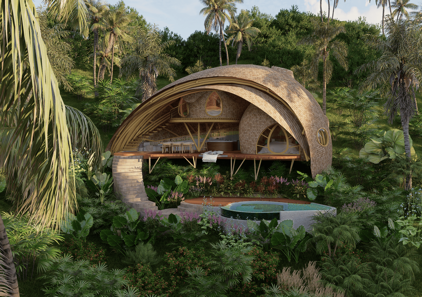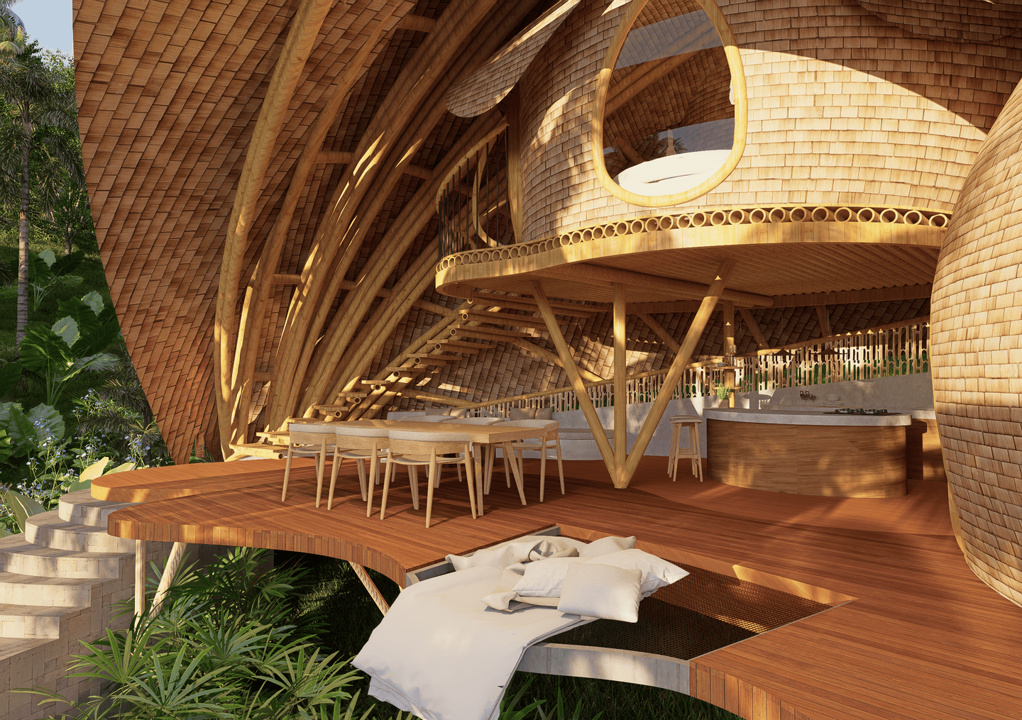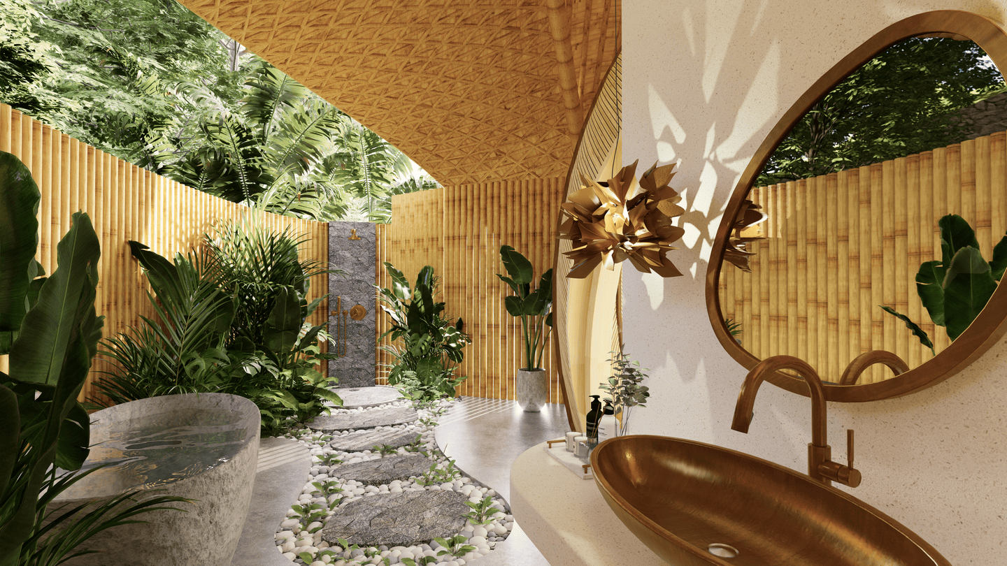A masterpiece of sustainable design, the villa blends flowing curves and natural materials with the surrounding landscape. Sunlight fills airy interiors, while gentle breezes flow freely, creating a calm, restorative atmosphere. The terrace opens to sweeping valley views, complete with a hanging net for lounging, and the open kitchen turns every meal into a sensory experience amid lush greenery. The master bedroom, tucked beneath a bamboo arch, and its garden-like bathroom balance privacy and openness, while the loft bedroom above offers a cozy, elevated retreat.