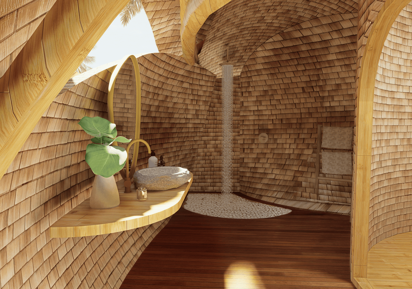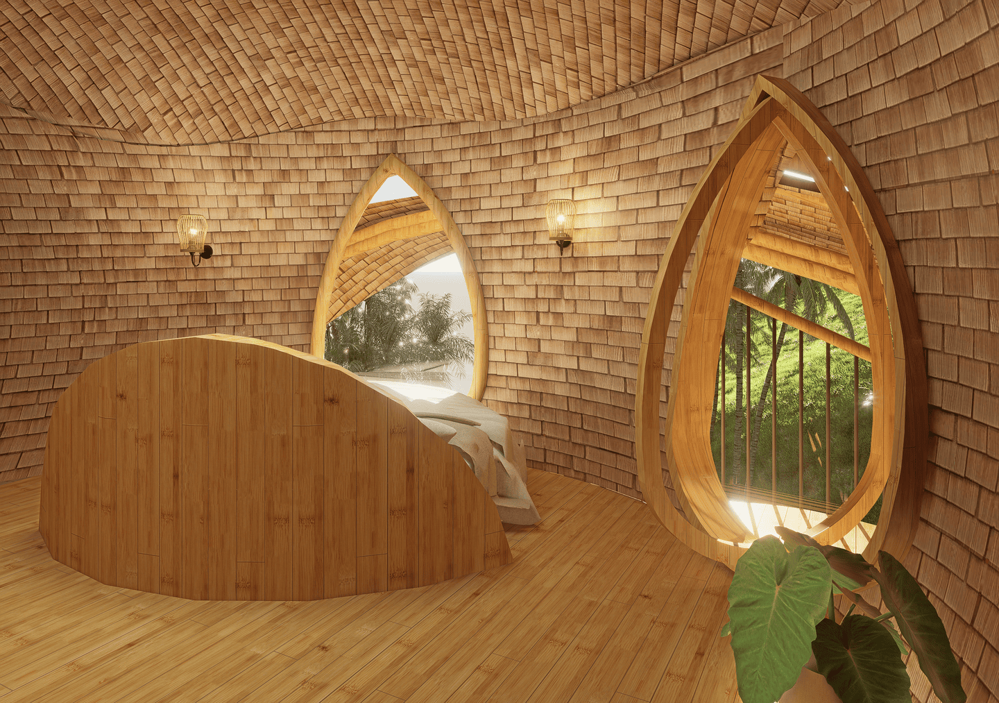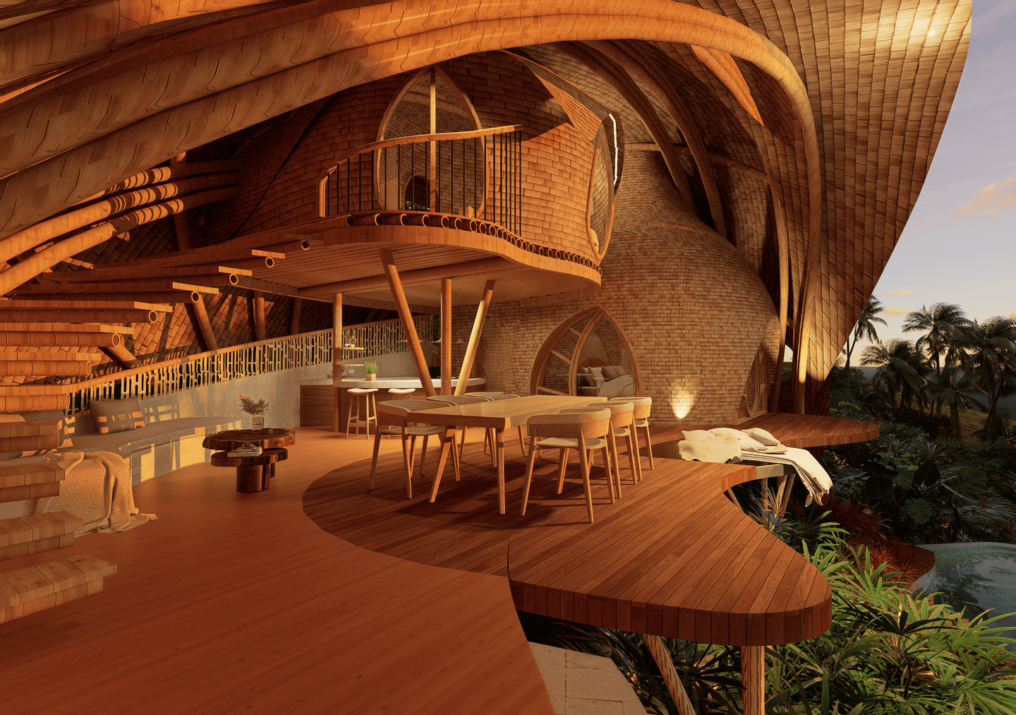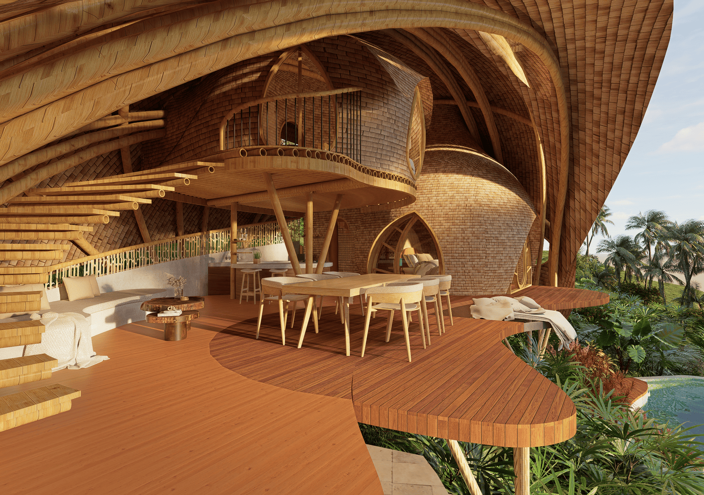 A masterpiece of sustainable design, the villa blends flowing curves and natural materials with the surrounding landscape. Sunlight fills airy interiors, while gentle breezes flow freely, creating a calm, restorative atmosphere. The terrace opens to sweeping valley views, complete with a hanging net for lounging, and the open kitchen turns every meal into a sensory experience amid lush greenery. The master bedroom, tucked beneath a bamboo arch, and its garden-like bathroom balance privacy and openness, while the loft bedroom above offers a cozy, elevated retreat.