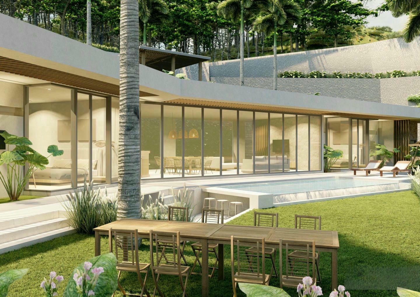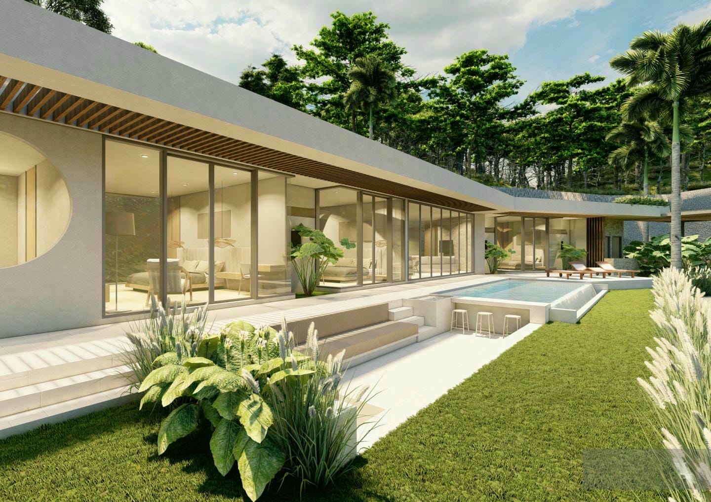 Modern villa with pool and lush garden view.