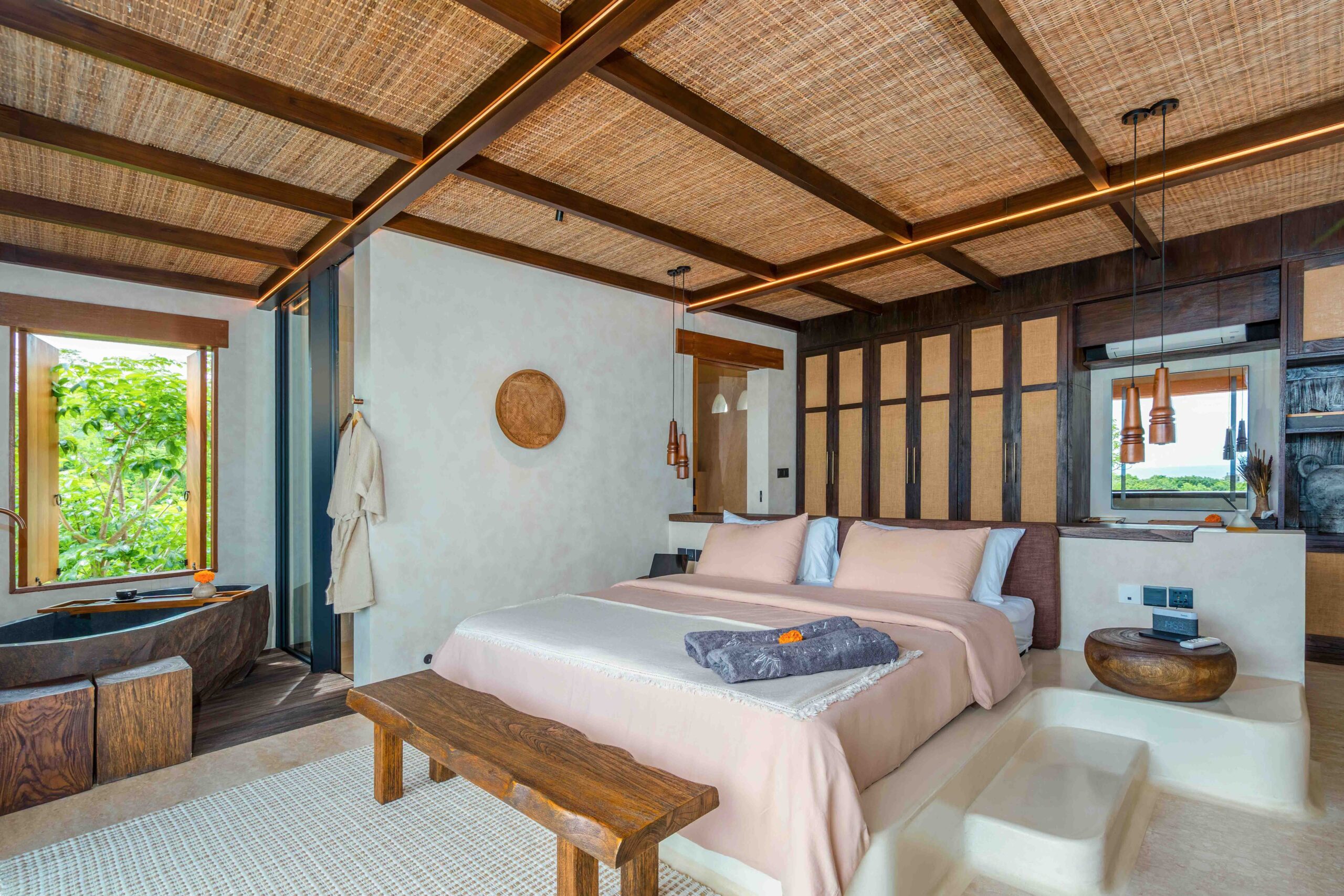 Outdoors, the villa features expansive terraces, lush landscaping, and a stunning curved swimming pool overlooking the ocean. Every main space, including the bedrooms, captures sweeping sea views framed by vibrant greenery.
