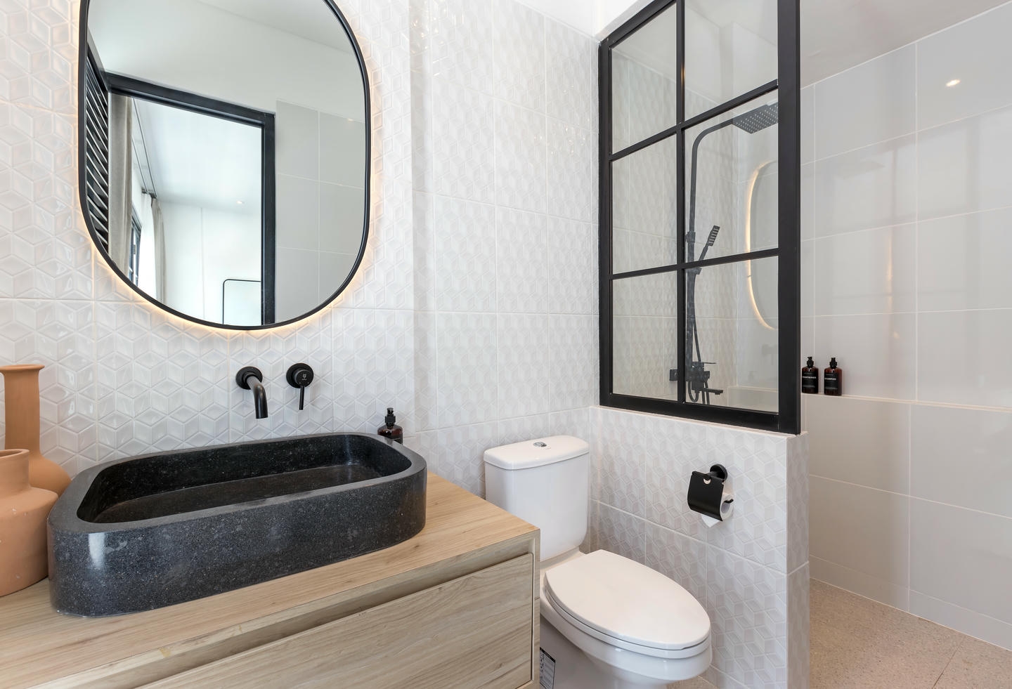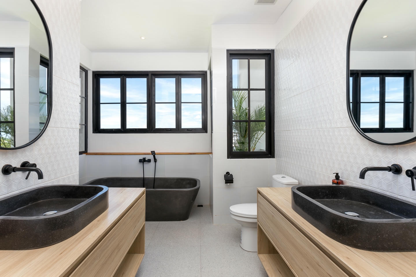 - Three Spacious Bedrooms: This three-story modern villa features three large bedrooms and three bathrooms, offering ample space for comfort and convenience.