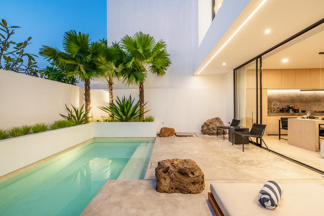 - Private Pool: Step outside to enjoy a private pool accompanied by a comfortable lounge bed and chair, perfect for relaxation and entertainment.