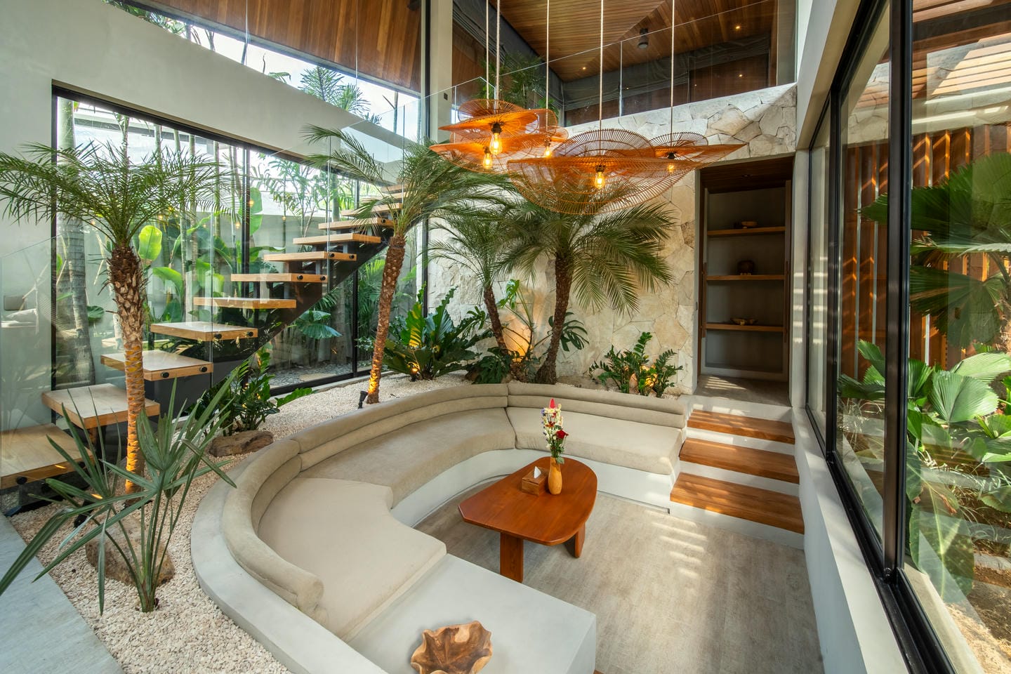 Designed with a blend of tropical and modern aesthetics, this fully furnished villa features tasteful décor, four bedrooms each with its own ensuite bathroom, including a master bathroom with a luxurious bathtub. It also offers a cozy sunken living area, a dining space, and a fully equipped kitchen. Large glass doors flood the space with natural light and offer views of the private pool, creating an indoor-outdoor living experience.
