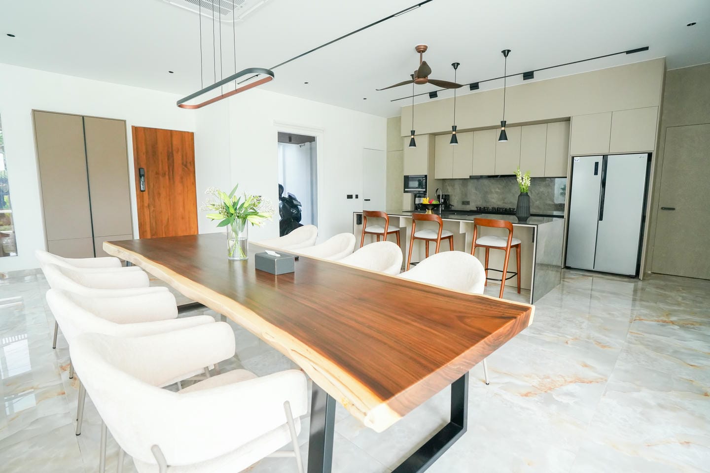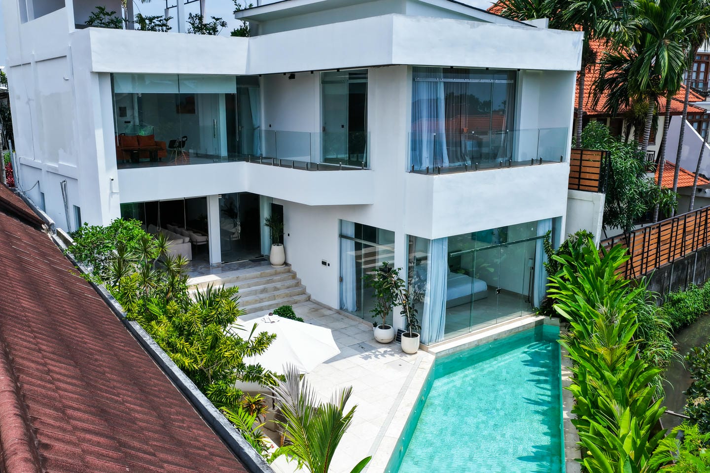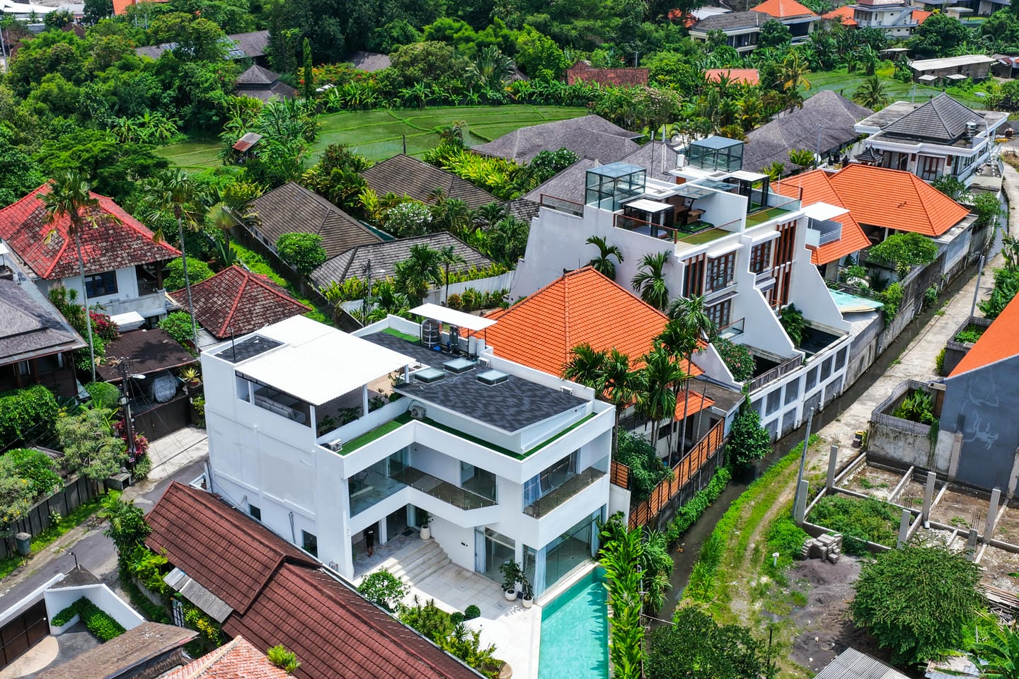 Discover luxury living in the heart of Canggu with this stunning villa, ideally situated in a tranquil residential area yet just moments away from vibrant cafes and restaurants. This modern tropical villa boasts a generous 380 m² of living space on a 405 m² plot. Inside, you'll find an expansive kitchen and living area, divided into a stylish lounge and a gourmet kitchen. The villa offers 4 elegant bedrooms plus an additional staff room, each with its own en-suite bathroom. Enjoy ultimate relaxation with a large 50 m² private pool, beautifully landscaped garden, and dedicated relaxation area. The property also features a chic rooftop, perfect for entertaining. This villa is not only a dream home but also a smart investment opportunity with excellent ROI potential.