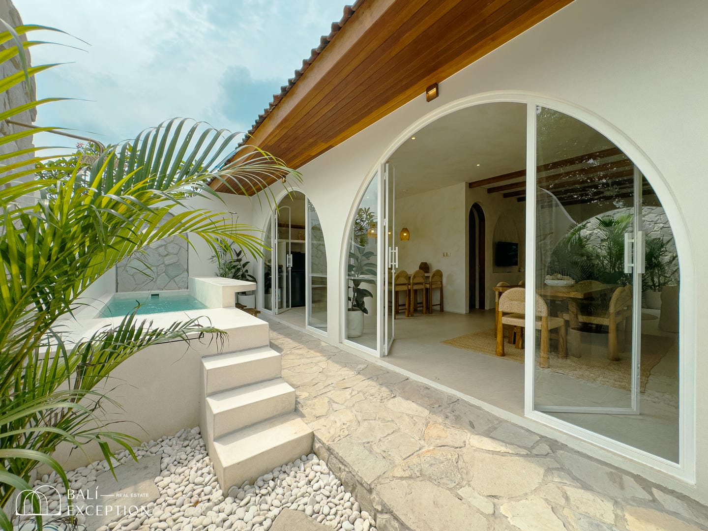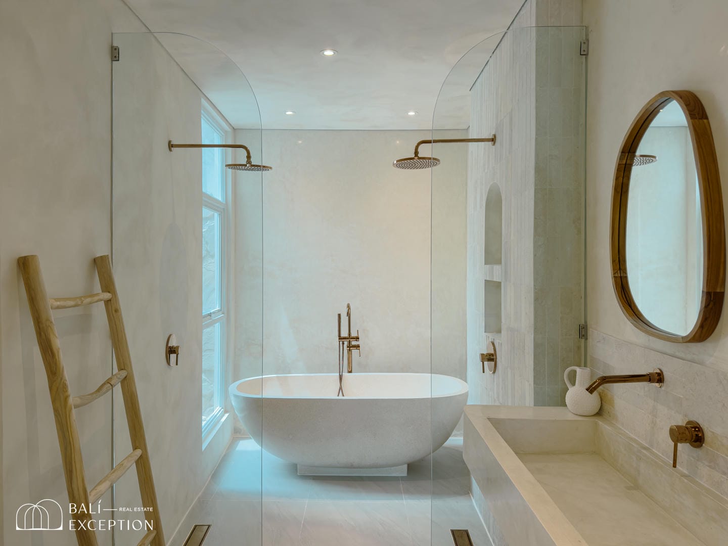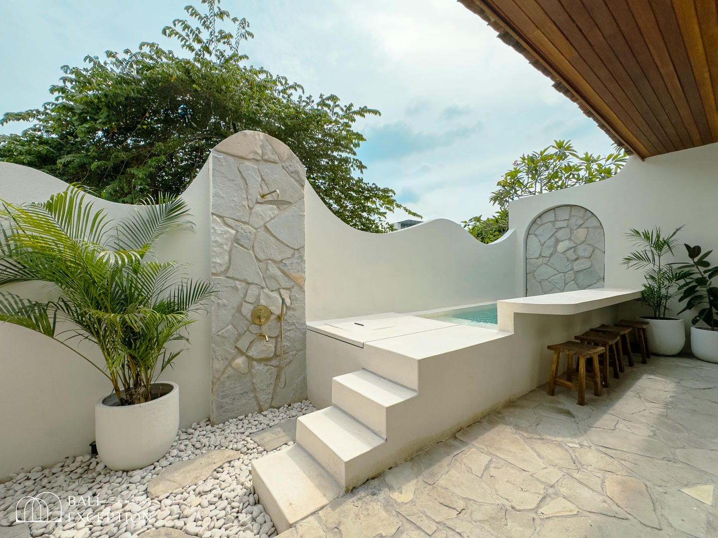Step outside to a private plunge pool and lounge area, perfect for relaxing in Bali’s tropical climate.