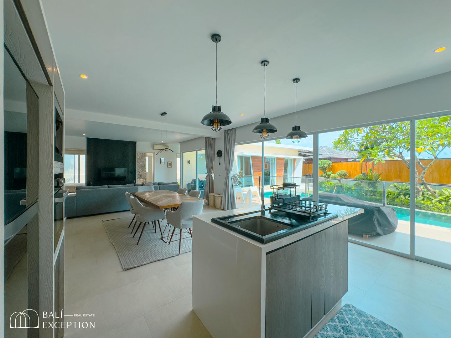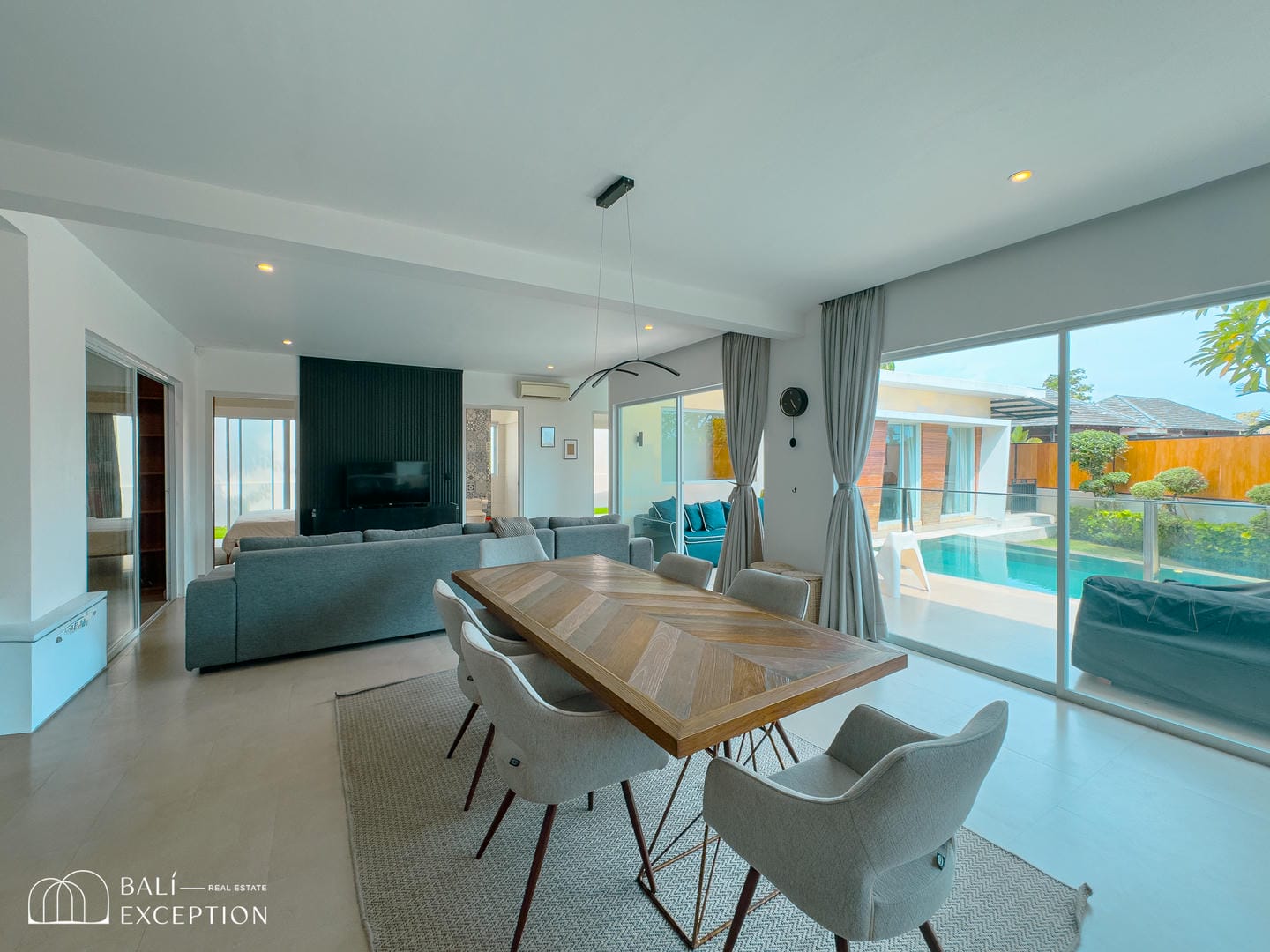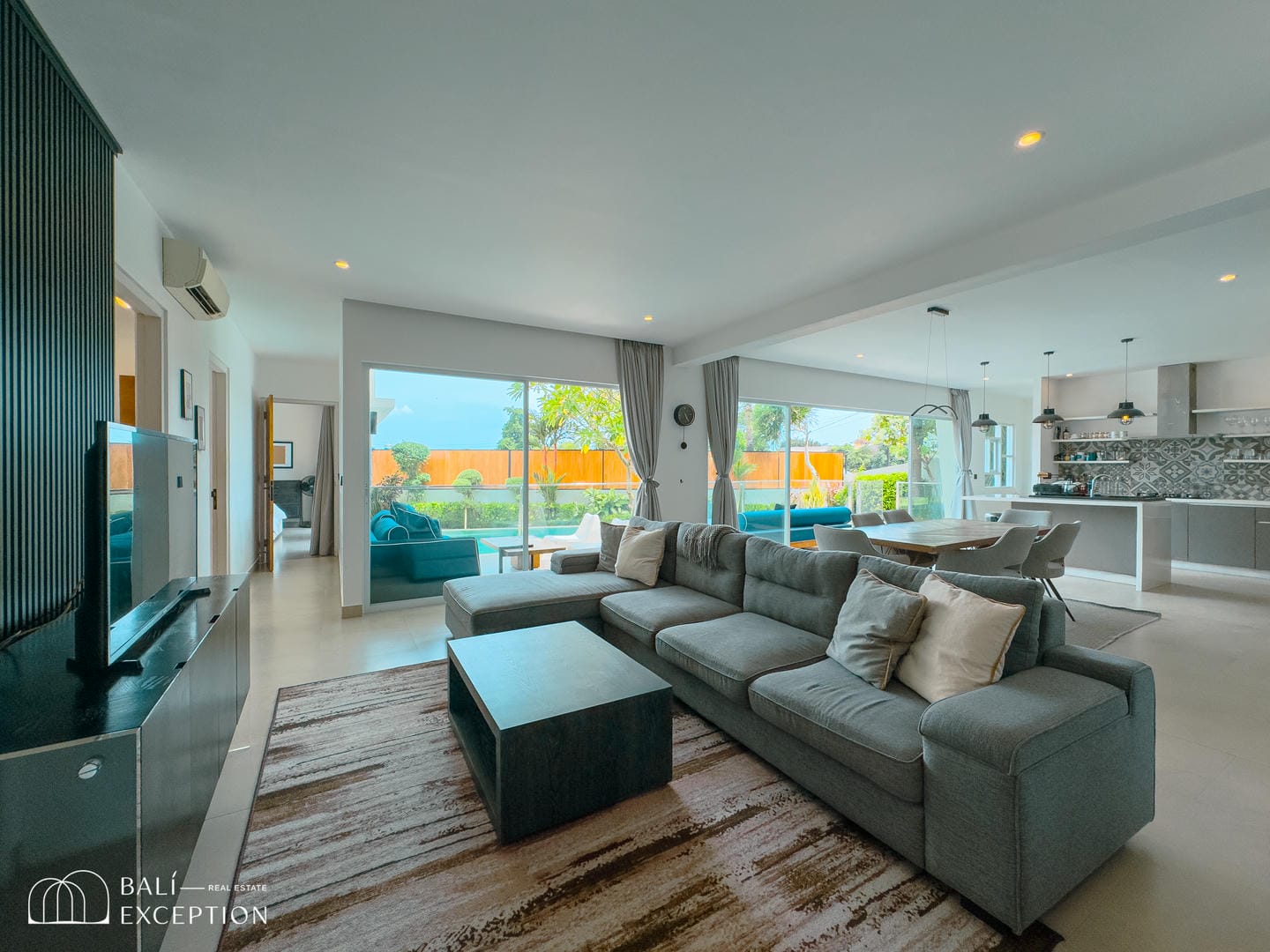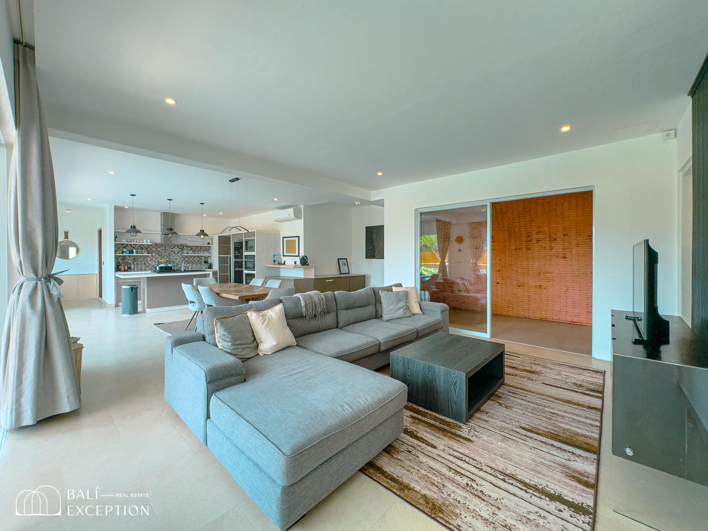 This villa offers a bright open-plan interior that seamlessly connects the living, dining, and kitchen areas into one spacious and comfortable living space. Large sliding glass doors fill the home with natural light and provide direct access to the outdoor area. The villa features one main bedroom, a children’s bedroom, two bathrooms, and a dedicated kids’ play area, making it an ideal home for families. Modern furnishings and clean, neutral tones create a stylish and welcoming atmosphere throughout.