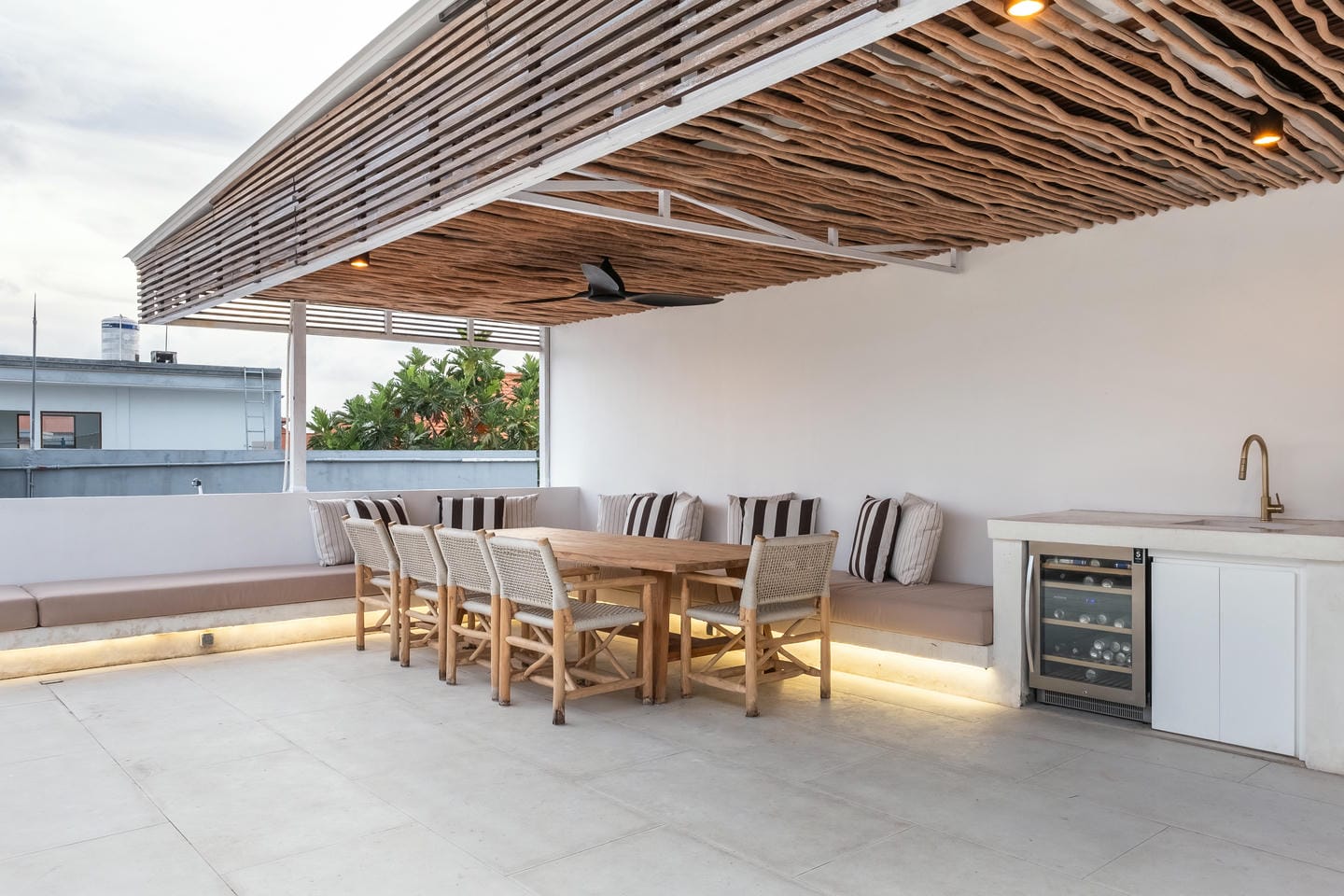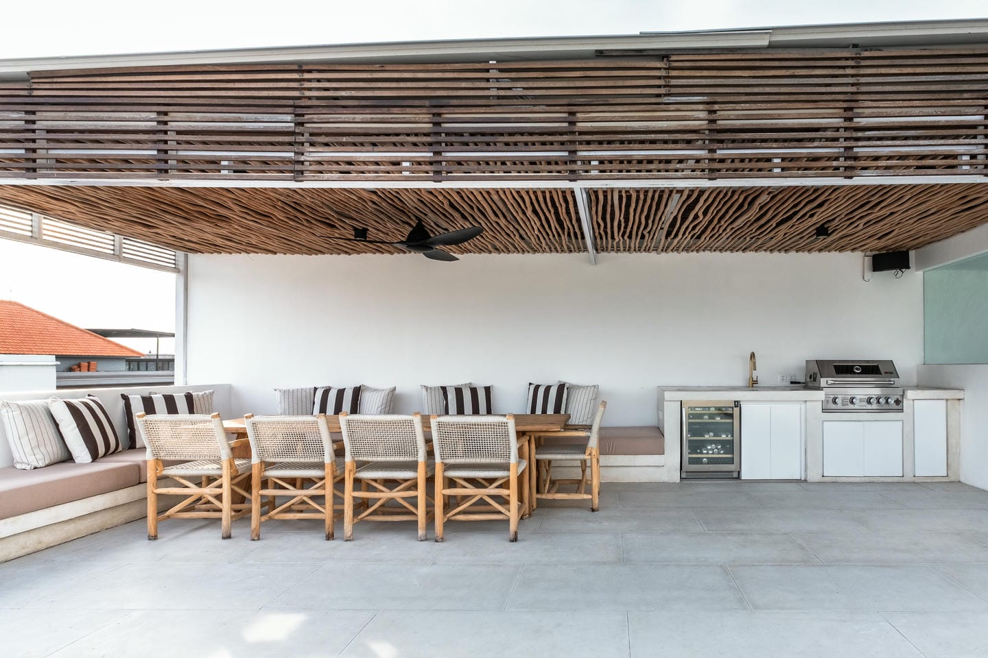 On the rooftop, the villa features a second pool along with a spacious entertainment area designed for relaxing and hosting gatherings. This rooftop space is equipped with a gas BBQ and a wine fridge, making it perfect for enjoying sunset drinks, casual dining, and memorable moments with family and friends.