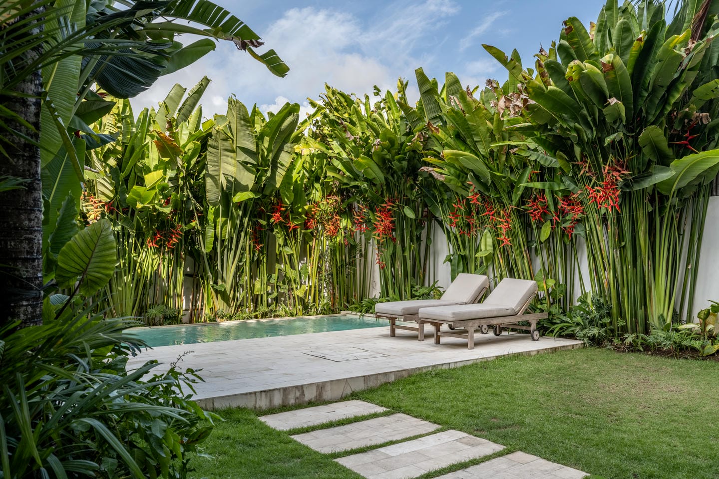 Tranquil backyard with pool and tropical plants.