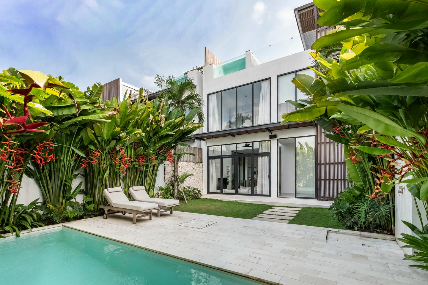 Modern villa with pool and sun loungers.