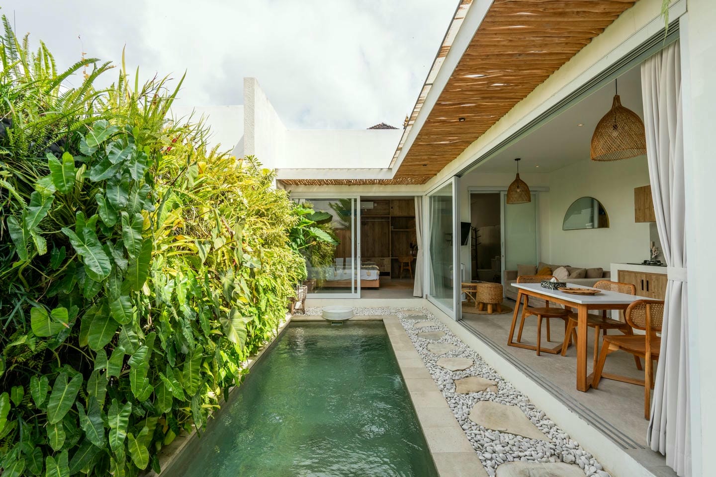 Outside, the villa features a small garden and a refreshing pool, offering a tranquil space to relax and enjoy the outdoors