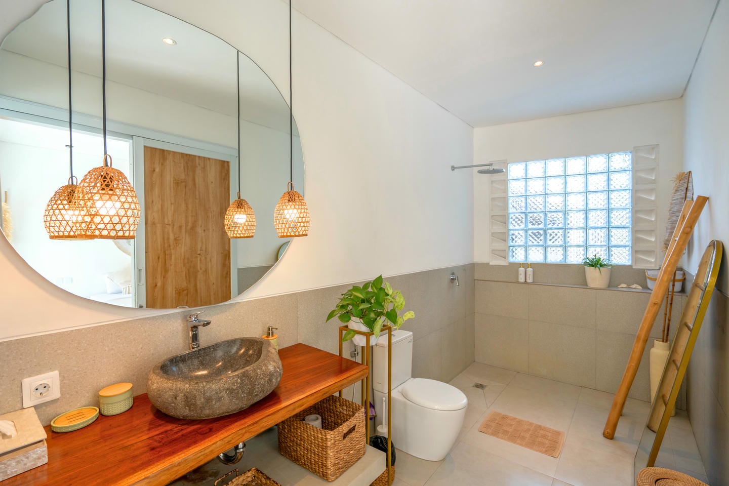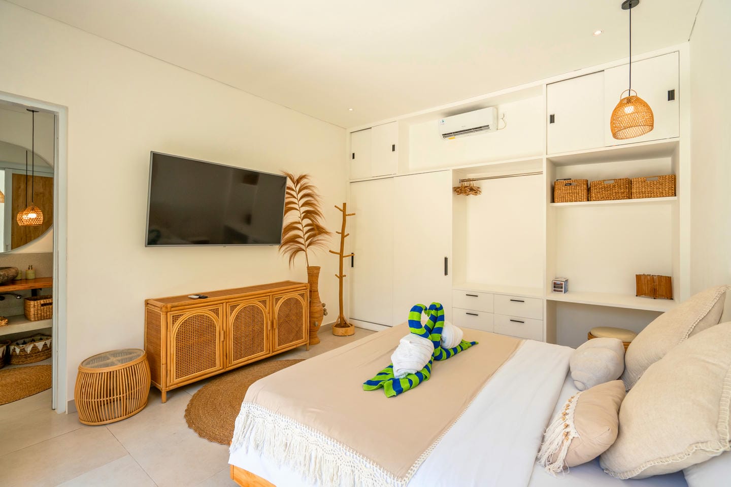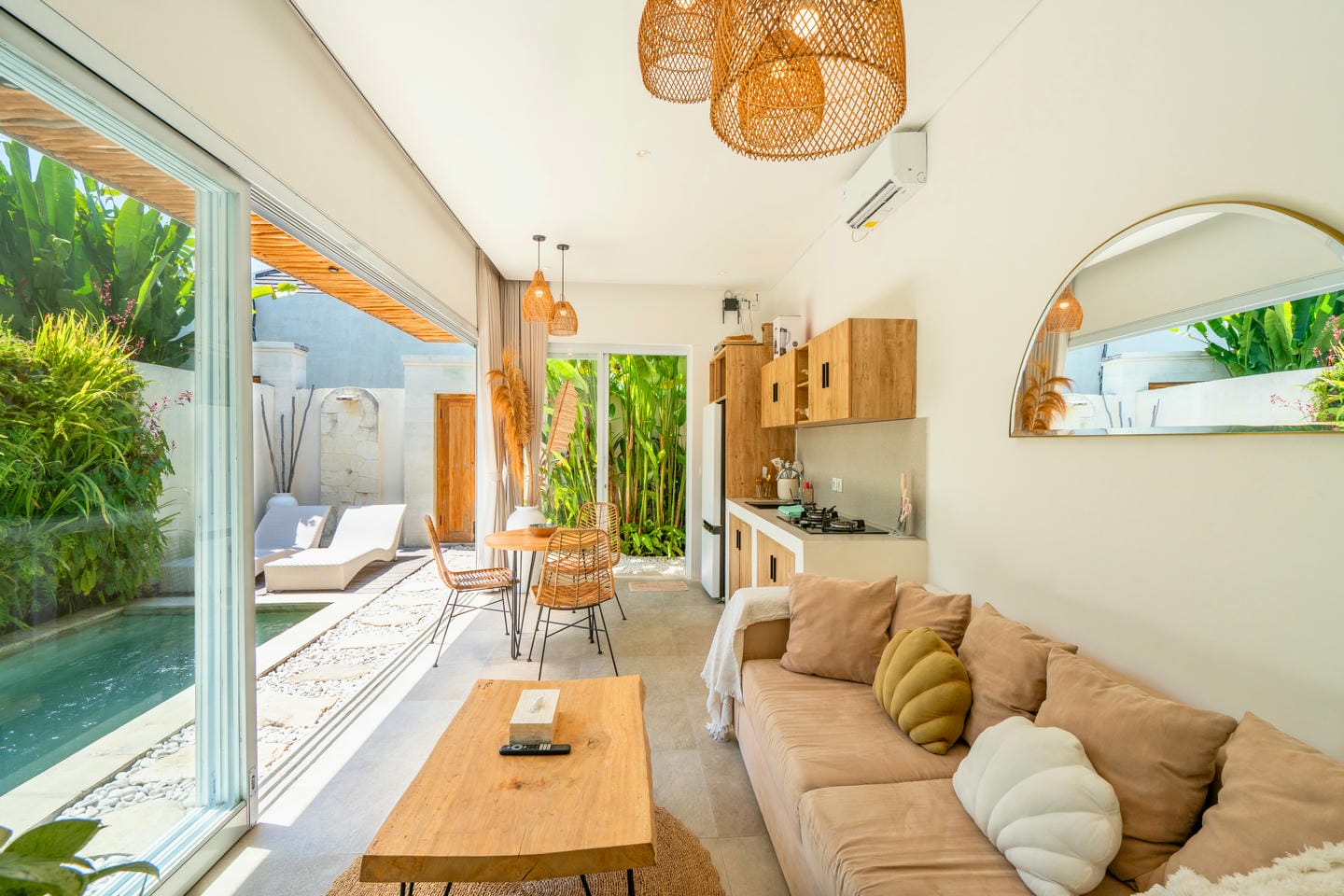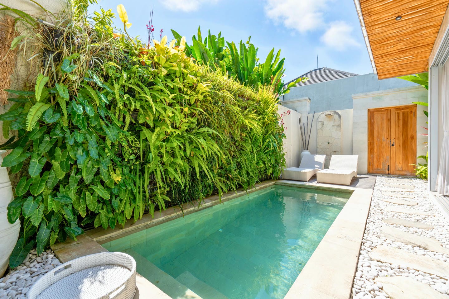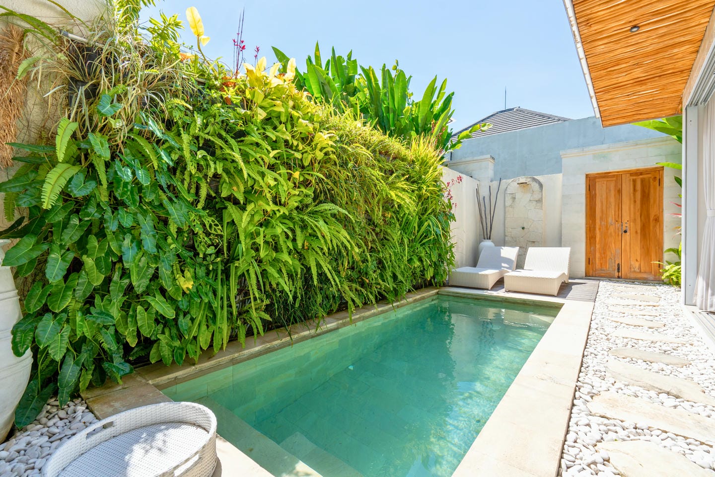Head out to the villa’s serene outdoor area, complete with a private swimming pool and soft bean bags for lounging. An outdoor shower adds convenience, while vibrant tropical plants on the walls enhance the tranquil, garden-like ambiance. It’s the perfect spot to relax, soak up the sun, and enjoy a peaceful day outdoors.